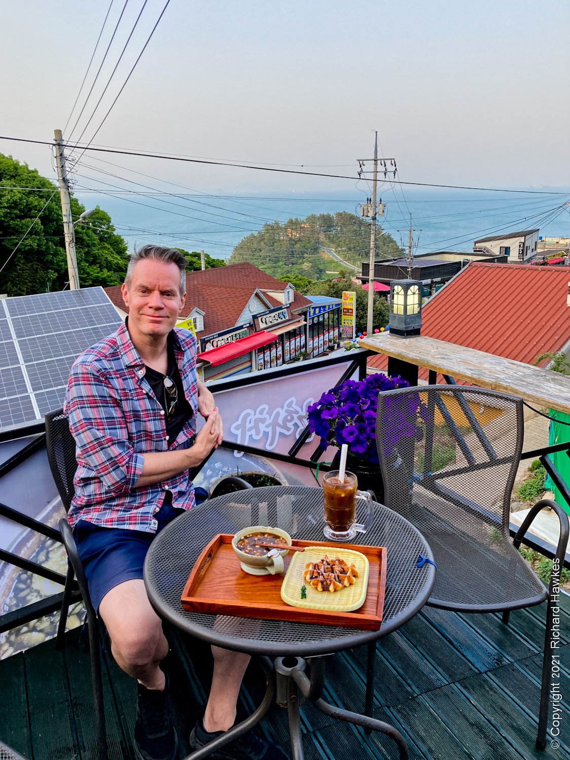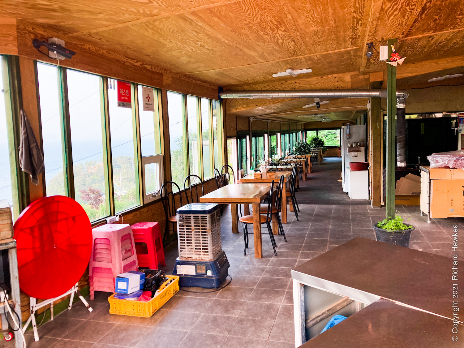 Finally, the exit down a road to the restaurants. We found a cafe with a terrace and had some jujube tea and waffles. The place was Green Na Rae (그린나래까페).
