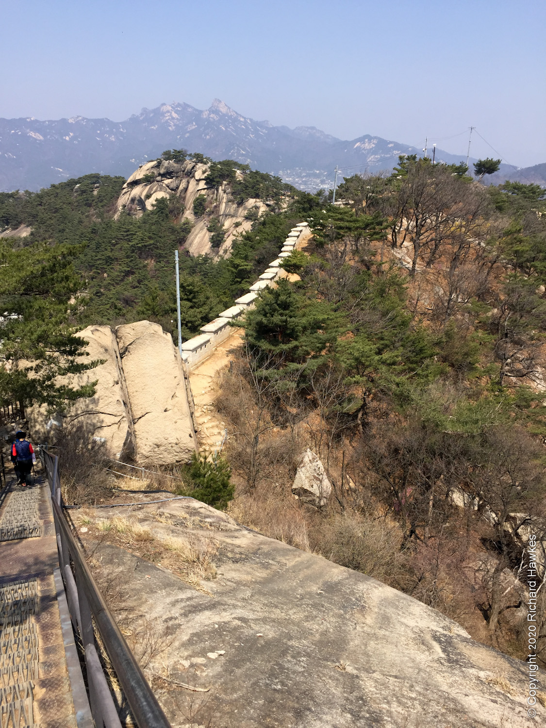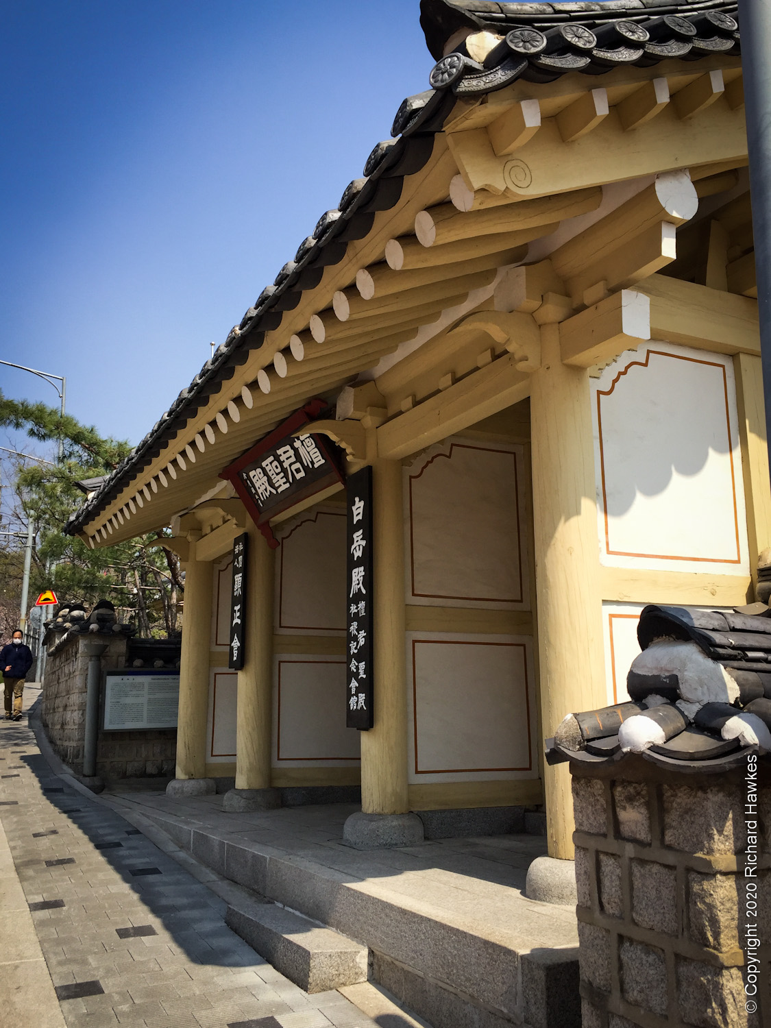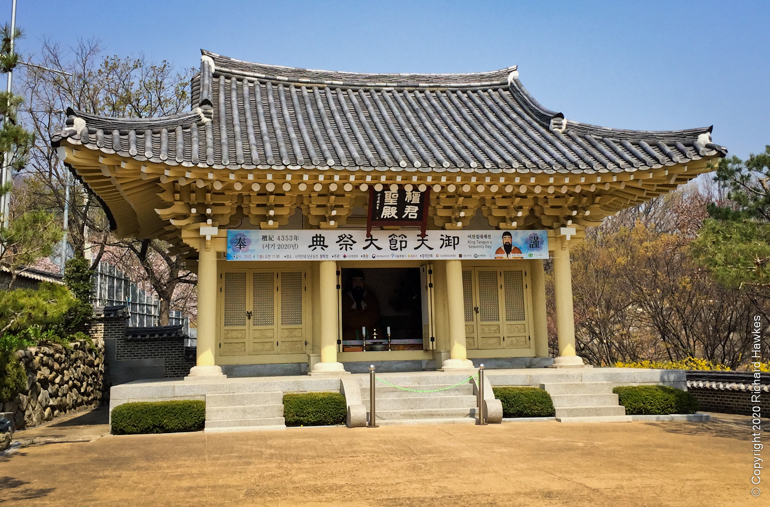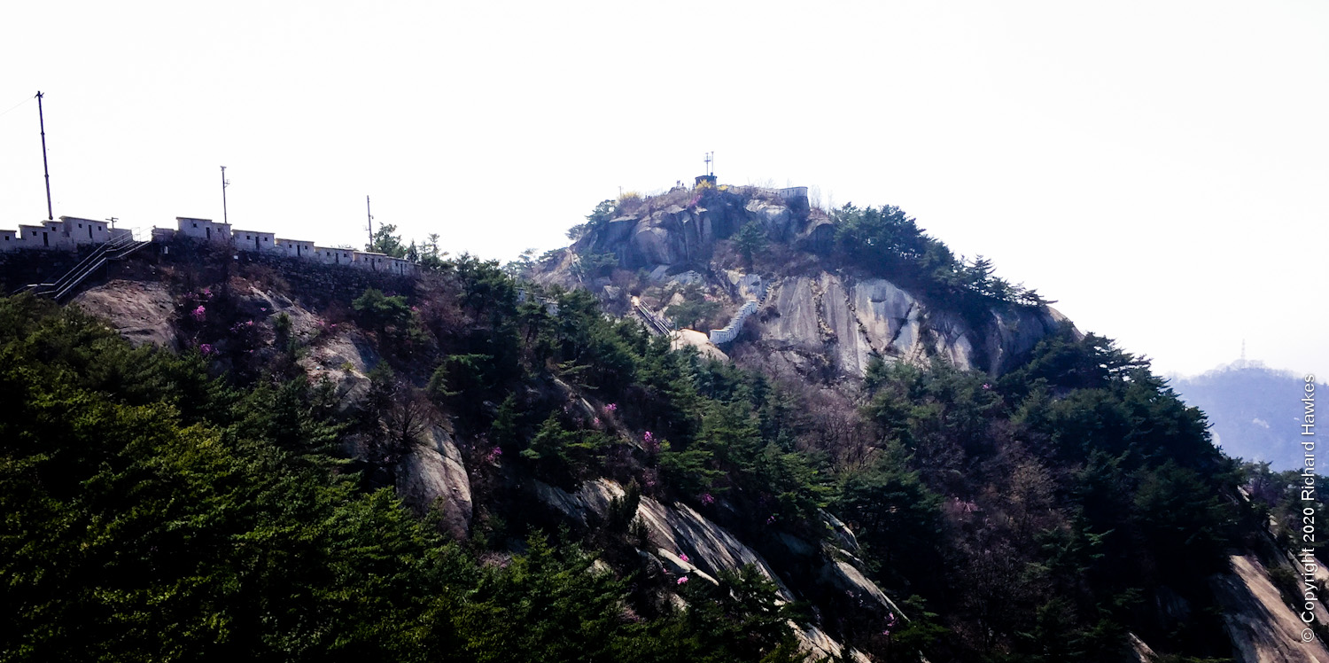 I was up here very recently, but wanted to try a different way up. I walked to the road that runs to the east of the mountain, a place I’ve been to before when the mountain path was closed once. It’s a lovely walk with lots of side trails and parks. There was also a lot of blossom out so I made a note to bring Romana here soon. After stopping to get pizza for late breakfast, I stopped by a temple or shrine dedicated to king Dangun. The temple was very yellow, unusual in my opinion. Nearby was a very Narnia / Addams Family looking wall and gate.