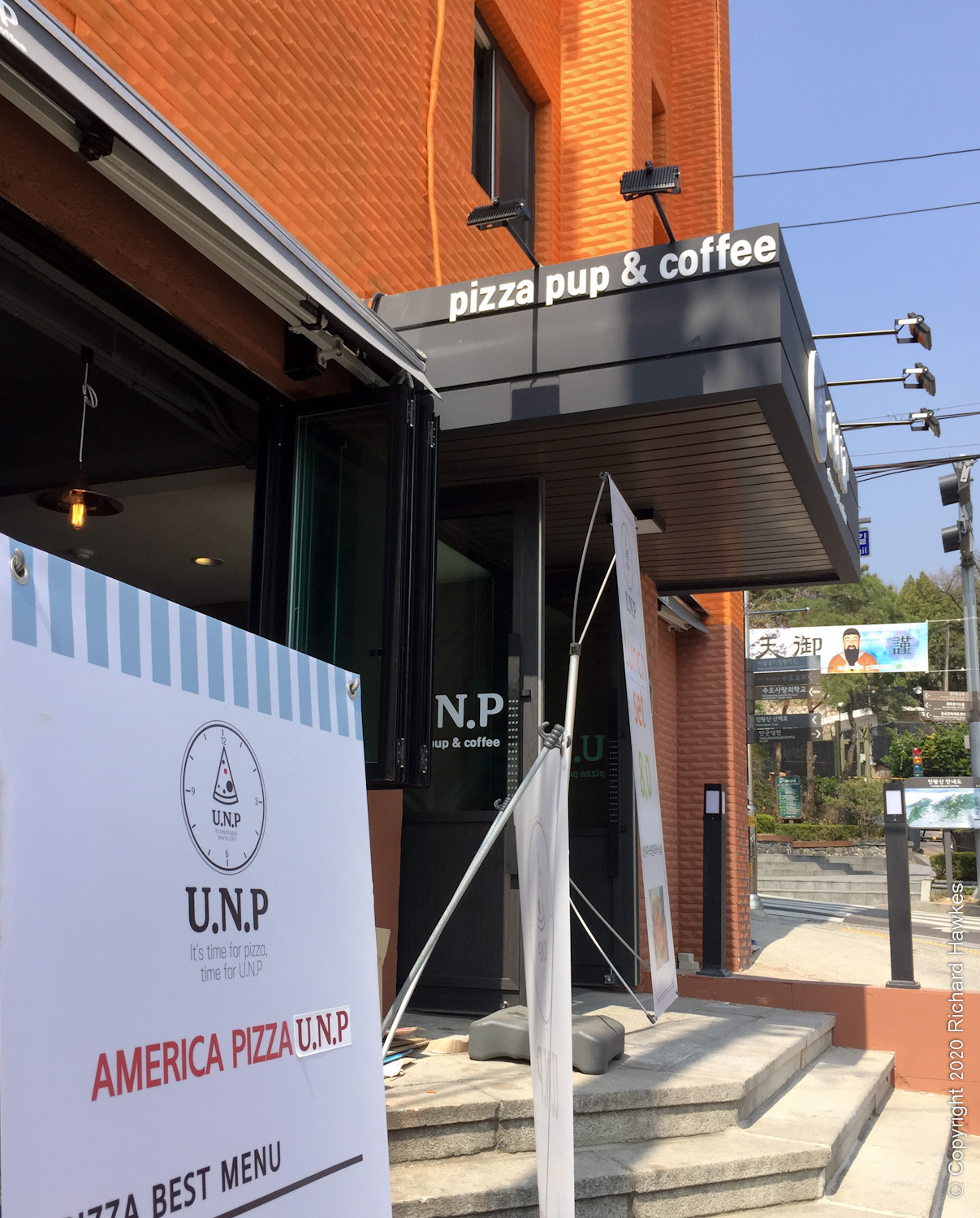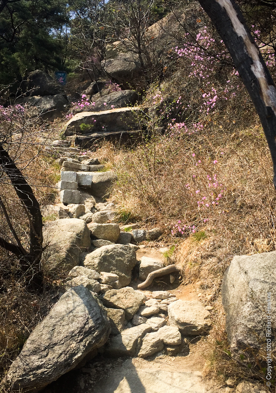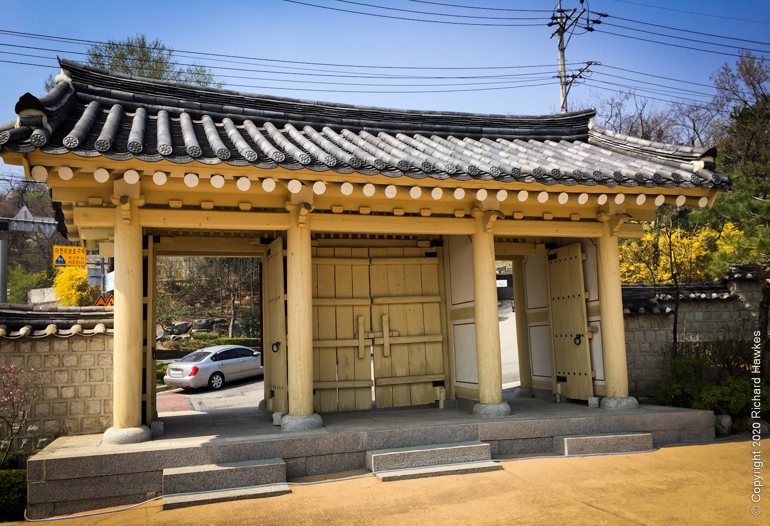 I was up here very recently, but wanted to try a different way up. I walked to the road that runs to the east of the mountain, a place I’ve been to before when the mountain path was closed once. It’s a lovely walk with lots of side trails and parks. There was also a lot of blossom out so I made a note to bring Romana here soon. After stopping to get pizza for late breakfast, I stopped by a temple or shrine dedicated to king Dangun. The temple was very yellow, unusual in my opinion. Nearby was a very Narnia / Addams Family looking wall and gate.