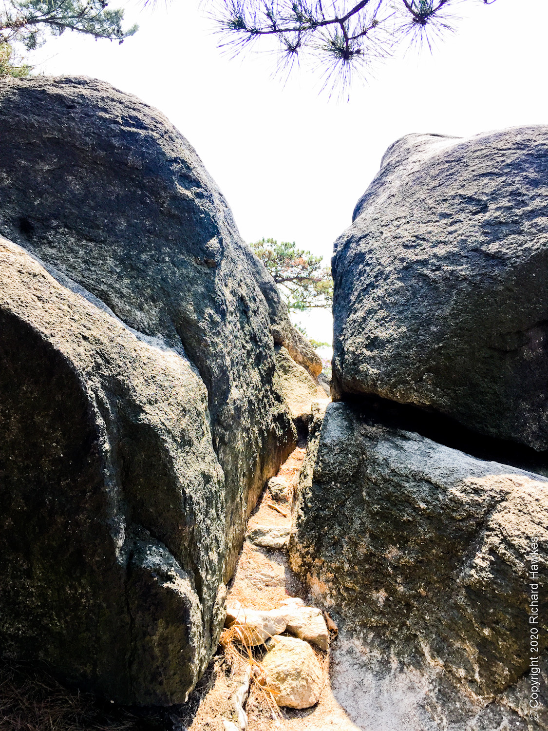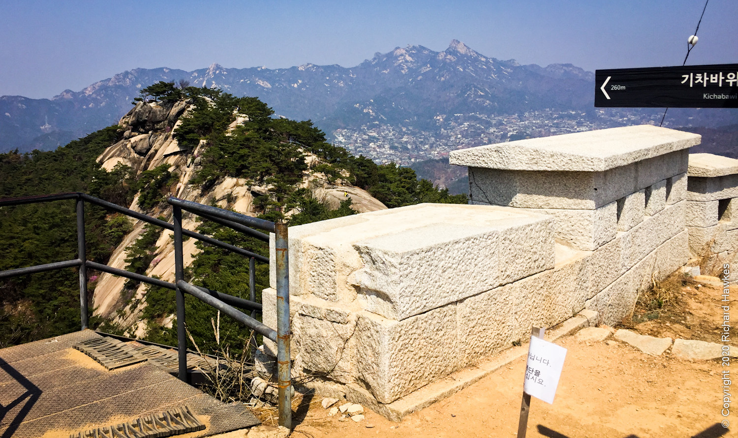 I started up to the peak encountering quite a few people on the way; I guess everyone is trying to social-distance by heading out…and encountering lots of people with the same idea… The rock steps were in bad repair but usable with care. It was hard work too but quicker that following the wall trail up. I got to the peak, had a rest then headed down to the place to turn off to Gicha Rock.