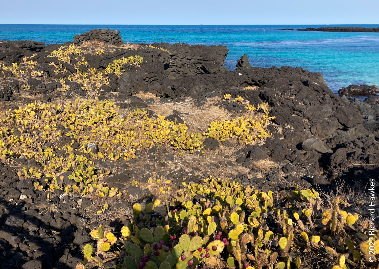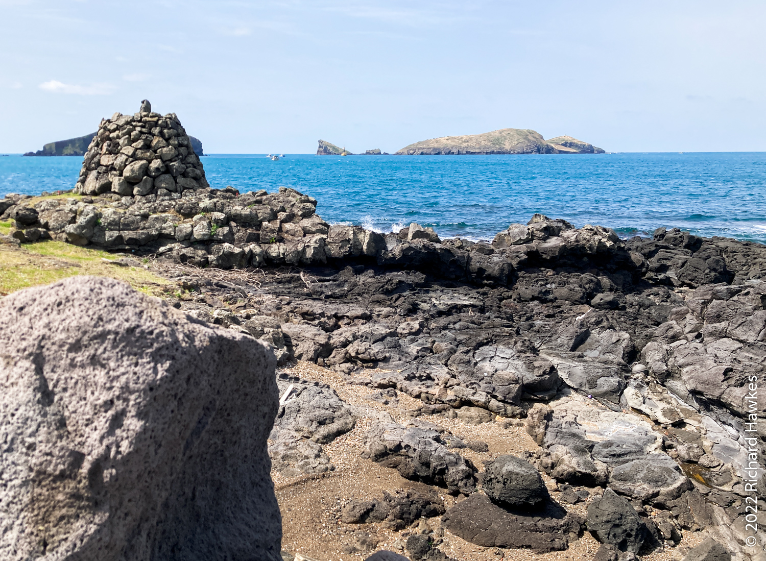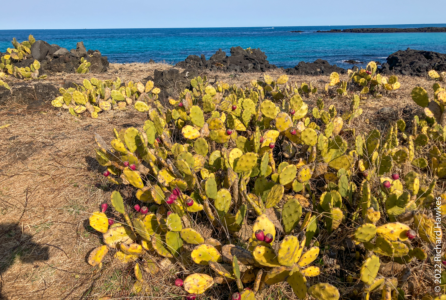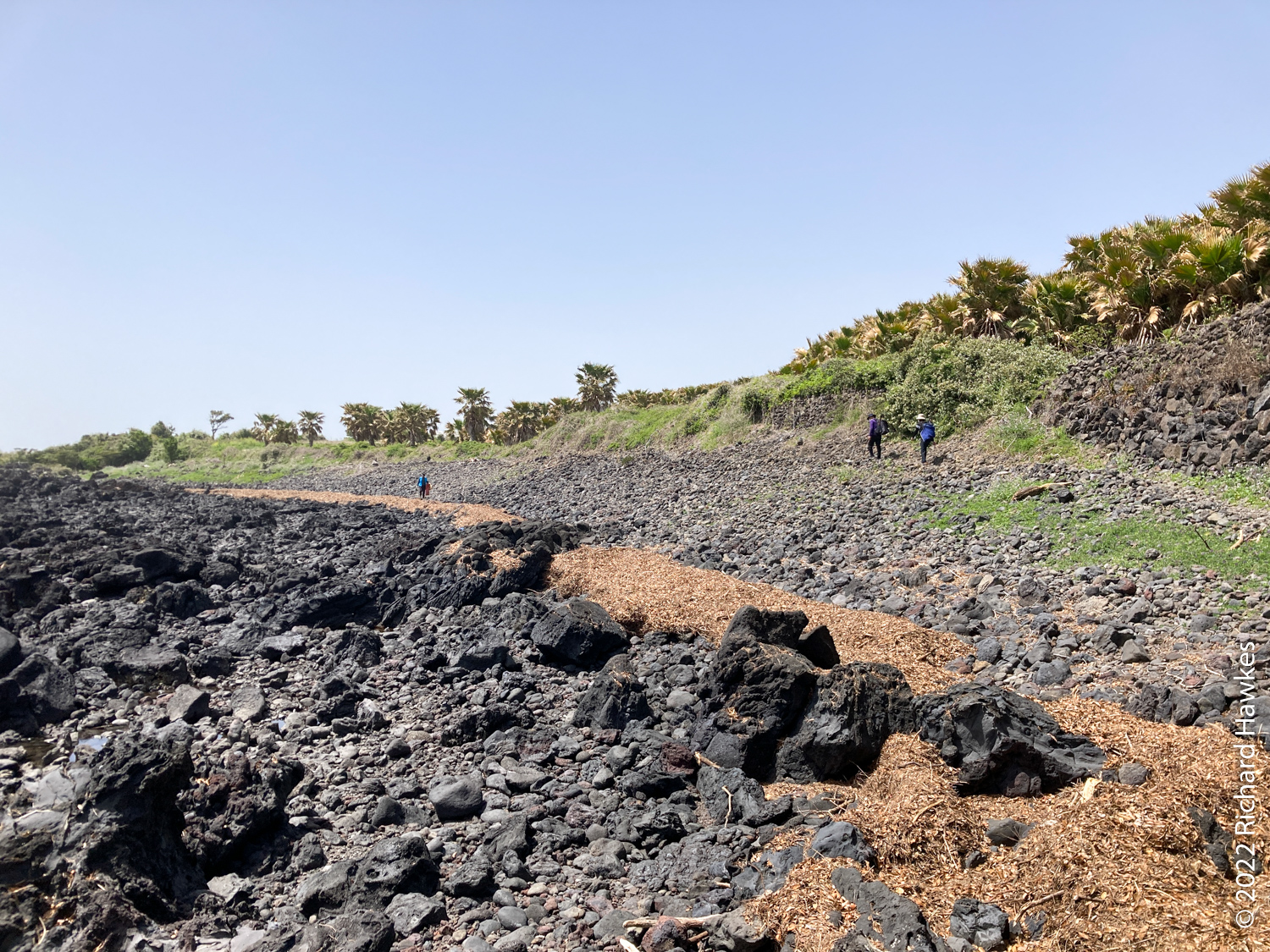 We started along the coast in the very pleasant weather and made our way south. There were beautiful black rock beaches, then beautiful sandy beaches, followed by more black rock beaches. The sea was very clear and inviting, even though it was too chilly too take a dip. We passed Hyeopjae Beach, a place I’d visited in 2019 ; like last time, it was covered to protect it in the winter season. After some more rocky terrain, we walked into a cactus colony area; blue sea, green cactus and black rock!
