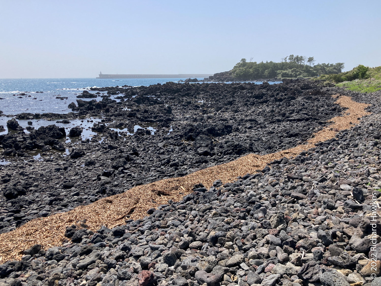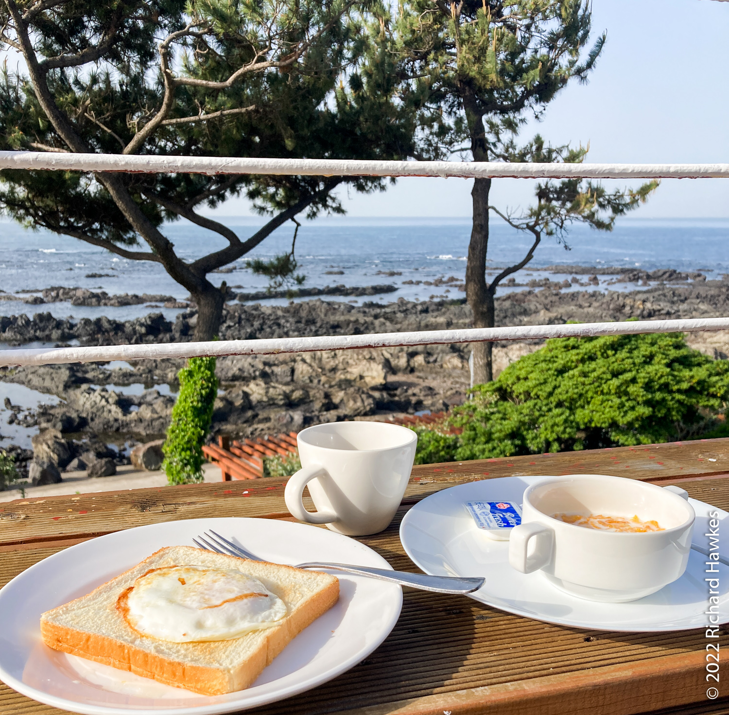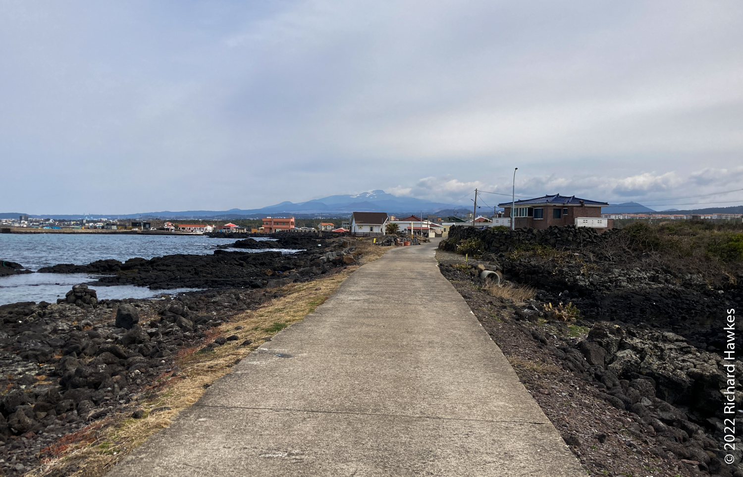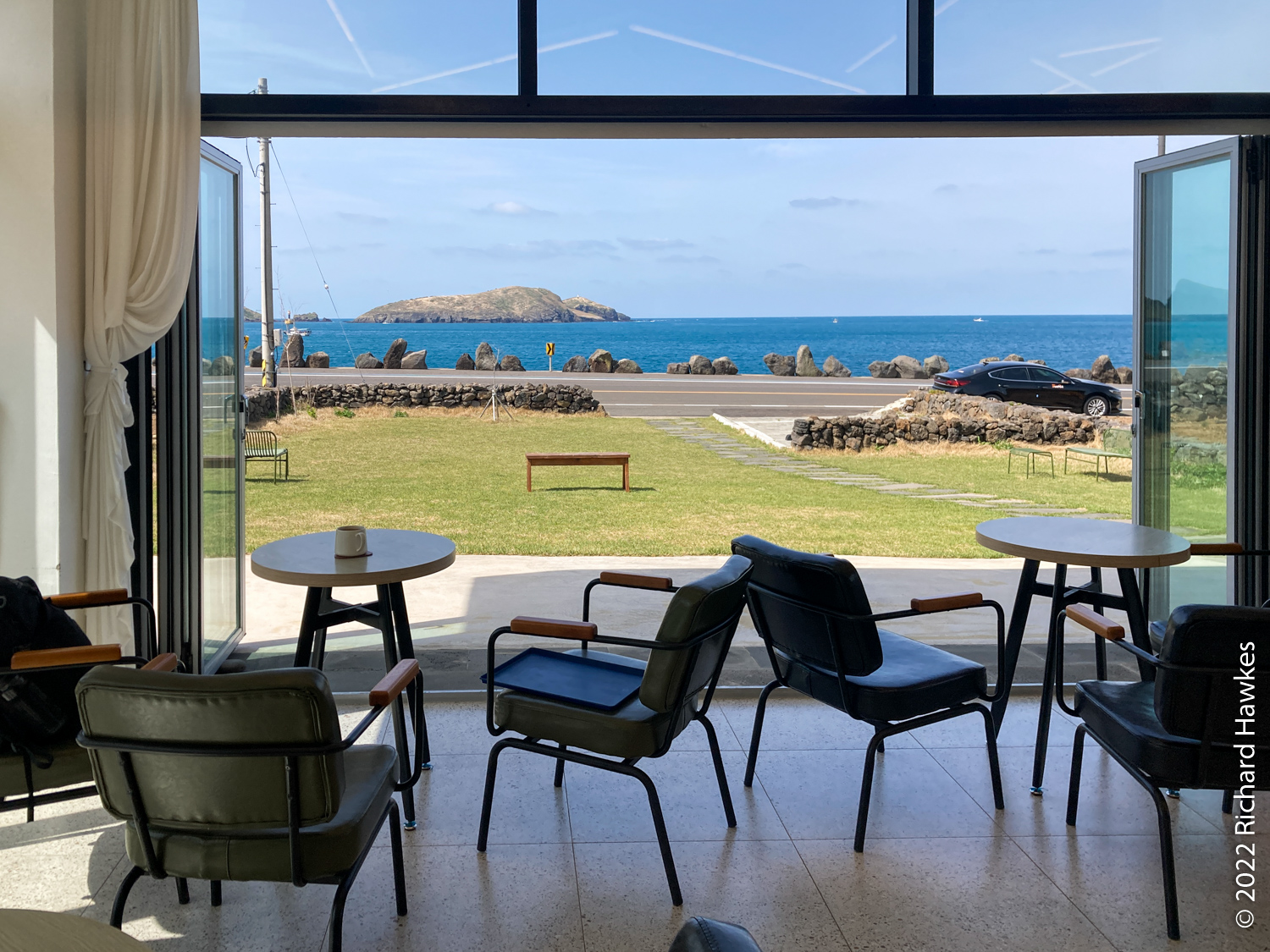First day on the island for this 4-day trip. I got straight off the plane and onto the 8:40 102 bus to the south west of Jeju, then another bus a few kilometres up to Yongsu-hang harbour (용수항) the starting point of trail 12. I stopped at Bean2020 for a coffee (카페 빈2020). Good coffee and great location. I was too early for their homemade scones, sadly. There’s a rooftop looking out to the sea.