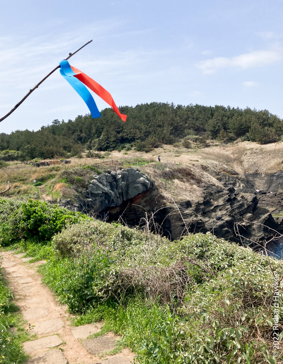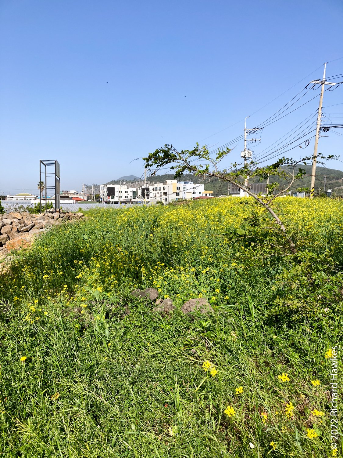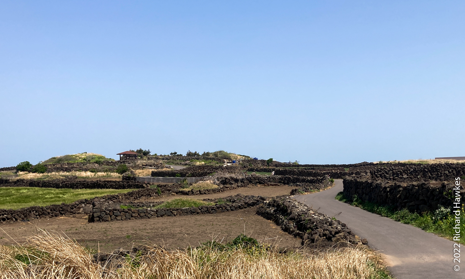 There was a lot of forest and rocky coast, very beautiful and a bit hilly. I was taking a break about every hour or so. The trail turned inland a bit and through farmland that contained a few historical sites related to the occupation of Korea, WWII, and the aftermath; there was an Imperial Japanese airfield with bunkers and aircraft hangers. There was also the site of the place where the UN forces had buried the residents of Jeju killed by them during the Jeju uprising.