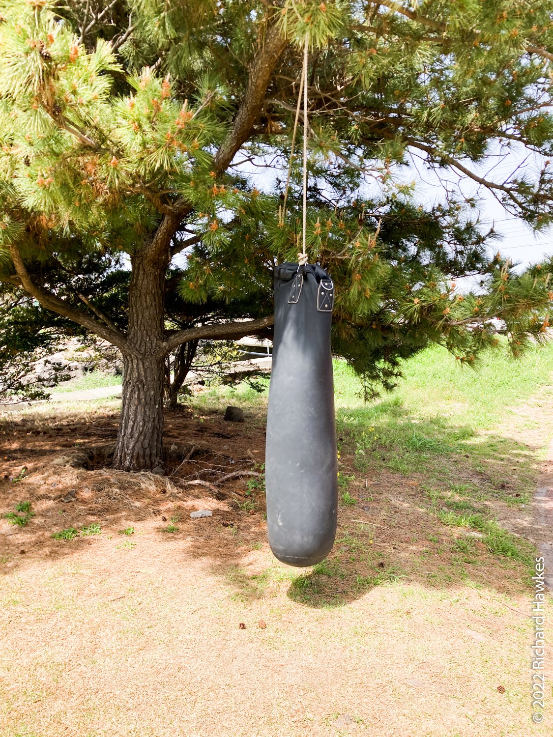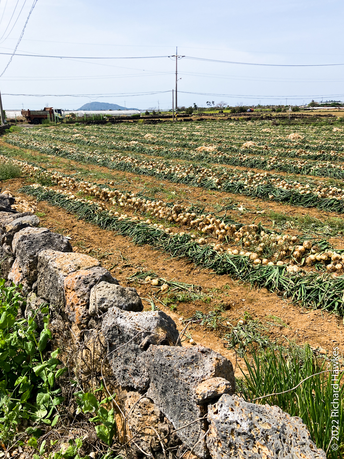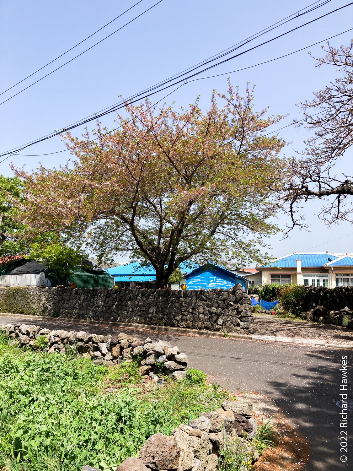 There was a lot of forest and rocky coast, very beautiful and a bit hilly. I was taking a break about every hour or so. The trail turned inland a bit and through farmland that contained a few historical sites related to the occupation of Korea, WWII, and the aftermath; there was an Imperial Japanese airfield with bunkers and aircraft hangers. There was also the site of the place where the UN forces had buried the residents of Jeju killed by them during the Jeju uprising.