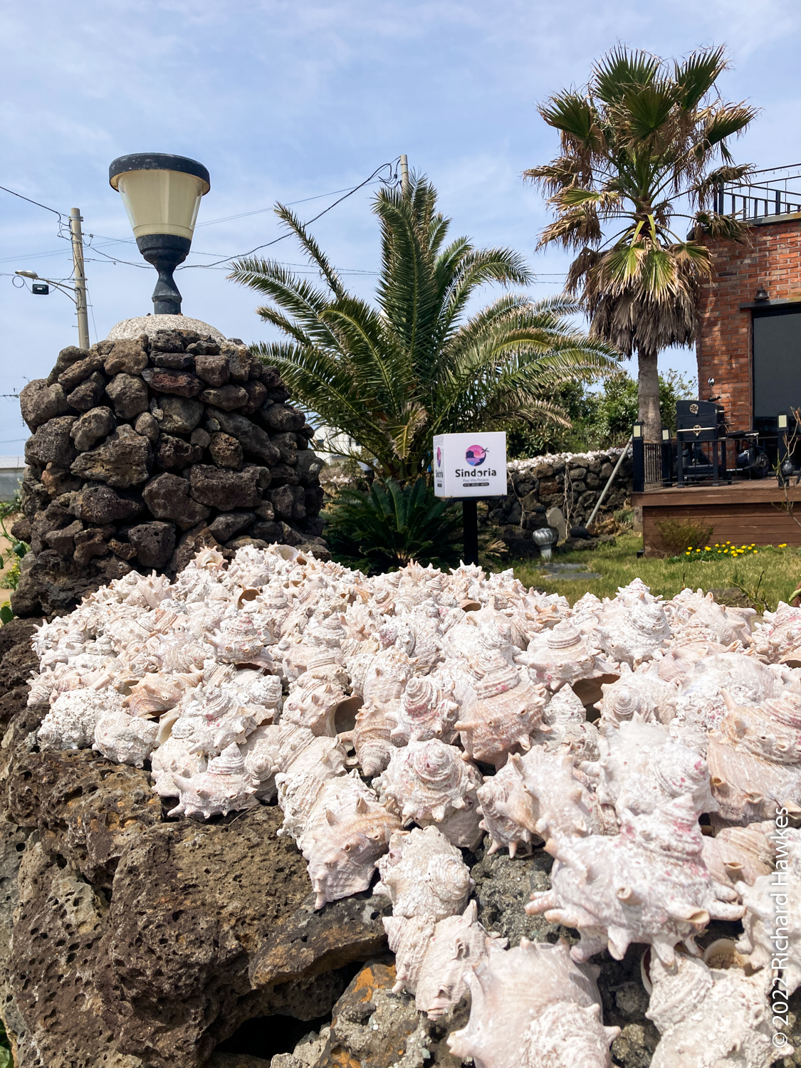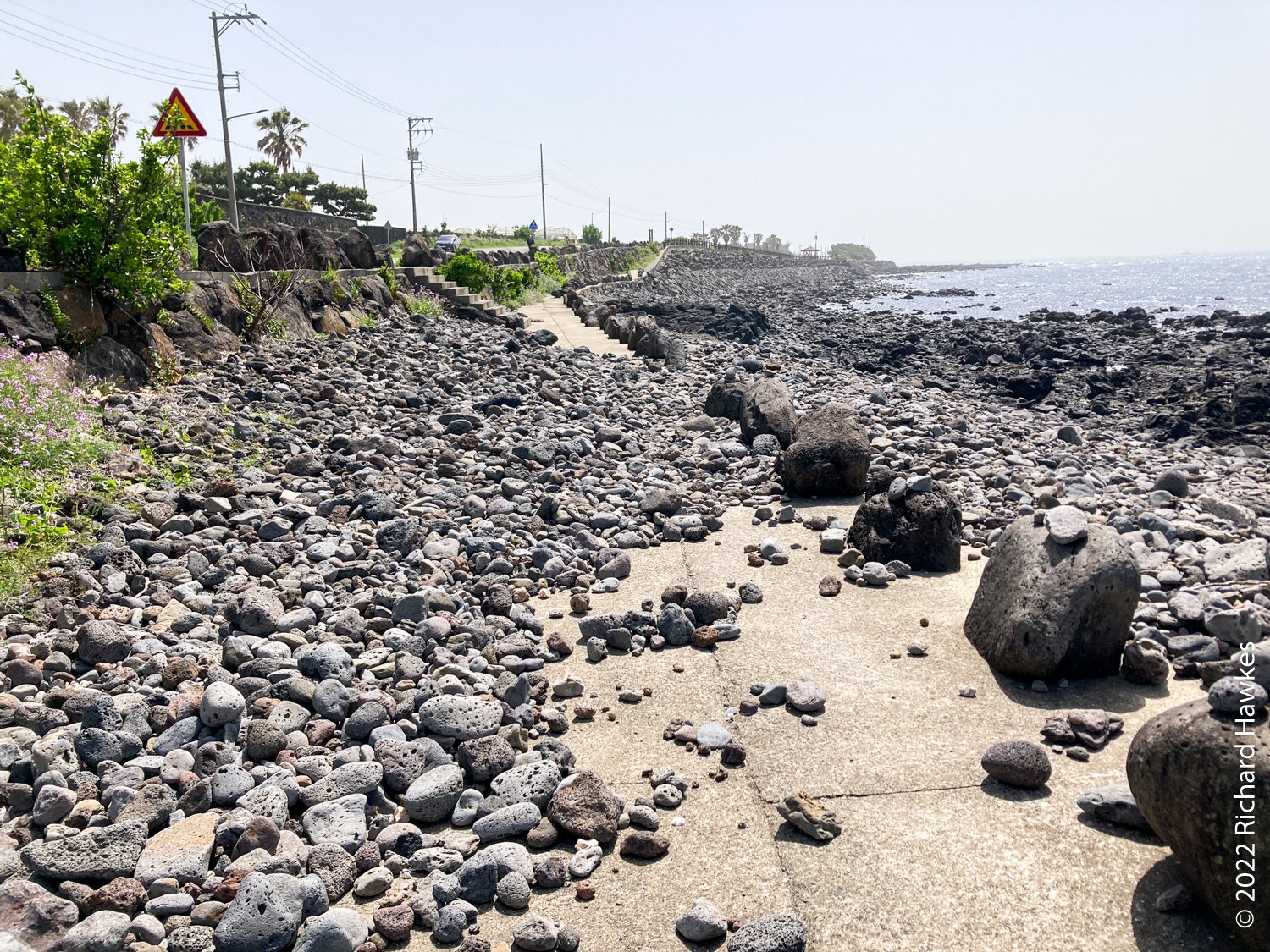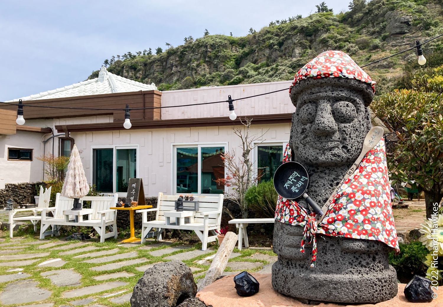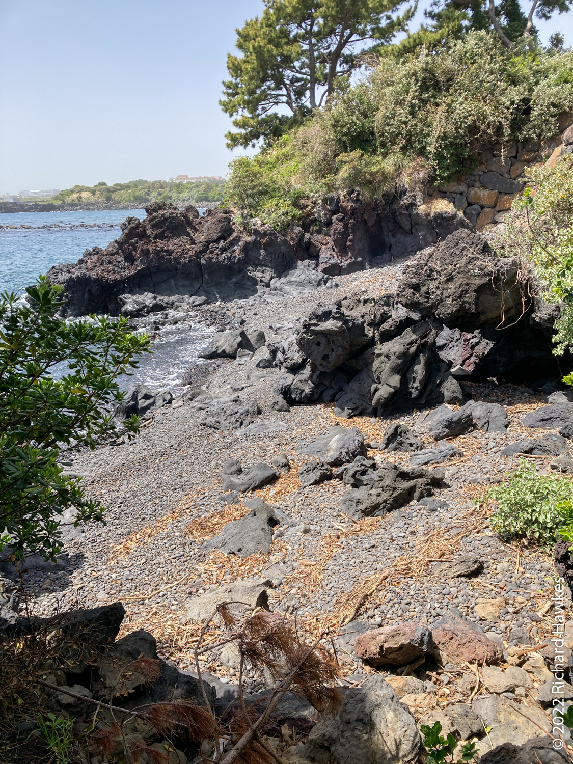 Eventually I was back to the coastline with lots of dramatic looking black rock beaches. The trail was rocky and slow-going here. I found a nice shady half cave on the beach for a snack stop. Back on road and into a tourist area with seafront properties. I passed a modern haenyeo area (the women diver fishers of Jeju), then I stopped at a coffee shop called Bunker House for a coffee and small pastry.