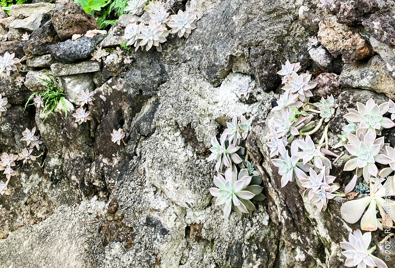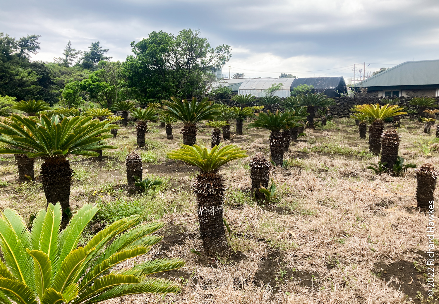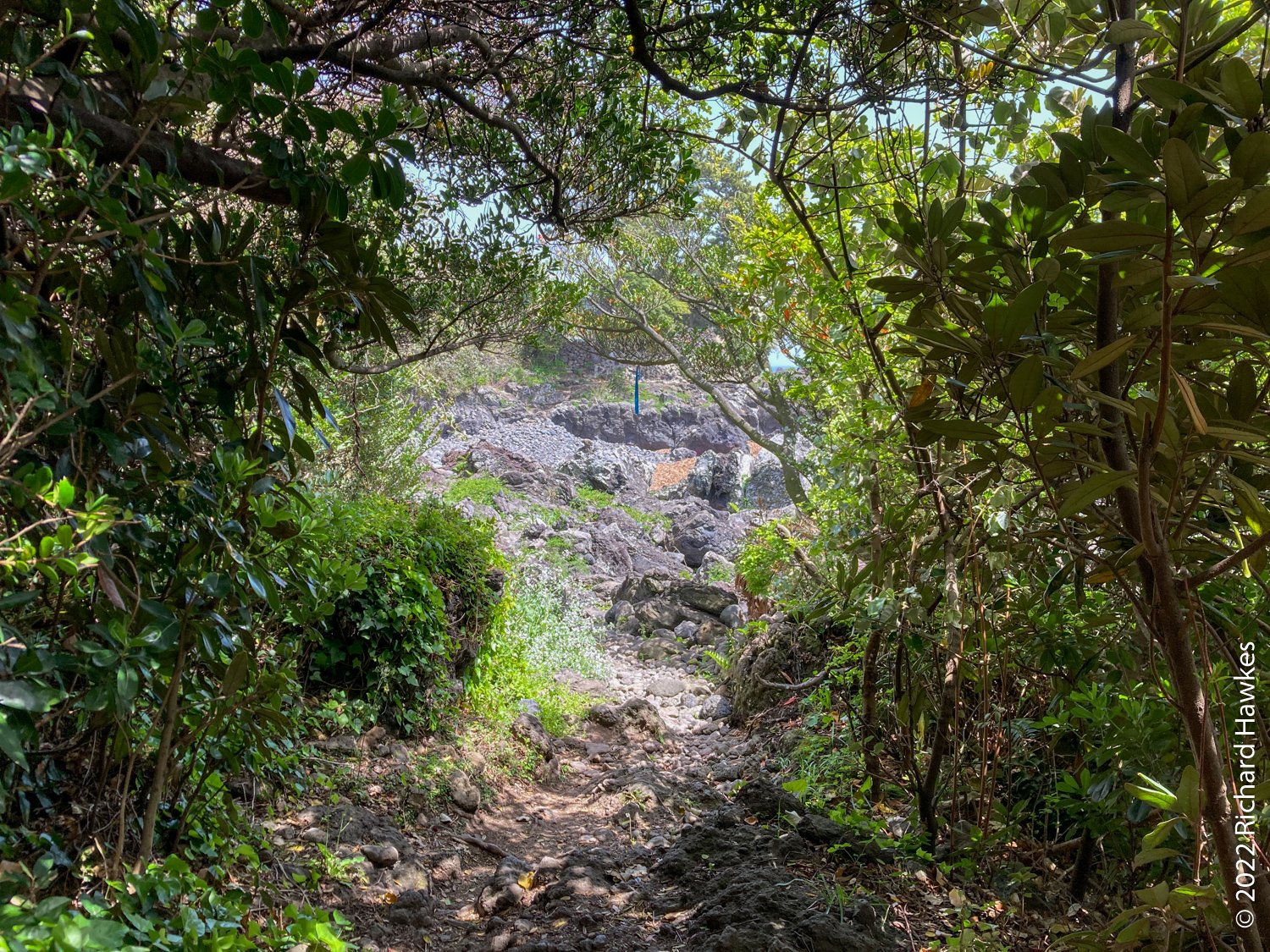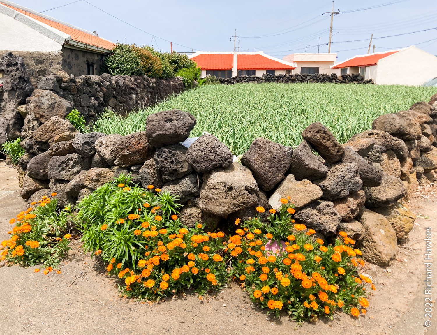 Some of the flowers on the roadside were spectacularly red and yellow, like fire; I’d not seen anything like it. The trail took me through village roads and past plenty of farm growing cabbage. I walked up Mundoji Oreum (문도지오름) for some views of the plains, then into the Mureung Gotjawal Forest (곶자왈). It was a dark forest in places, supposed to be sub-tropical. The trail was volcanic rock and quite uneven, so care was needed. Through some gates, I encountered three ponies strolling along. I had to wait for a space to pass them as they were walking in my direction.