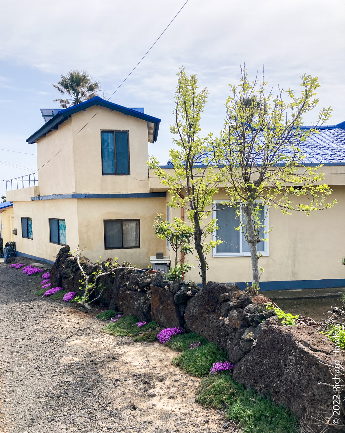This was actually the end of trail 6 and I’d made good time (about four hours with stops). I now had to walk four more km to get to my guesthouse in the village of Wimi (위미). The trail went inland and through mandarin farmland with views north to Hallasan. A farmer called to me, asked where I was from, then handed me three mandarins from his farm; great! Back to the coast and past a cafe I’d visited with Romana in 2020, and then into Wimi, a small harbour town. Since I was going to be hiking up Hallasan the next morning, I looked for supplies. I got breads at the local supermarket and some freshly made kimbab from another store. Then I checked into Wimi With Me Guesthouse (위미위드미 게스트하우스), a set of refurbished cottage buildings with a small garden.
