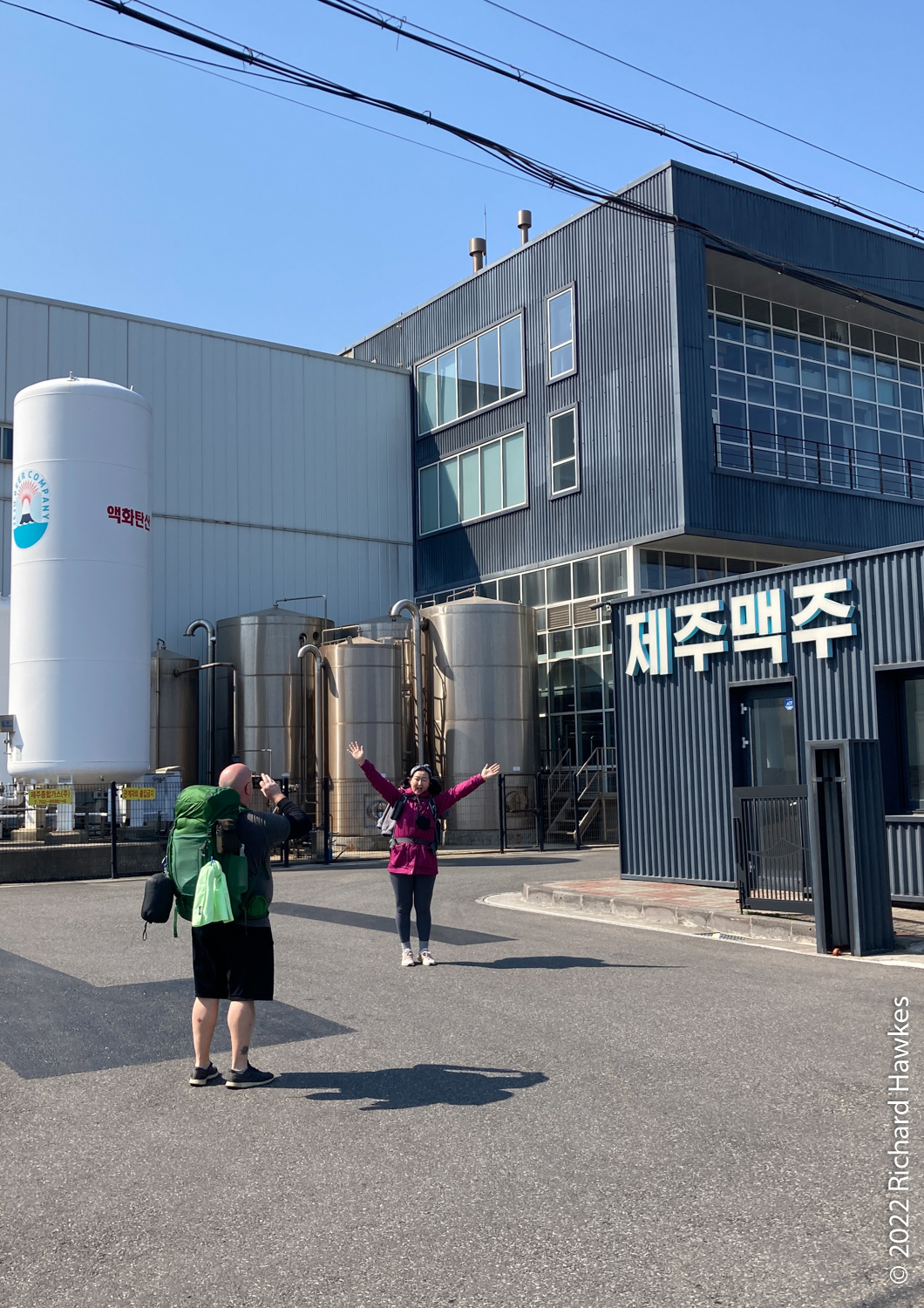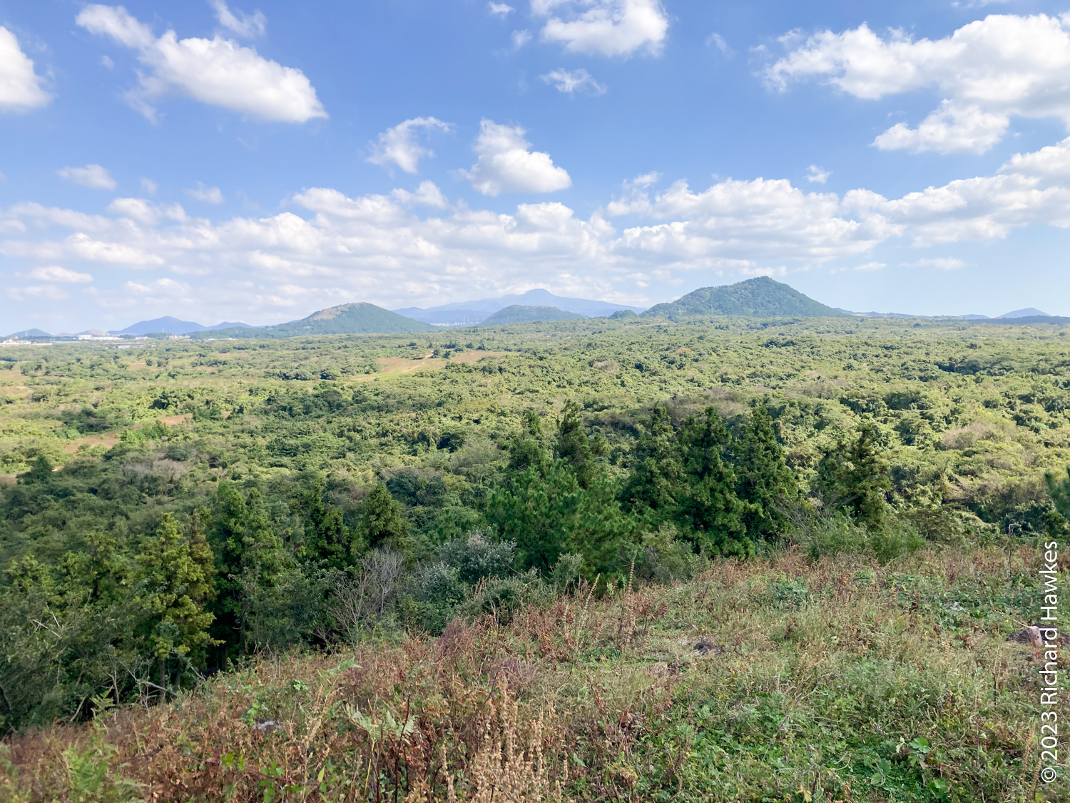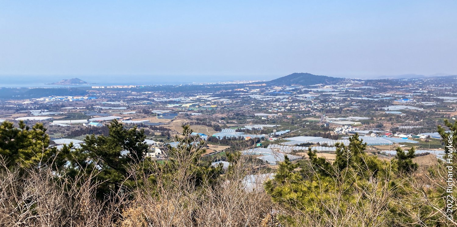 March 8th: The breakfast at the hotel was pretty naff, not what I’d expected for the 60,000 won I’d paid for the night! We were on the road by 9:30 and back with the black rocks and cactus colony. It is a very beautiful part of the trail. We turned inland and up some dry streams and wooded trails and past the Jeju Beer Brewery, unfortunately, closed till later today, so we didn’t hang around. We got to our next accommodation Oreum Pension (오름펜션). The owner was adamant about not letting us in early! While Bry and Sophie sat at the convenience store, I dumped my stuff and hiked up Jeoji Oreum. There were nice views from the top; I could even see our accommodation.