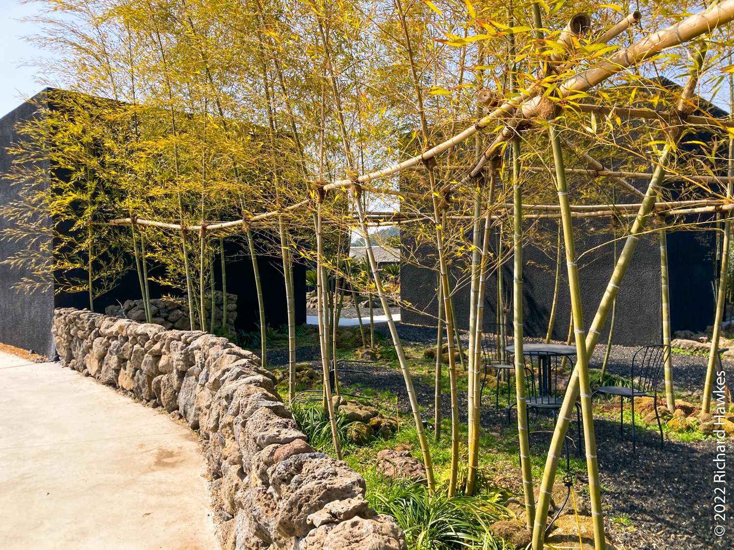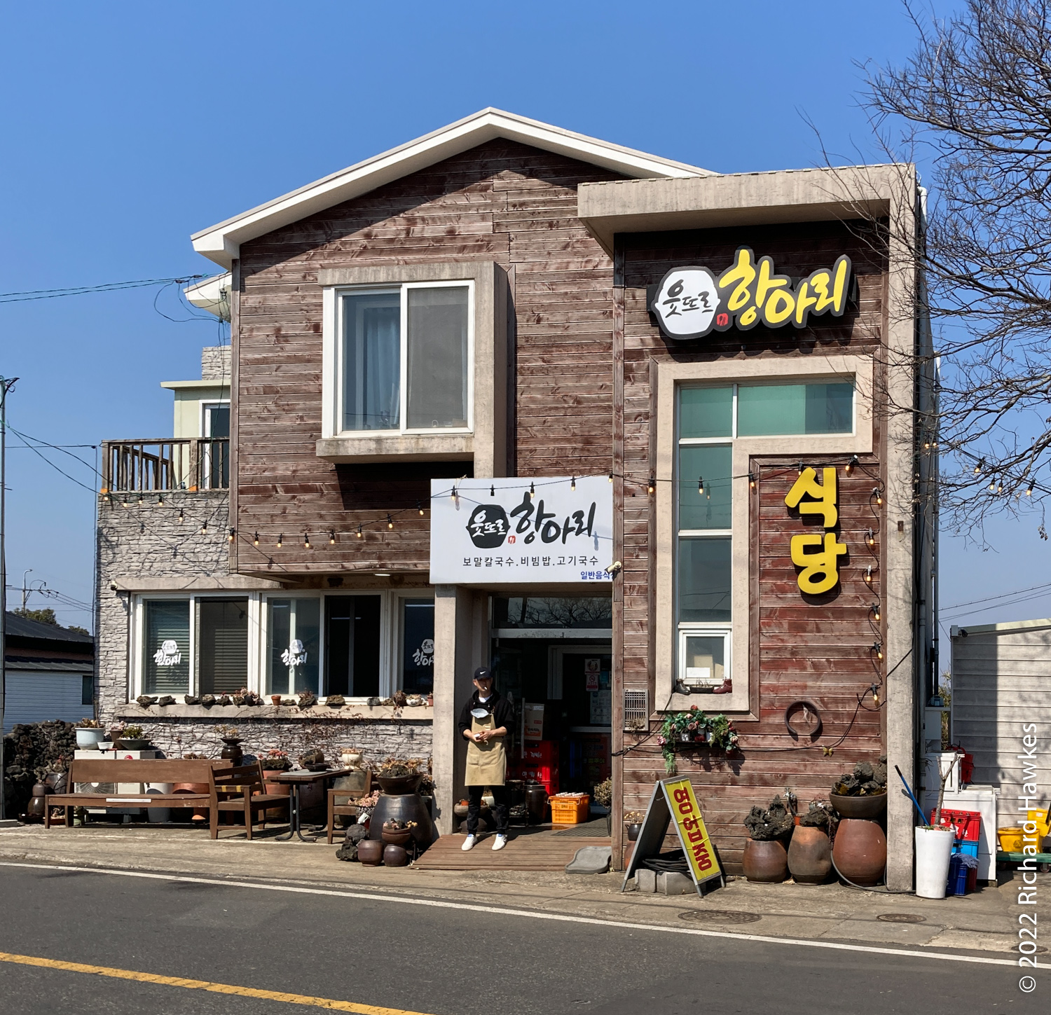 Out of the cafe and long more coast. There was more of the spectacular rocks and cliffs, and vast rocky pebble beaches. I passed tall hedgerows which I think were camelias and eventually got to Soesokkak Estuary (쇠소깍해변). I visited this place back in 2019 and it’s quite fun with canoes you can take up the volcanic river stream, and a black sandy beach. I had pork noodle soup at Jemini Guksu (제미니국수); delicious, and served by a robot server after ordering at a table kiosk!