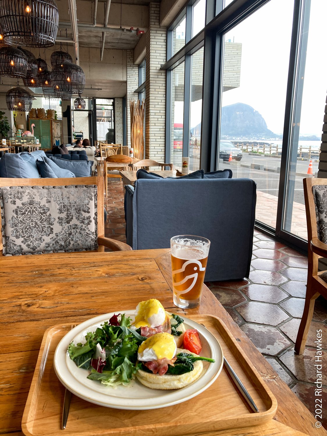 Later, I skipped the Songaksan outcrop or peninsula as I’d done it back in 2019. After walking a bit along the coast, I stopped off at Tropical Hideaway for eggs Benedict and another pint of Magpie. This place is accommodation with a cafe on the first floor with a view of the sea. I’ve had Sanbangsan in view most the time on this hike, slowly getting larger as I approached. There was more coastal walk along sand, rock, and both! There were clouds in the sky and I knew there might be a bit of rain later.