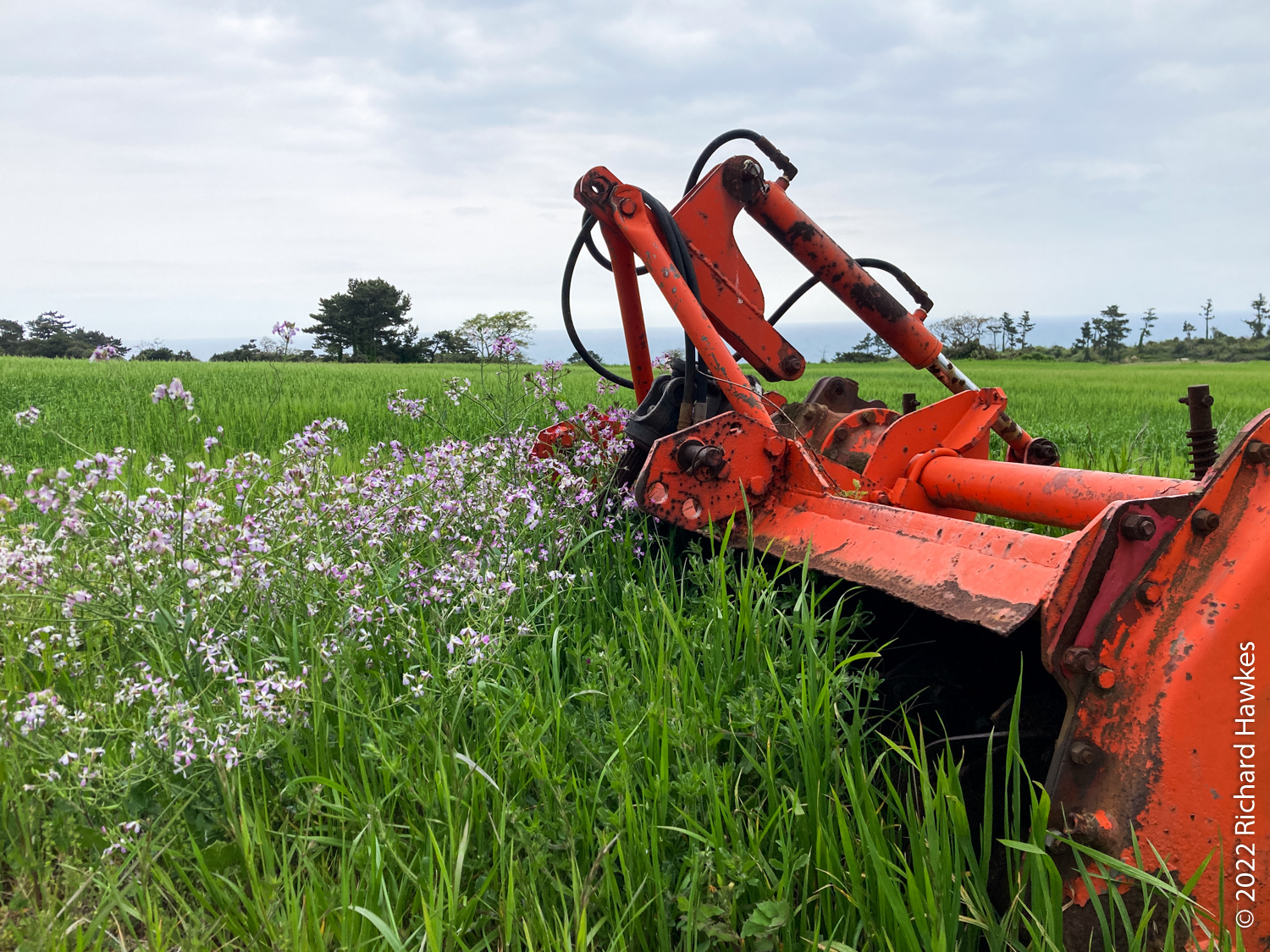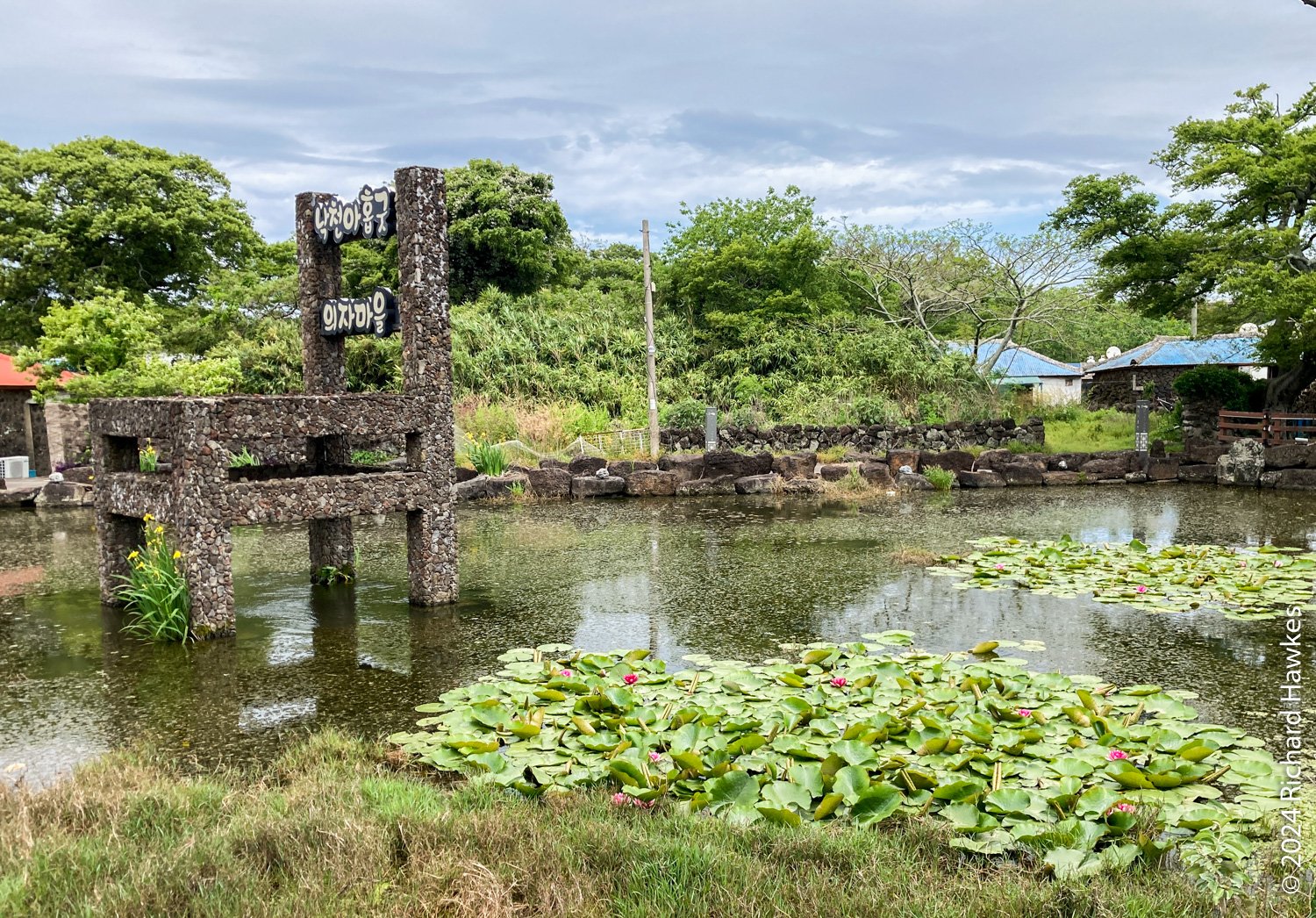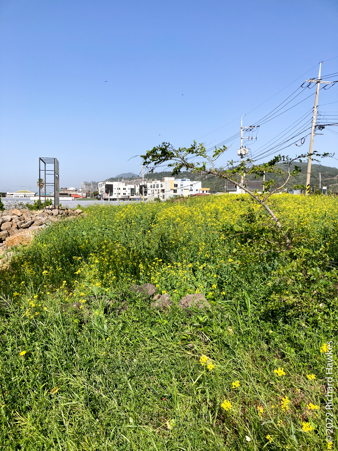 I went around Jeoji Oreum this time, rather than going up, as I’d done it before. This inland trail goes through a lot of farmland, the crops on this route seem to be barley and broccoli! The barley fields looked lovely and golden especially swaying in the gentle wind, similar to the landscape I’d seen on Gapado Island the day before while cycling route 10-1. I saw a group of harvesters packing up bags of huge broccoli into the back of a Bongo truck. We exchanged greetings. There were lots more golden fields, small forest and road trails. I saw an Olympic themed tower which I had to go up of course, plus the famous stone chair in a lily pond in one of the villages; I don’t know the significance of this attraction!