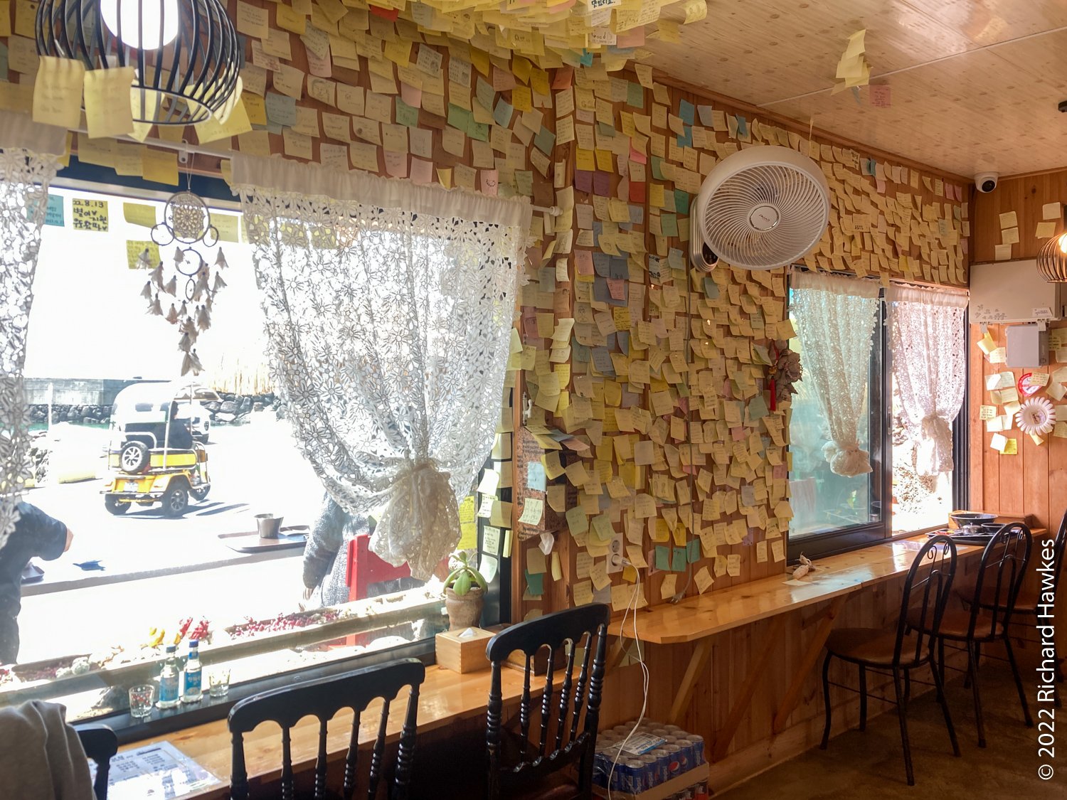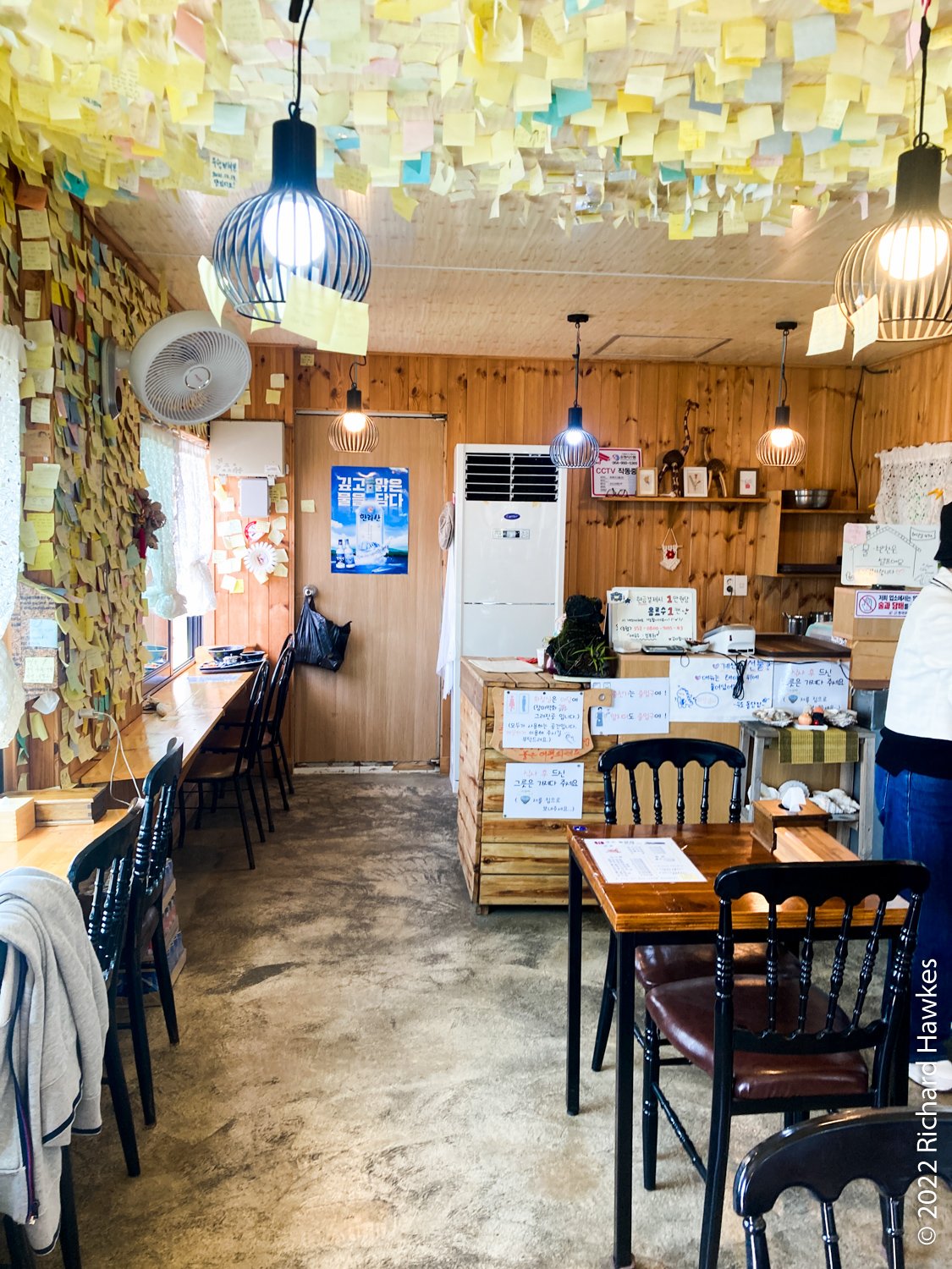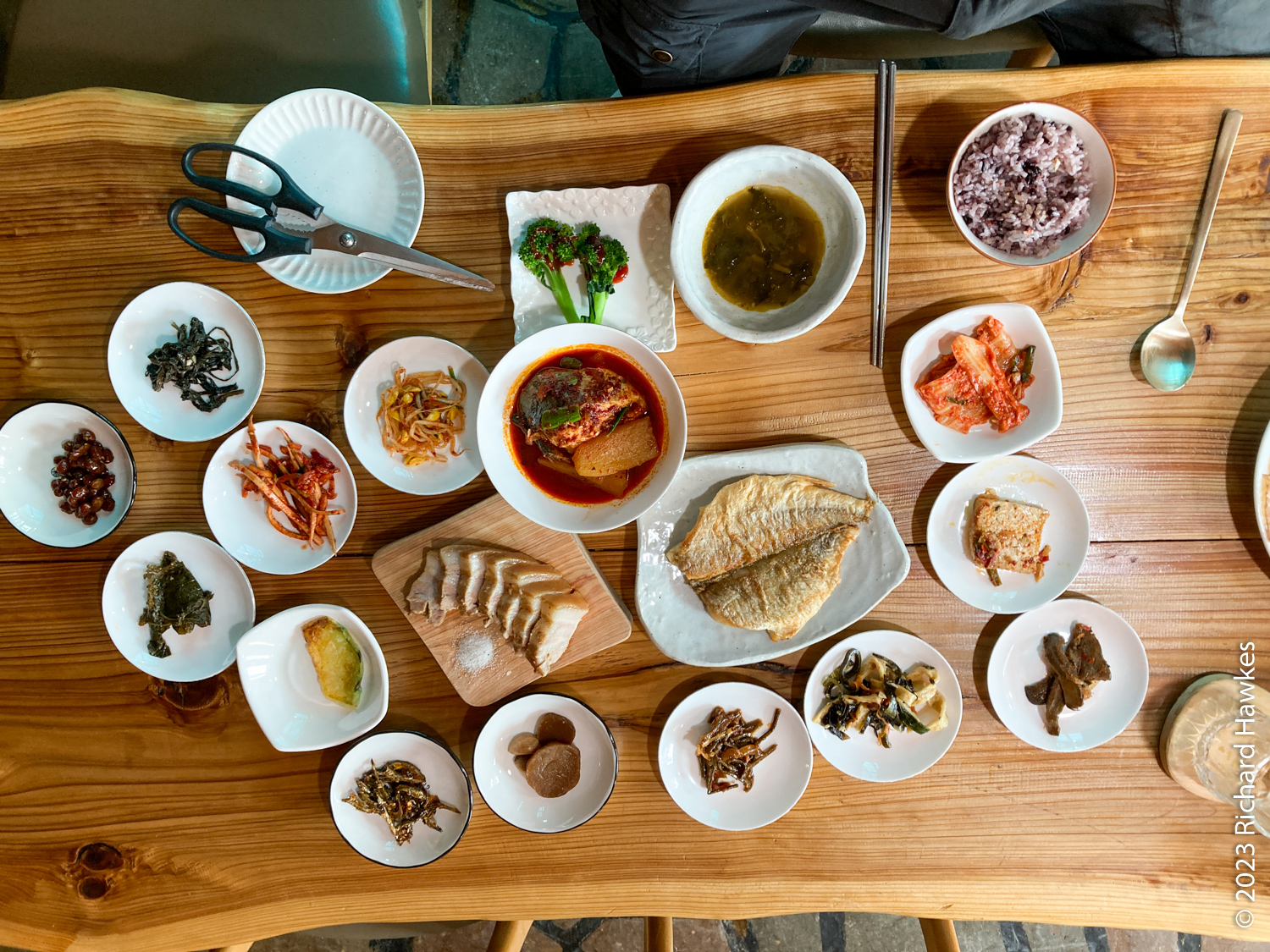 I’d been looking for a place to rest and eat. Most places on the map app were showing 11 am opening times, and it was still too early. At about 11, I walked into Mother Cafe. They seemed a bit surprised to see me. They said it’d be about 30 minutes to get the food ready. There wasn’t really a menu, but they said ‘baekpan’ meaning a basic Korean meal with lots of side dishes. I was expecting perhaps one main dish of grilled fish, but what eventually arrived on my table was huge! See the photo… There was no way I’d be eating all of this and felt guilty. I chose what to eat carefully, avoiding the spicy looking fish soup. However, everything on the table was delicious, obviously home cooked with care.