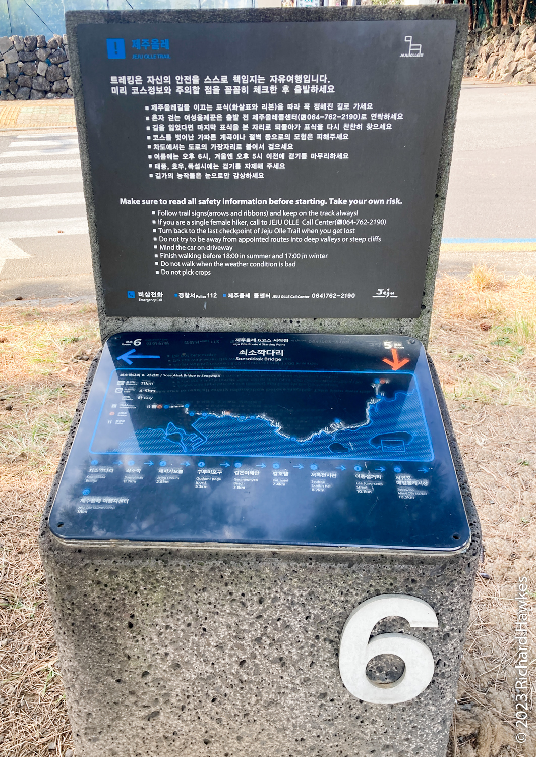 Second day on the island for this 4-day trip. Trail 6 took me east from Seogwipo to the village of Wimi. I was actually going to do Course 6, plus about 4 km of Course 5 in order to get to a good guesthouse. I had a coffee at Seom Guesthouse but they didn’t leave any bread out for breakfast. Another guest called the manager and they told him, “no, sorry, there’s no bread”. Huh… Fortunately, I’d bought a pastry the night before and had that with my coffee on the terrace. Very pleasant. I had some things to take care of before I started the trail; I’d planned to hike up the south west part of Hallasan Mountain the following day (Nov 25th). I’d booked a SOCAR to get there and I wanted to find the pick-up location so I didn’t waste time looking for it tomorrow. Anyway, found it, then the start of trail 6 and off I set! This was about 9:30, so a good start.