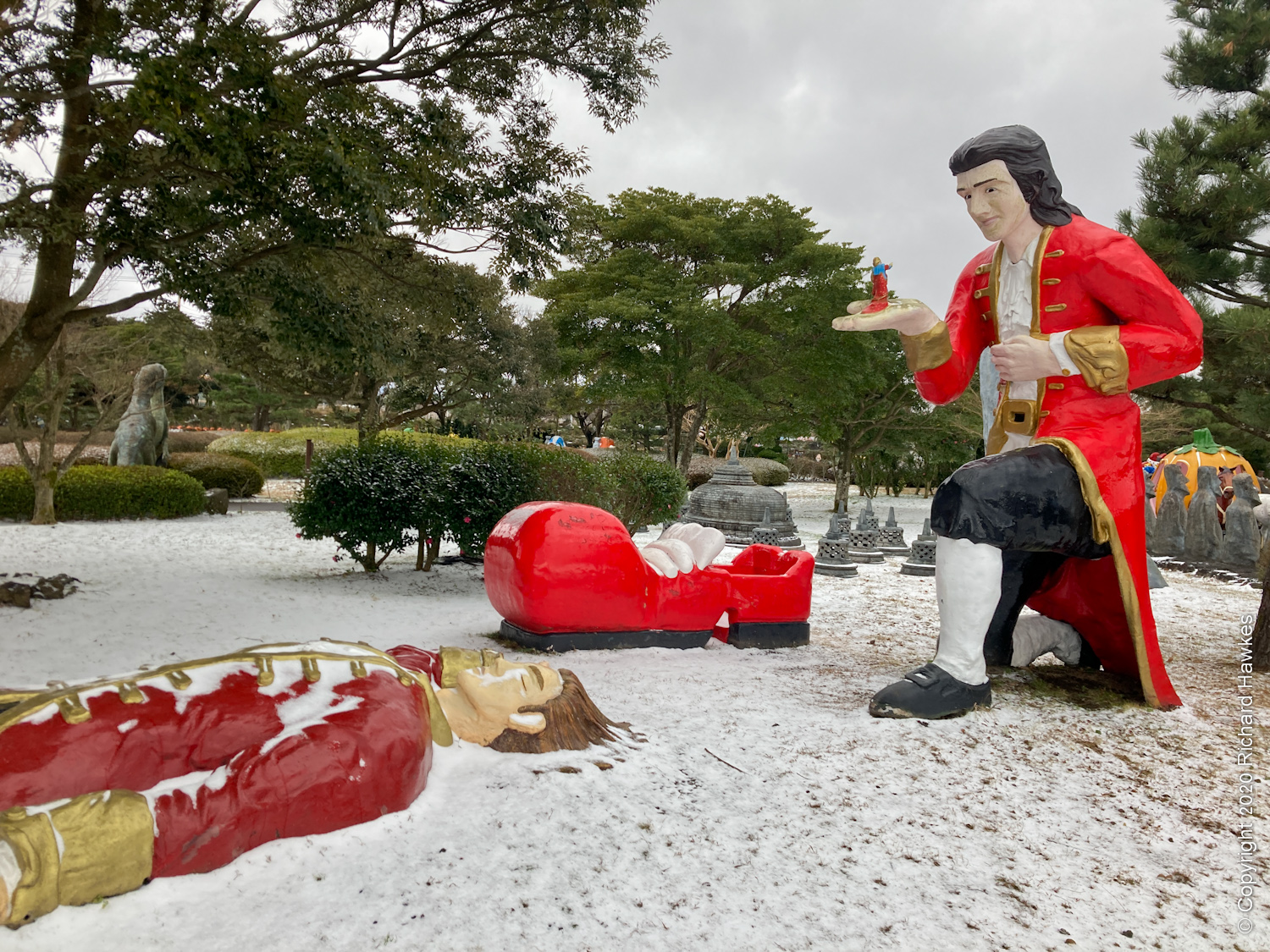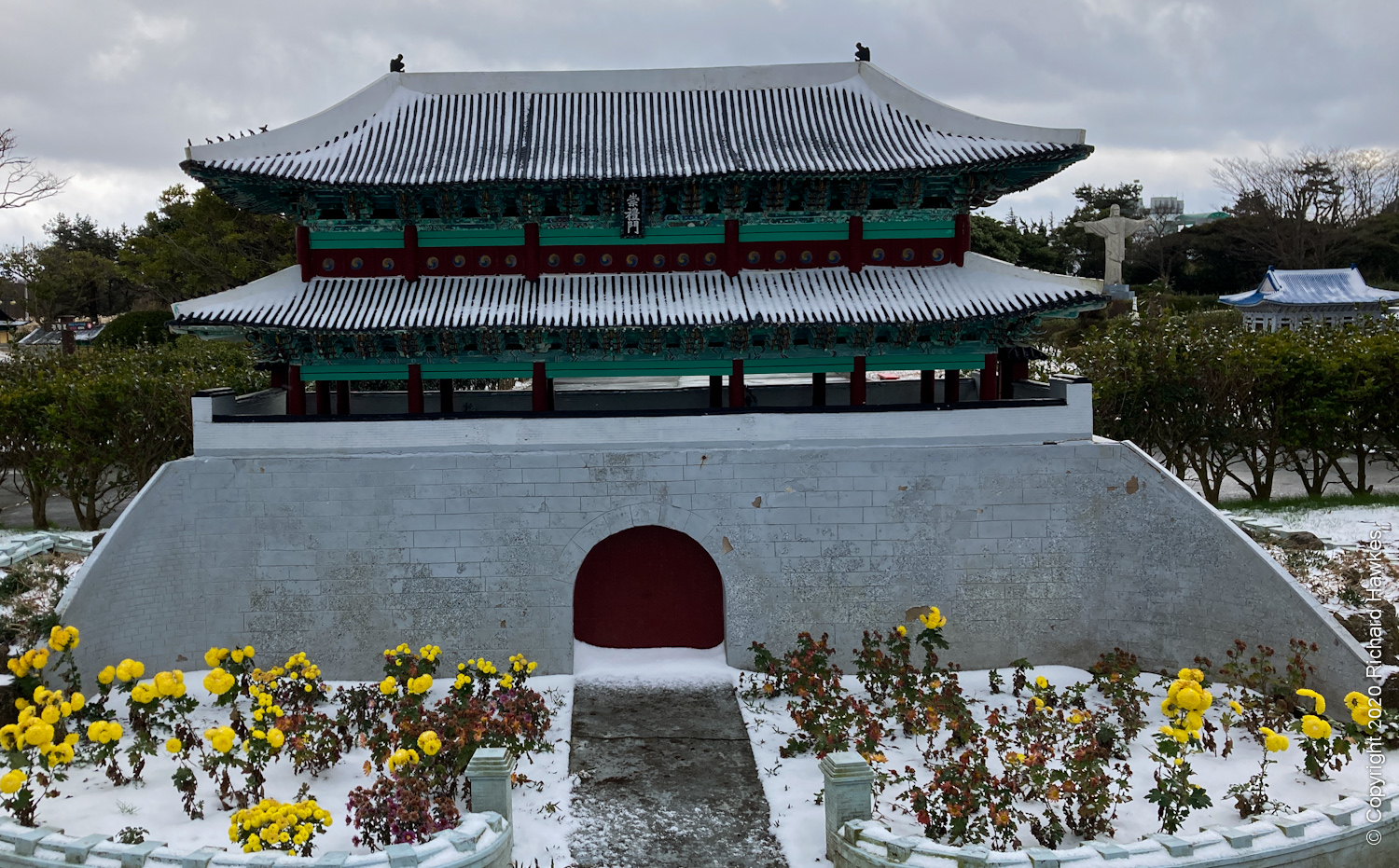 I drove east along the northern road to get brunch before heading south to Seogwipo and my accommodation. I stopped off at a very chilly miniature village/theme park on the way. This was a winter trip in two parts; solo for three days, then four days with Romana.