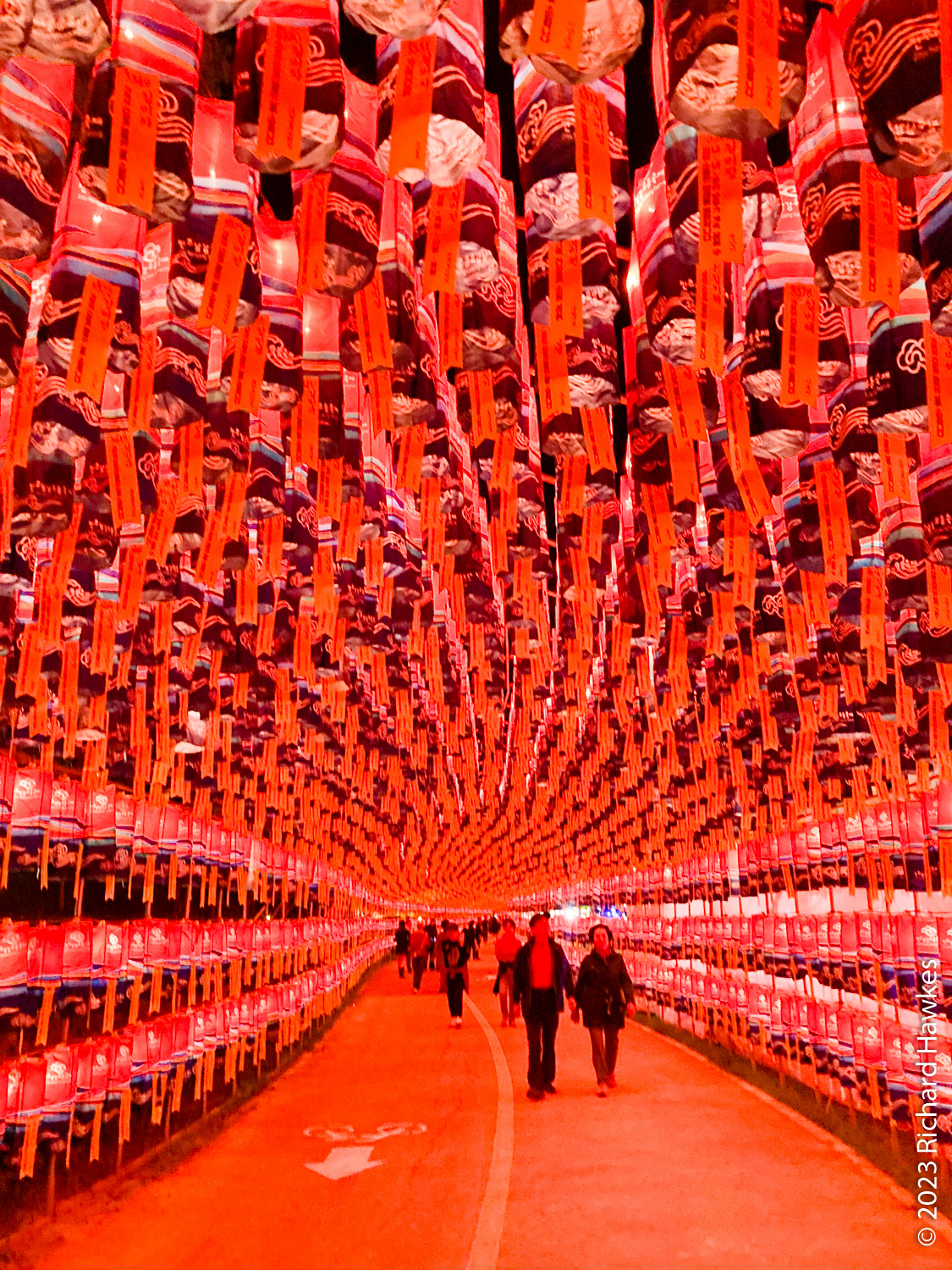 After I parked at Mung Cle Guesthouse (뭉클 진주게스트하우스), I walked to the river. It was late afternoon and the sun was low in the sky. There were lots of lanterns of many shapes, sizes and themes floating on the river. There were also two footbridges floating on the water, I guess temporary additions for the festival. In order to use the bridges, you had to pay a fee. I (eventually) managed to get a reusable ticket via Kakao Talk which meant I got a festival wristband! However, I ended up only crossing twice!