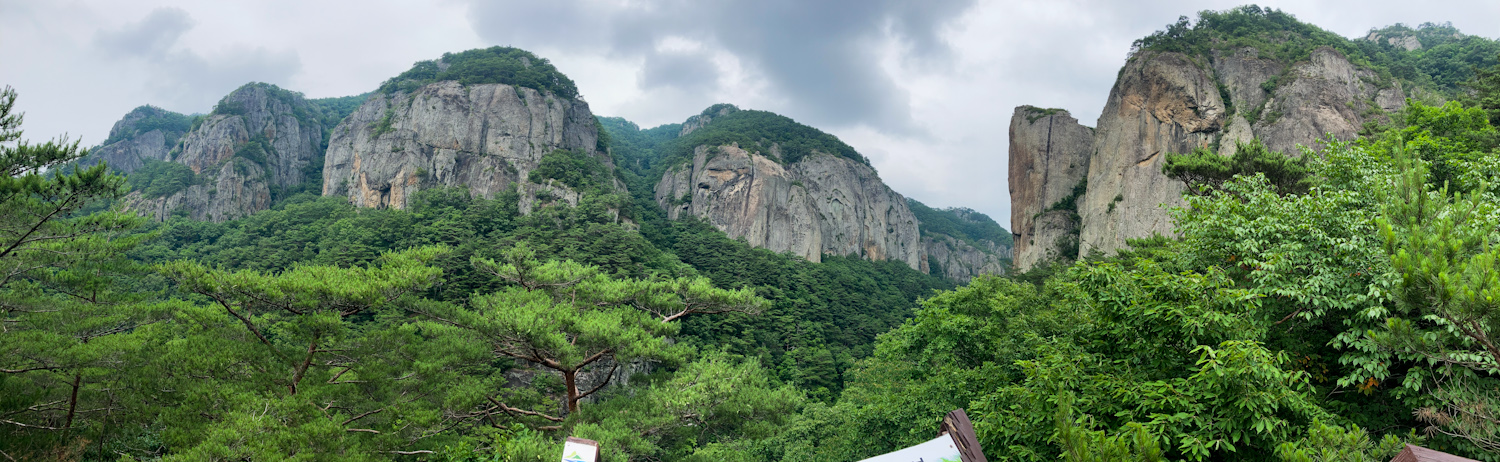 The hike up was through forest and there were only a few points where you could see any mountain views. However, the view of the big range opposite was spectacular. I was walking on a ridge across the way from the main peaks of Juwangsan.
