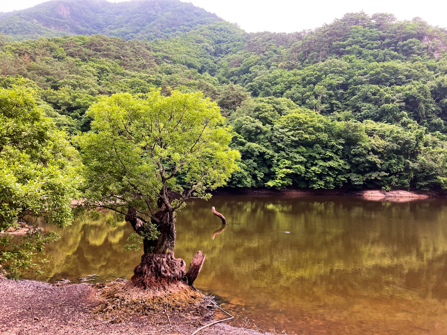 Then there was a big hike down to the valley and a trek through more woods, this time very damp and leafy. The water was full of leaves and the it was cool and green. After this was a small trek to one of the big spectacular waterfalls here, Yongyeonpokpo (용연폭포).