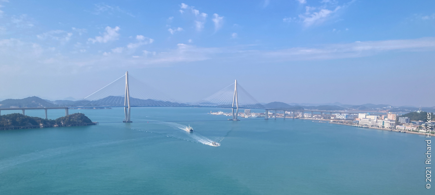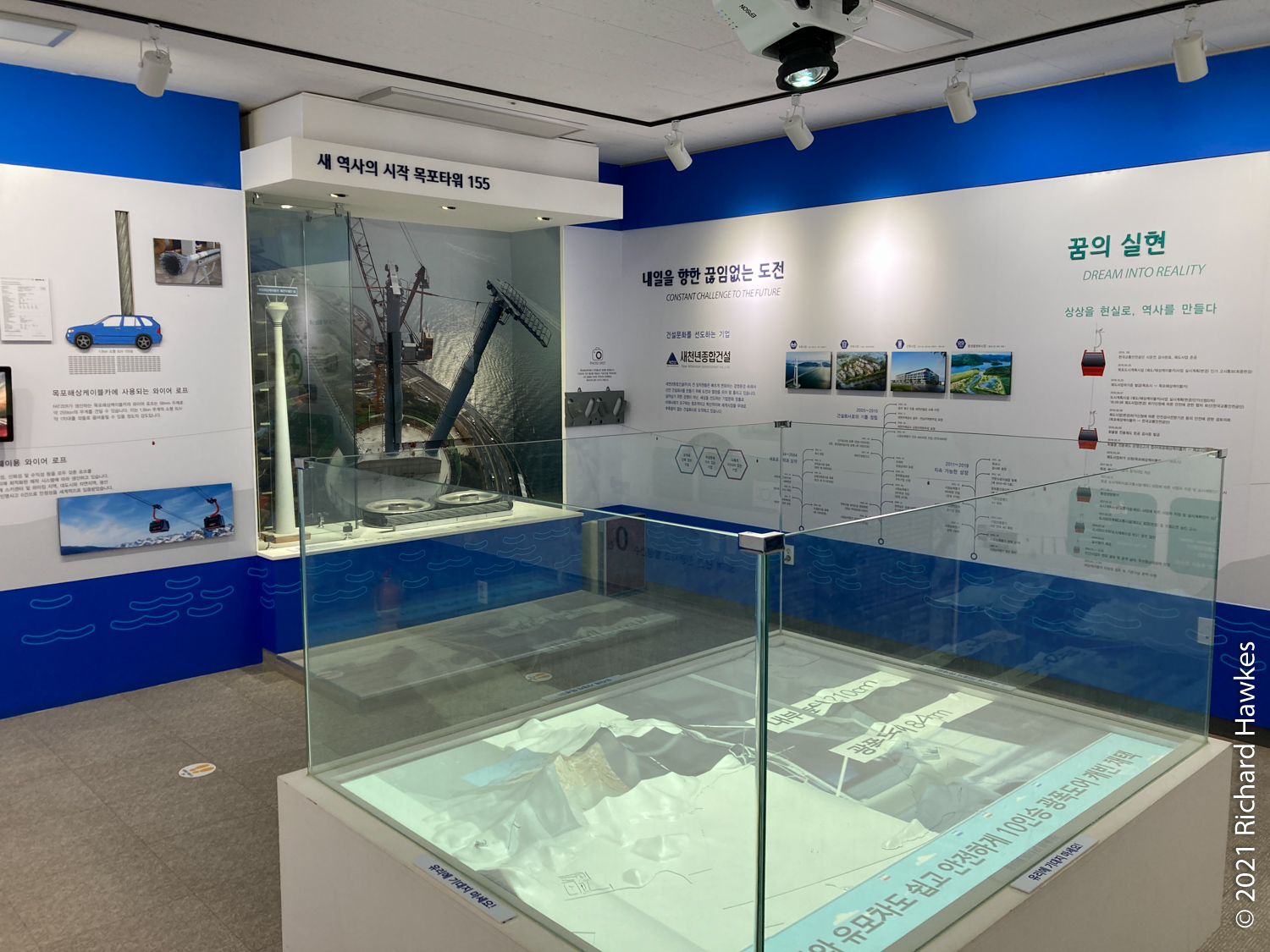 I eventually got to the Bukhangseungjang (북항승강장) Mokpo Marine Cable Car station. I had a snack and waited. This cable car is divided into two sections; the first goes to the top of Yudalsan mountain, where you alight and walk around before getting onto the second leg which takes you across the sea to Gohado island (고하도). At Yudalsan, I walked to some of the lookouts and enjoyed views of the sea, Mokpo Bridge and Mokpo city, then got onto the second car across the sea. Both the mountain and sea sections were pretty amazing, especially on this clear day. There was a tug boat below me doing its thing.