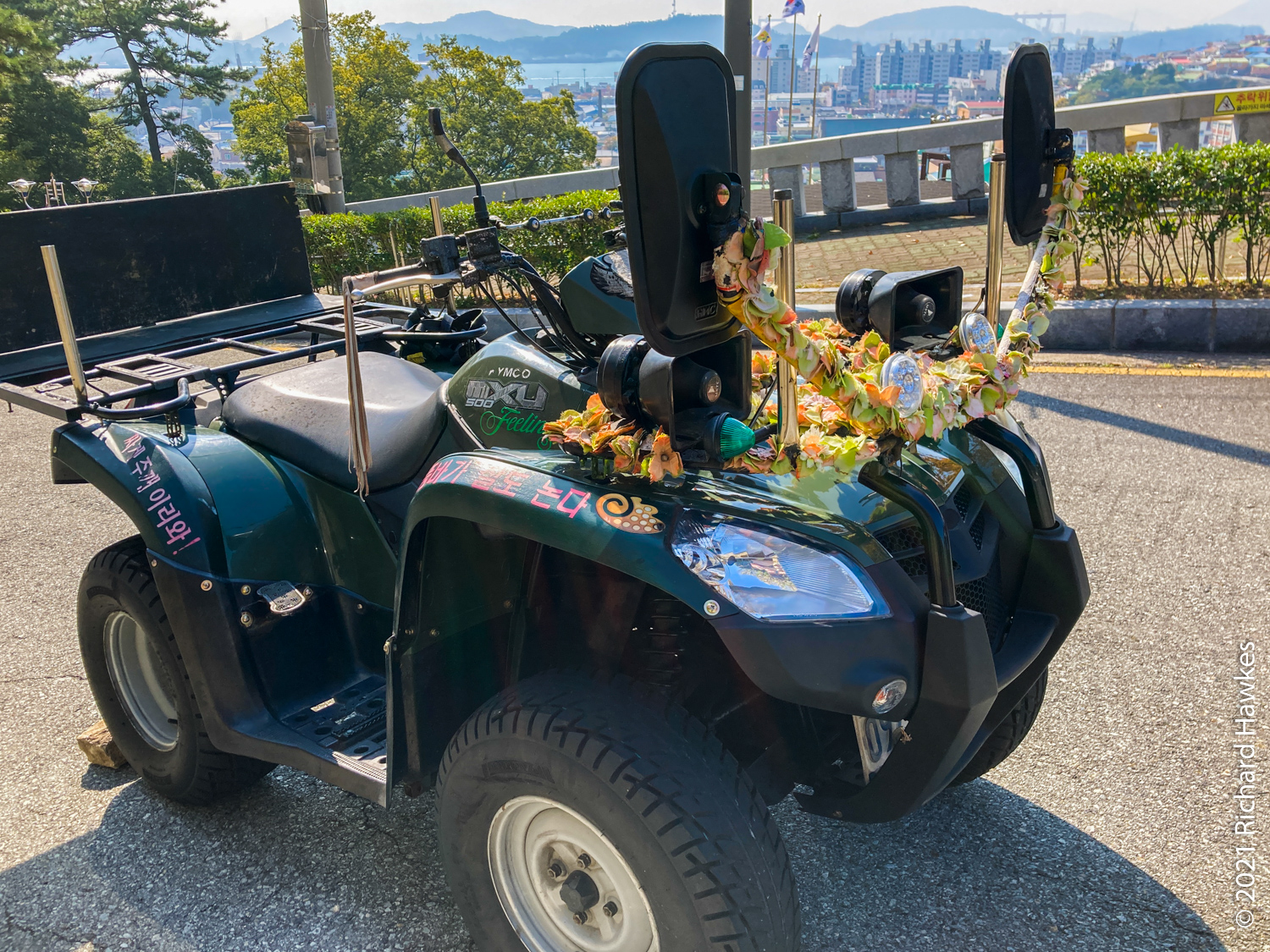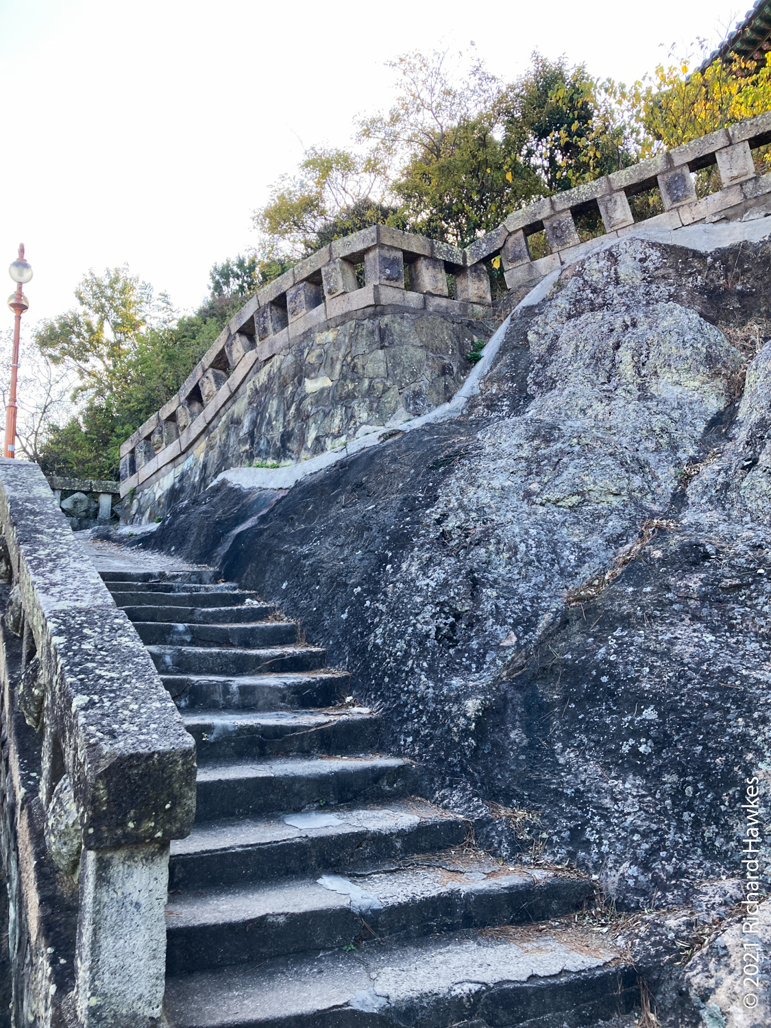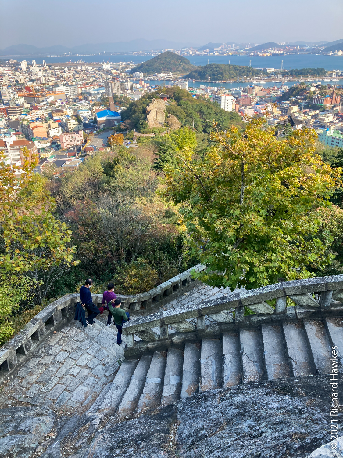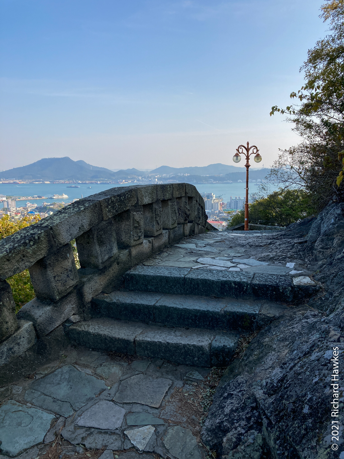 After a breakfast on the roof terrace, I went up behind the guesthouse to a rock known as Nojeokbong (노적봉), Yudalsan Park (유달산고원), and the entrance to Yudalsan mountain (유달산). It was a nicely maintained park with not the last Lee Sun-sin statue I’m going to see on this trip! I walked about ten minutes a little way up the paved mountain trail but didn’t commit to the top as I had other plans!