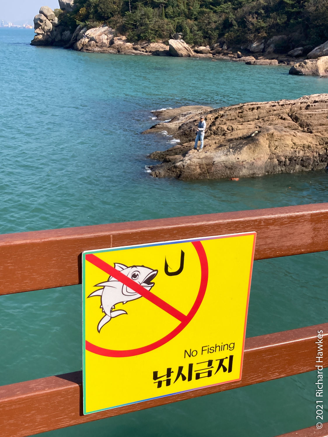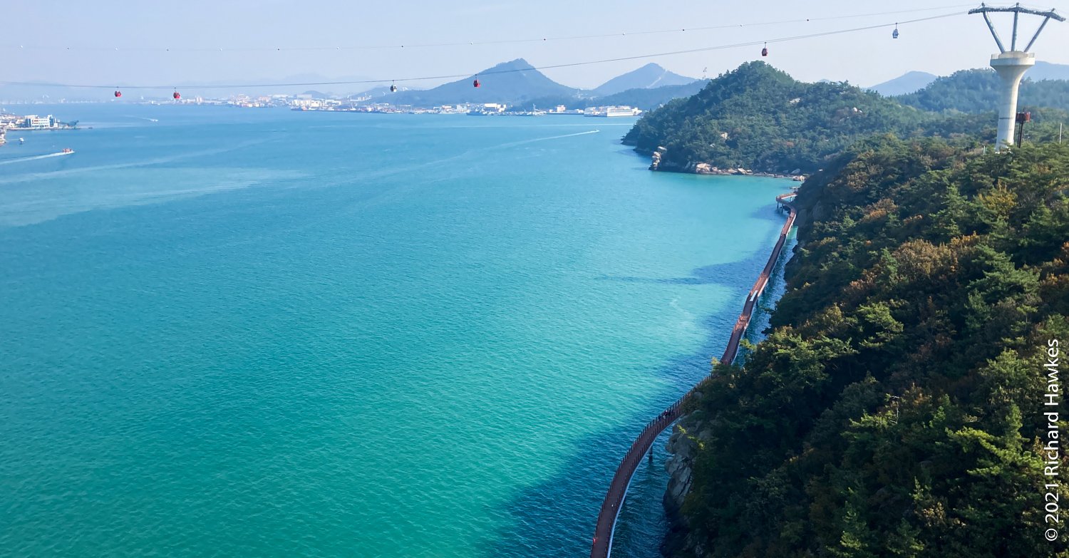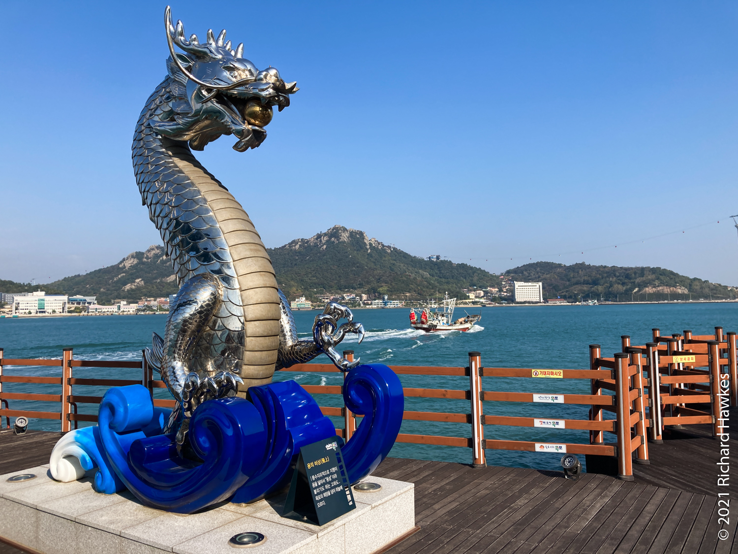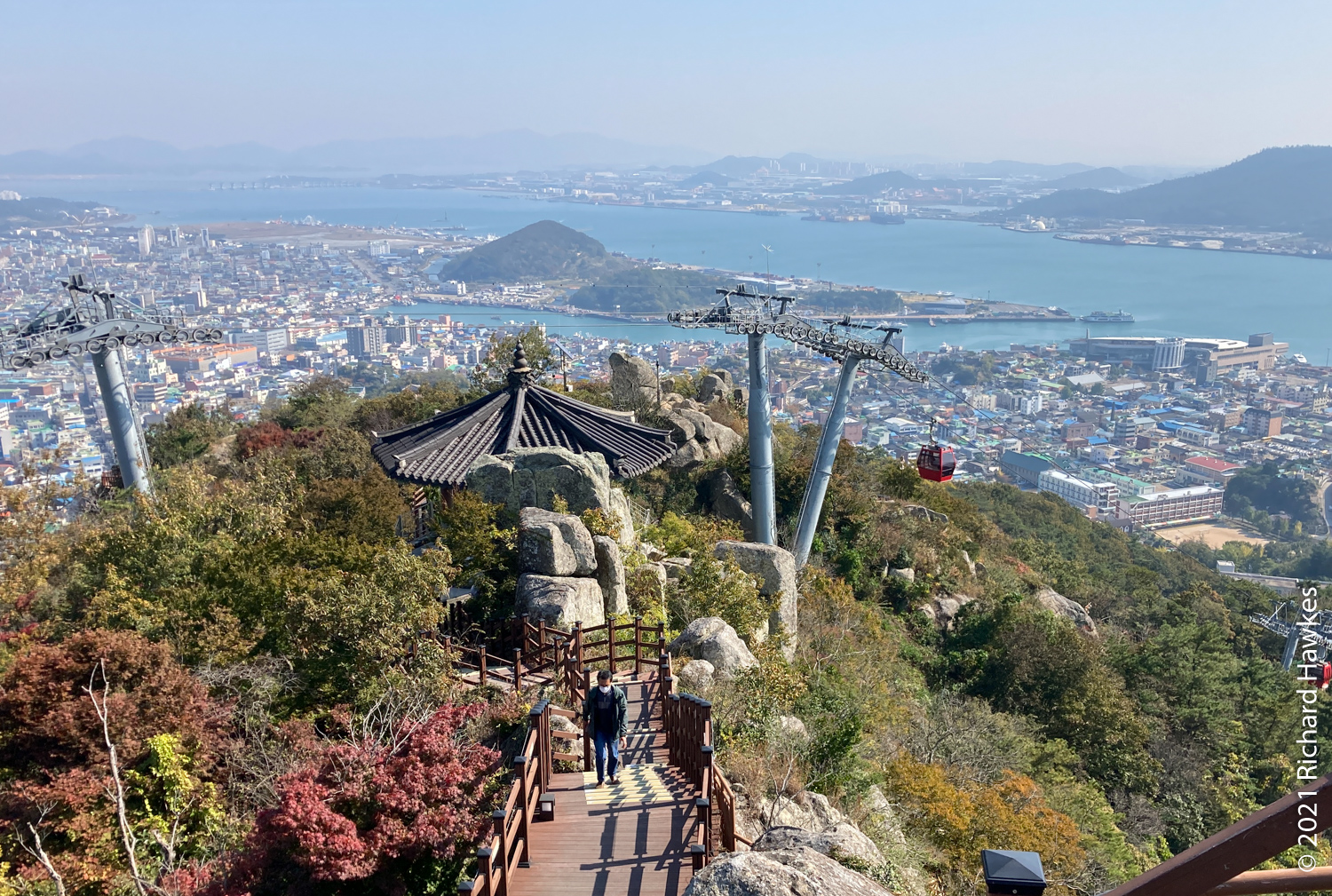 Off the observatory, you walk down steps to the walkway. From there it goes left and right; I went right and followed it to the end. It was really cool, allowing you to see the rocky coast, sea, bridge, cable cars, and Mokpo, all from one place right above the sea. At the end there were some man-made caves dug by Japanese forces in WWII as patrol boat hideaways. I then walked to the opposite end where Mokpo Bridge is, plus another Lee Sun-sin statue, and a dragon statue. At the bridge end, I walked up some step onto the mountain trail, a ridge that runs the length of Gohado. I got off at the cable car entrance an returned to Yudalsan on the cable car.