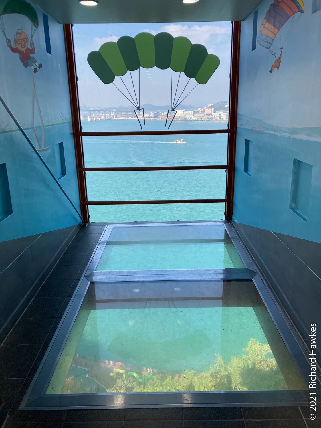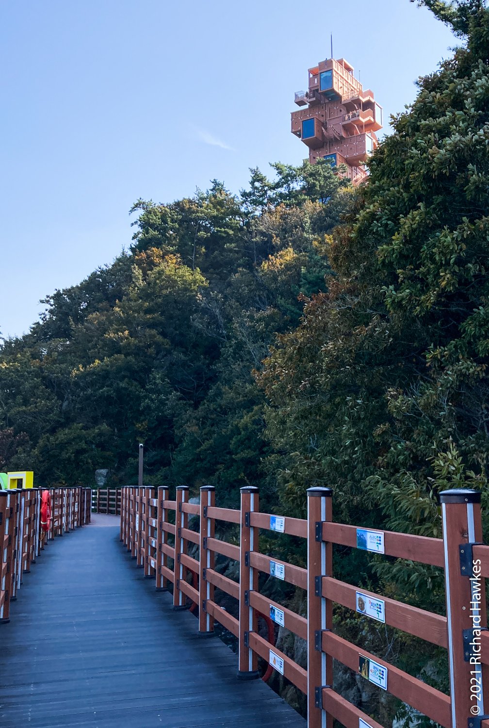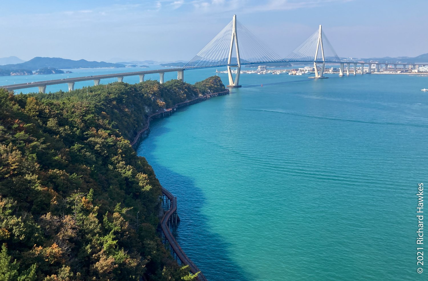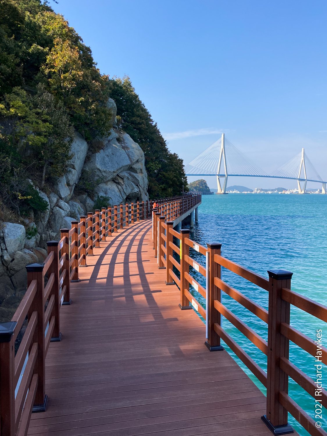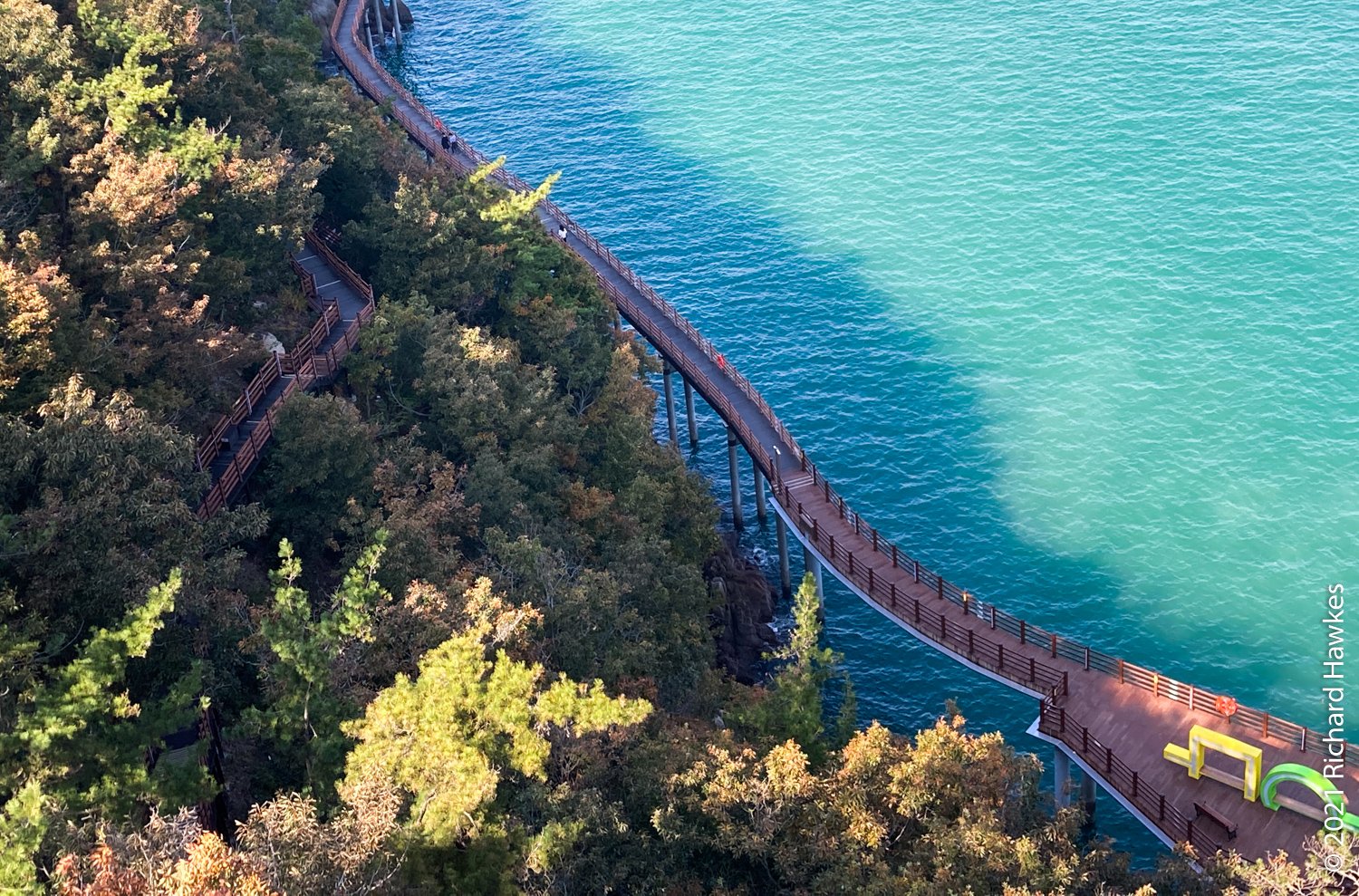 After the coffee, I went up inside the observatory. It’s a unique building built with orange containers. Each floor has a theme connected to the area, some with glass floors that let you see down. At the top looking back to Mokpo, you can see Mokpo Bridge, the mountains of Mokpo and the city, and a wooden decking walkway running along the northern side of Gohado. Cool! Next stop! This was the Gohado Sea Deck.