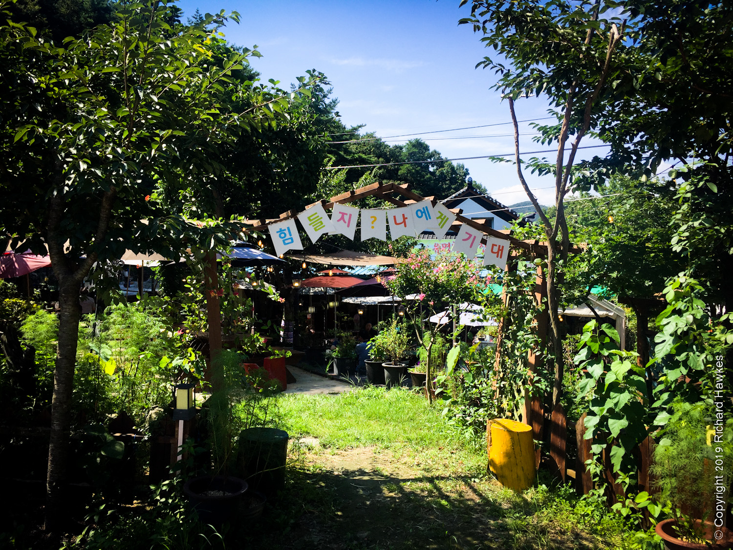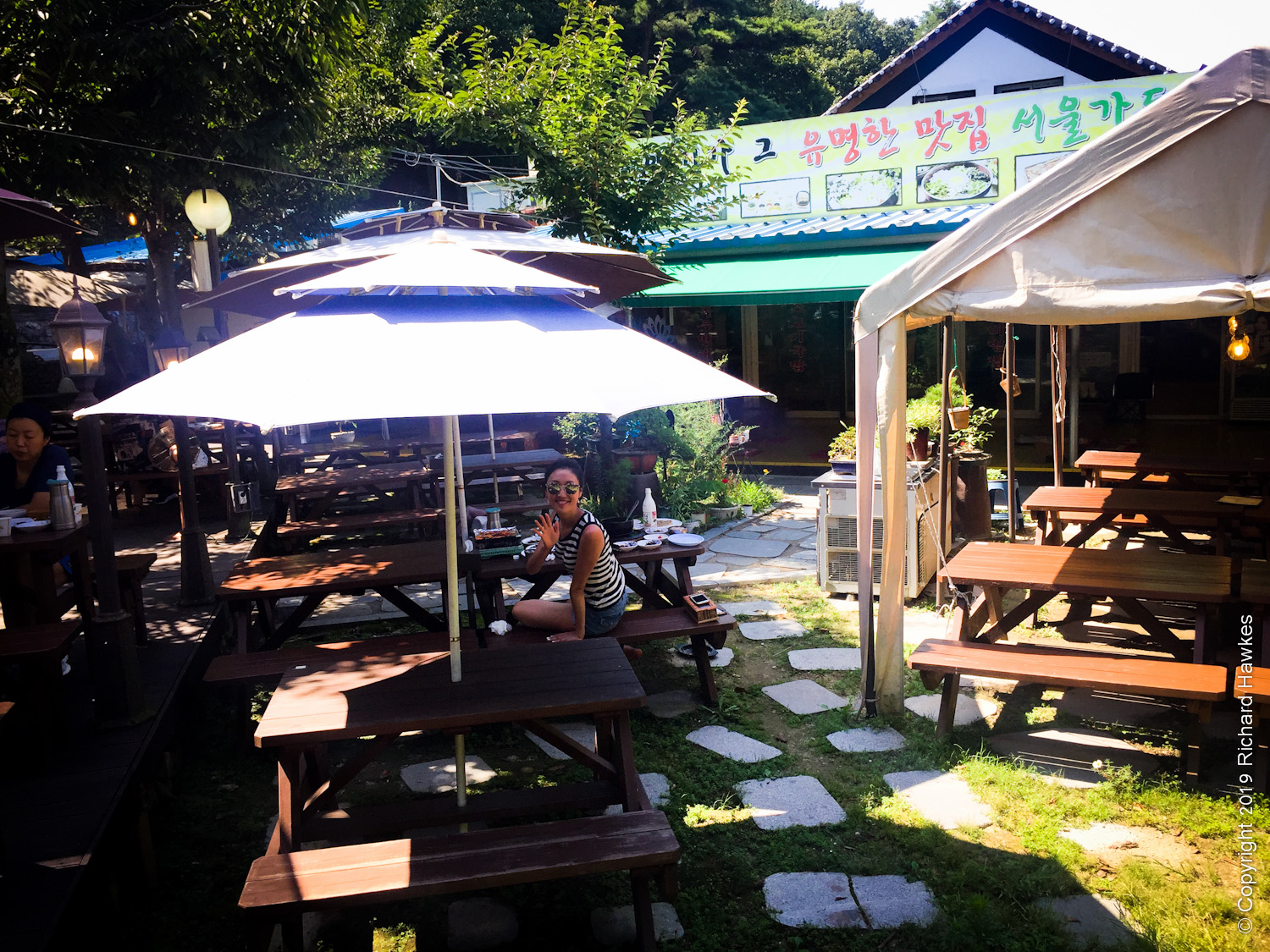 We need to start our drive back to Seoul and went to the restaurant area near the car park. So many places to choose from! We chose a place with garden seating (서울식당) and views of the mountain, and ordered a large late lunch and a bottle of makgeolli.