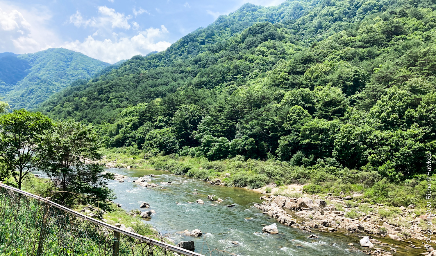 Our next stop was only supposed to be about forty minutes drive from here, but I guess the Sunday traffic back to Seoul was starting. Along the way and onto smaller roads, we followed a big stream in an area I think was Inje; this looked like another promising place to explore. We came to the birch forest (Wondaeri Birch forest – 원대리자작나무숲), but once we got there, we didn’t really fancy the two to three hour walk to the centre where all the white trees were meant to be; we walked for about an hour, came back and had a coffee on a terrace of one of the nearby coffee shops (and Romana complained to a man smoking too close to us and he moved… nice!).