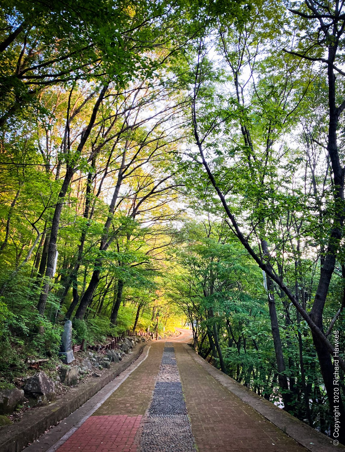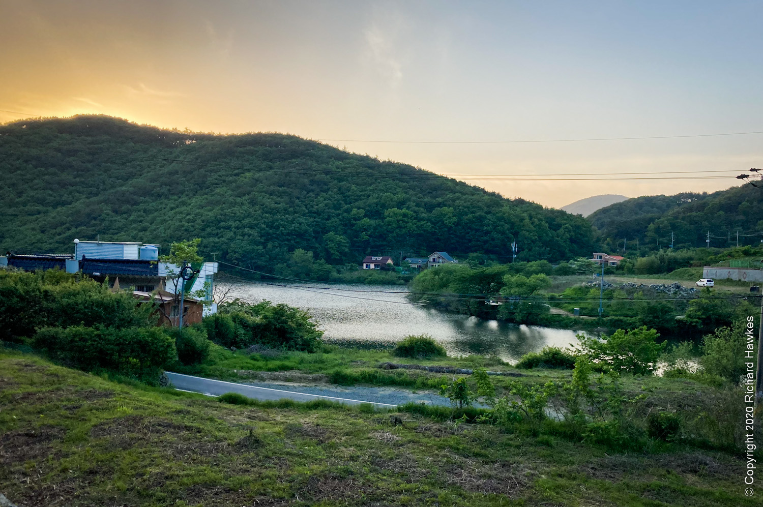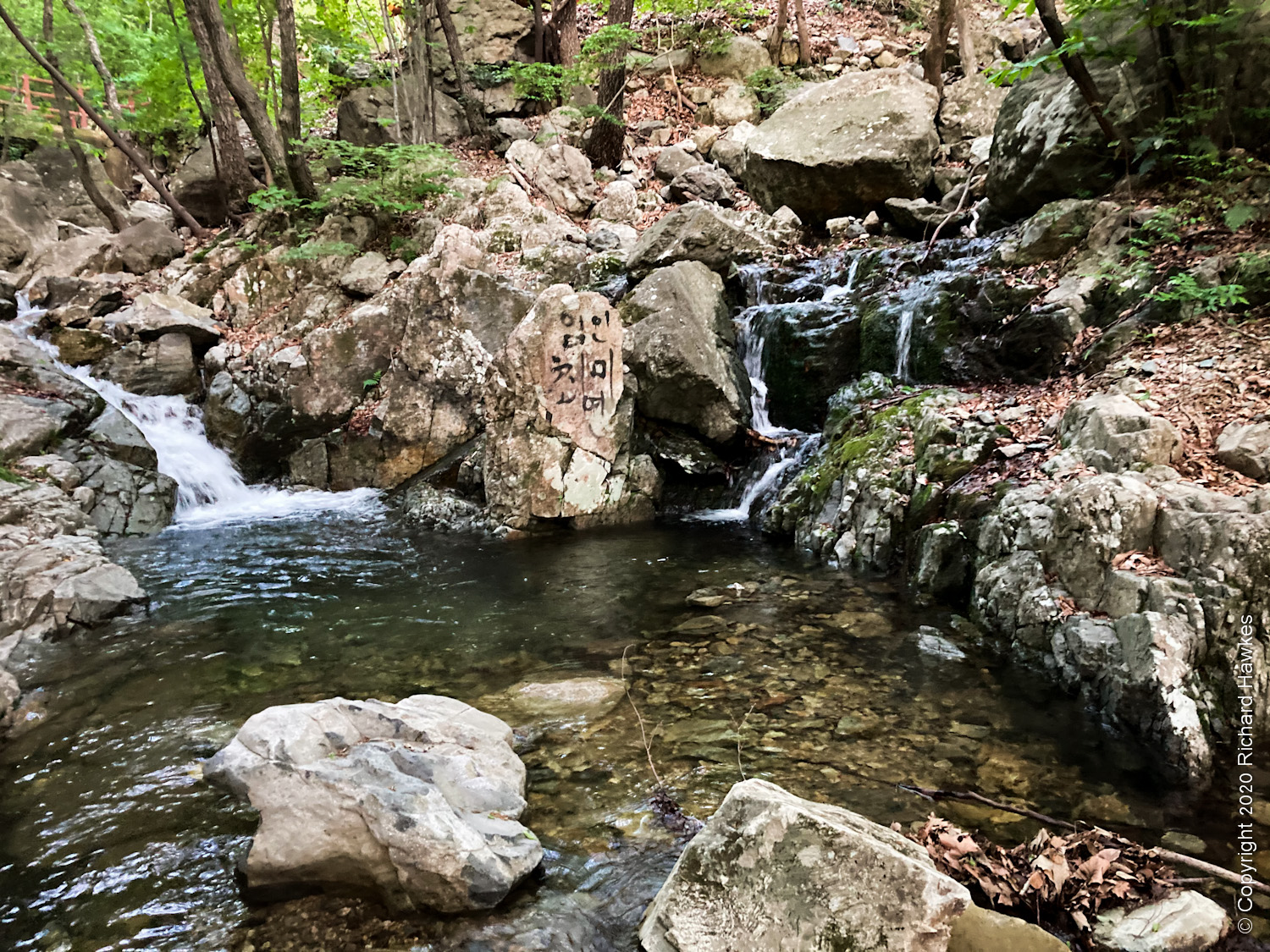Back at the hostel, I took a walk to Mundong waterfalls, about ten or twenty minutes away. It was a very nice walk and I got to see some nice buildings, hills and a reservoir. It seems the people here take pride in their surroundings and property compared to other parts of the Korean countryside. There were a few restaurants by the entrance to the waterfall trail. It was a woodland trail and went gently up along a stream. The falls weren’t really a big set of falls, more like an extremely rocky stream which would be great to hang out by in the hot weather. I loved the sound of the water and the how peaceful the woods and stream was; so relaxing!