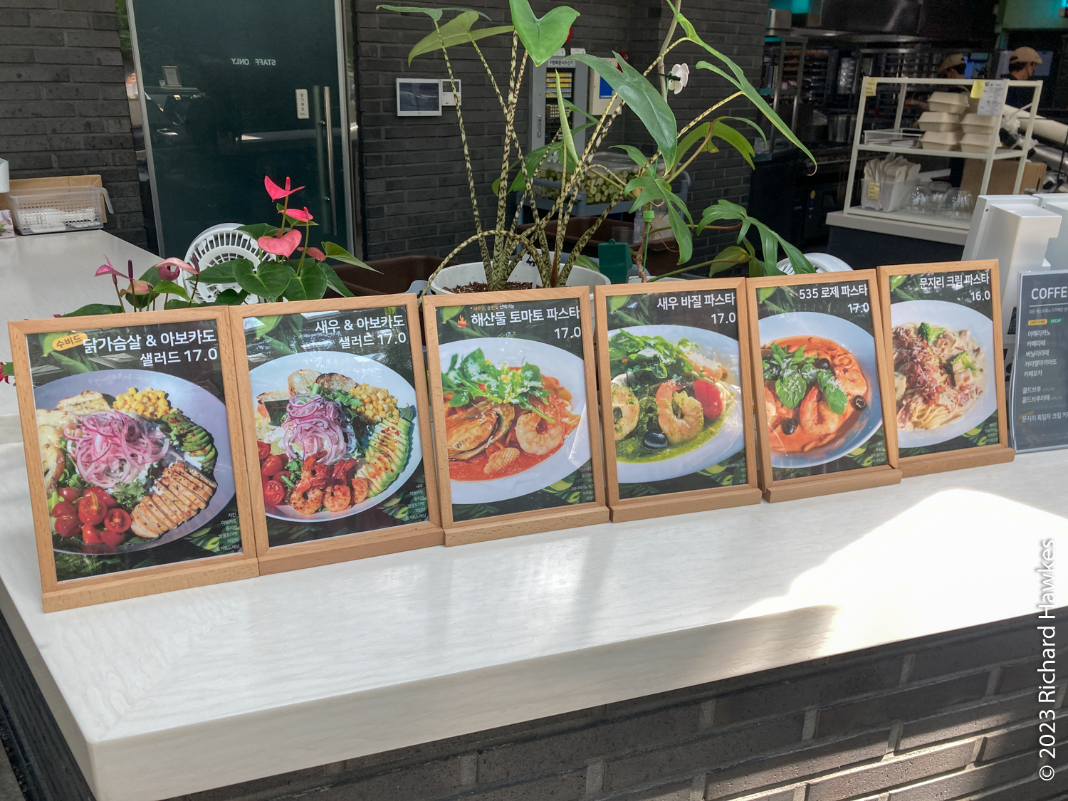 Munjiri 535 Cafe (문지리535카페) is what I call a mega-cafe; three large floors with big windows, and masses of seating! It also has a large indoor garden full of huge dark green leafy plants. There’s also a terrace out front for cooler days; it was about 33 degrees C when were were there, so we planted ourselves inside.