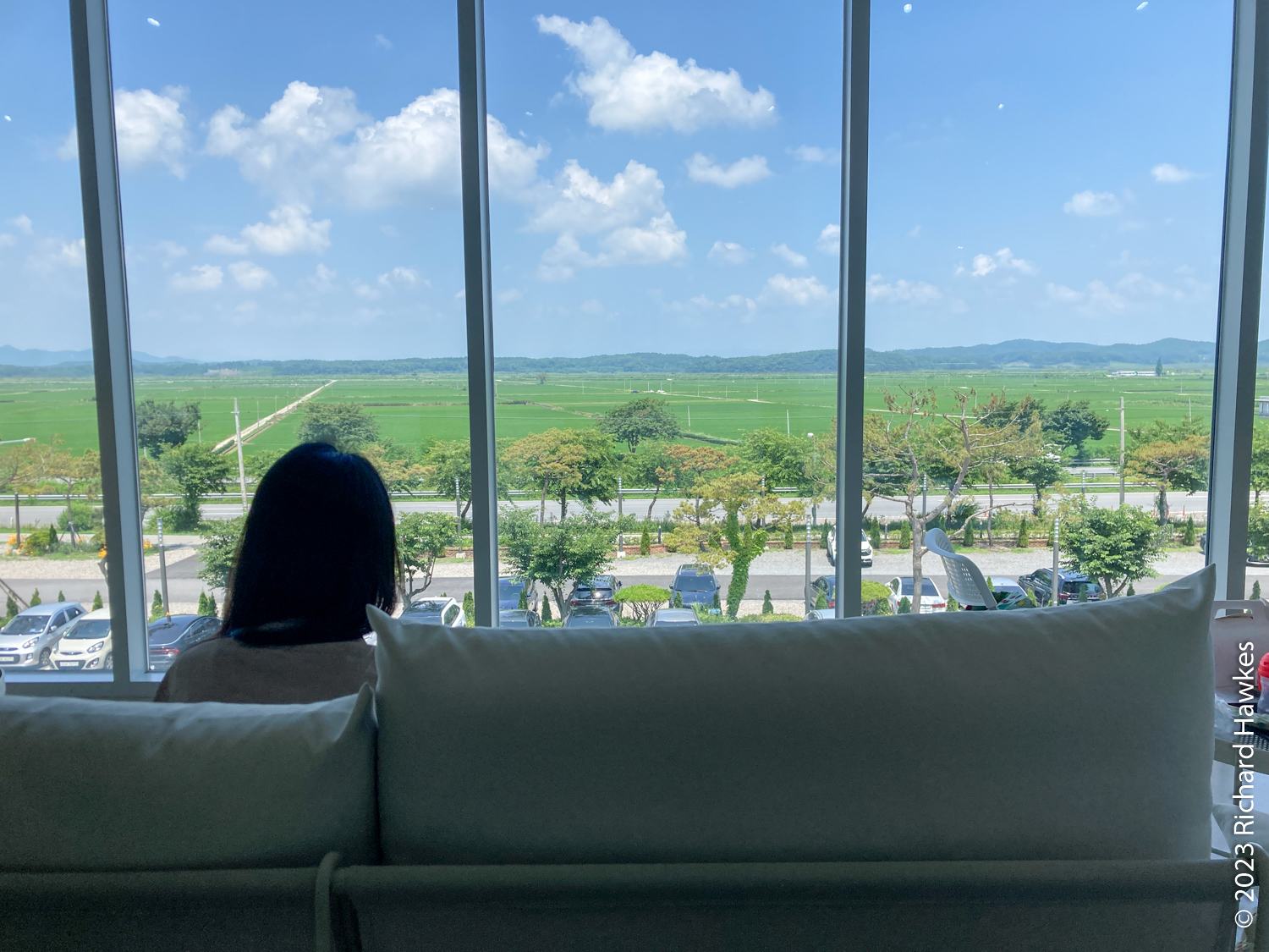 Romana and I drove there as busses from Seoul take a long time. Even on a Monday, the cafe was pretty busy so we were glad to have arrived by 11:30. We got a sofa seat on the top floor by the huge windows. The views are mainly green fields of rice, then some forested hills in the distance. Beyond that, of course, is North Korea, over the Imjingang River.