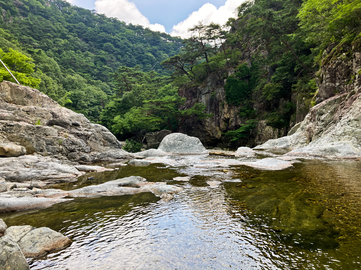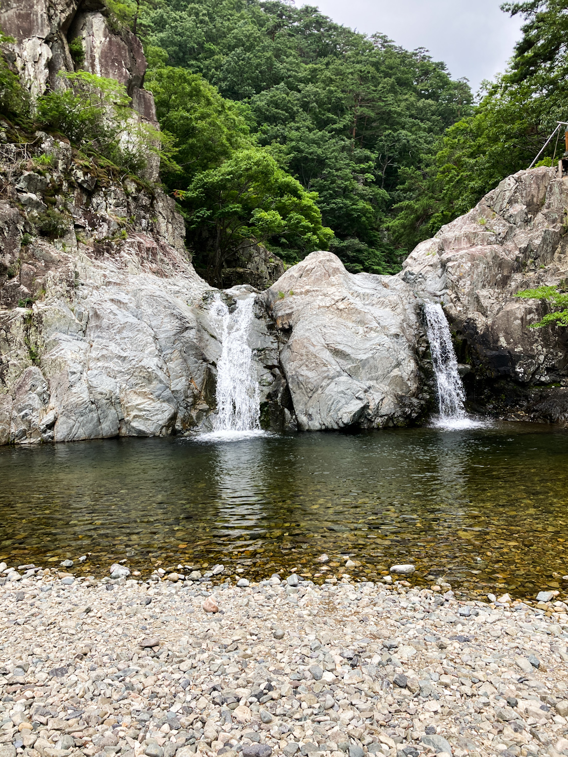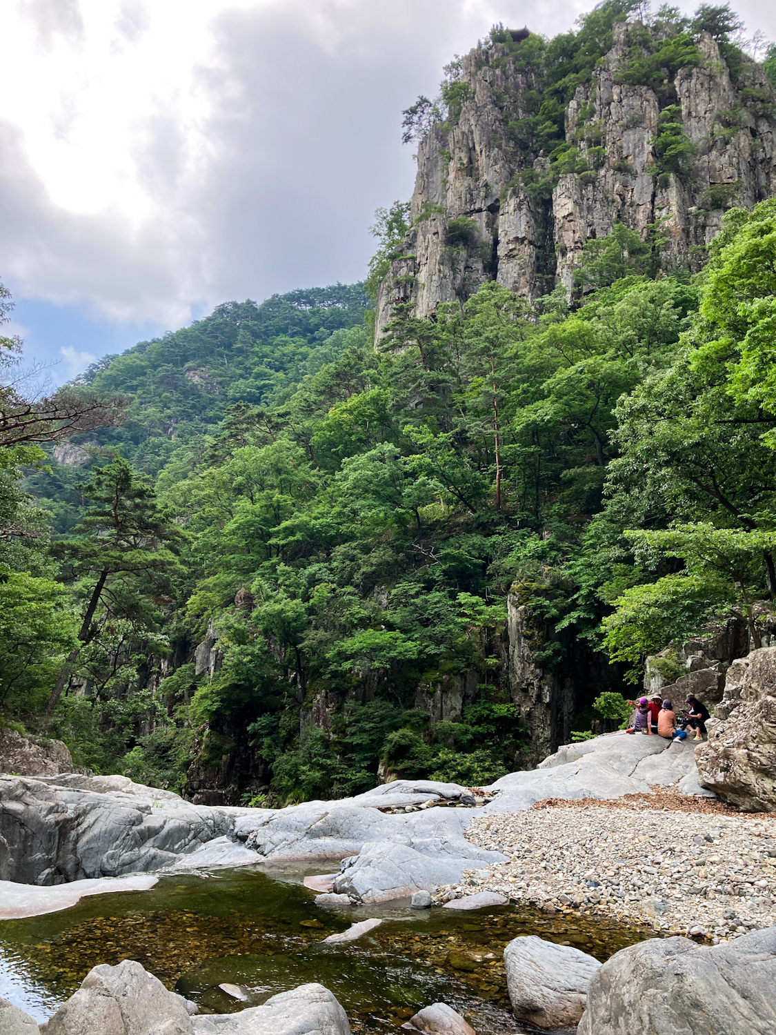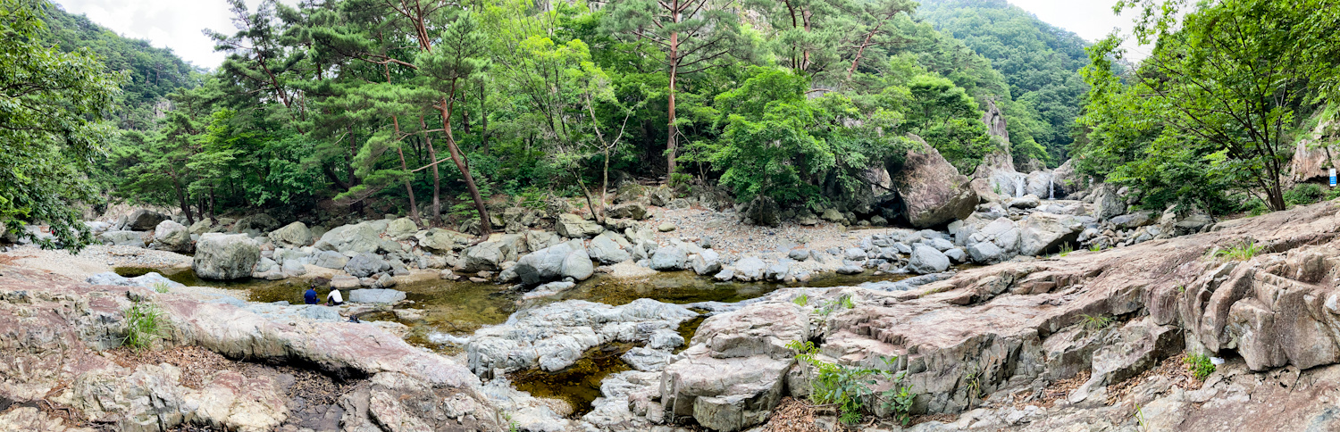 I had a brief breakfast at the G Hotel then left to my first mountain stop. Driving into Naeyeonsan national park was very pleasant, especially arriving around 10 am. The weather was cloudy with spots of sun. I had a coffee at a GS25. The Naeyeonsan 12 waterfalls trail starts at Bogyeongsa temple (보경사) and there’s an entrance fee. You walk past a few restaurants and accommodation places before heading onto the trail. The trail itself is clear and mostly even. You follow the river on your left and it soon get’s very picturesque. The water was so clear and the waterfalls start coming a-plenty. I managed to soak one of my feet by slipping on a mossy rock, so switched to alternative shoes to let it dry on my pack.