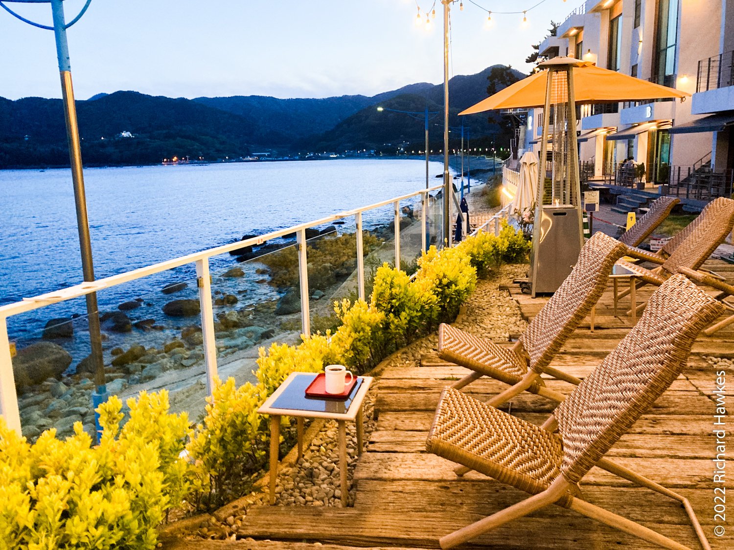 I drove into the nearby village to look for a cafe and restaurant but everything seemed to have closed at around 5pm. I drove onto a place near the sea, an area with a few large accommodations and found Lounge 32, a cafe with attached convenience store and accommodation. I sat on the terrace for awhile looking out to sea; very nice. At the convenience store, I got some microwave food and some beers to have back at the guesthouse.