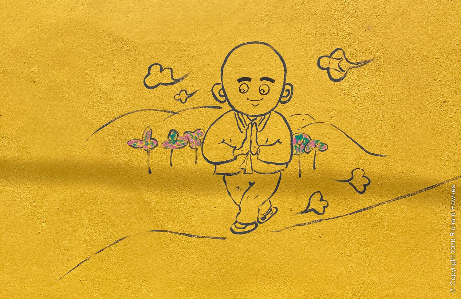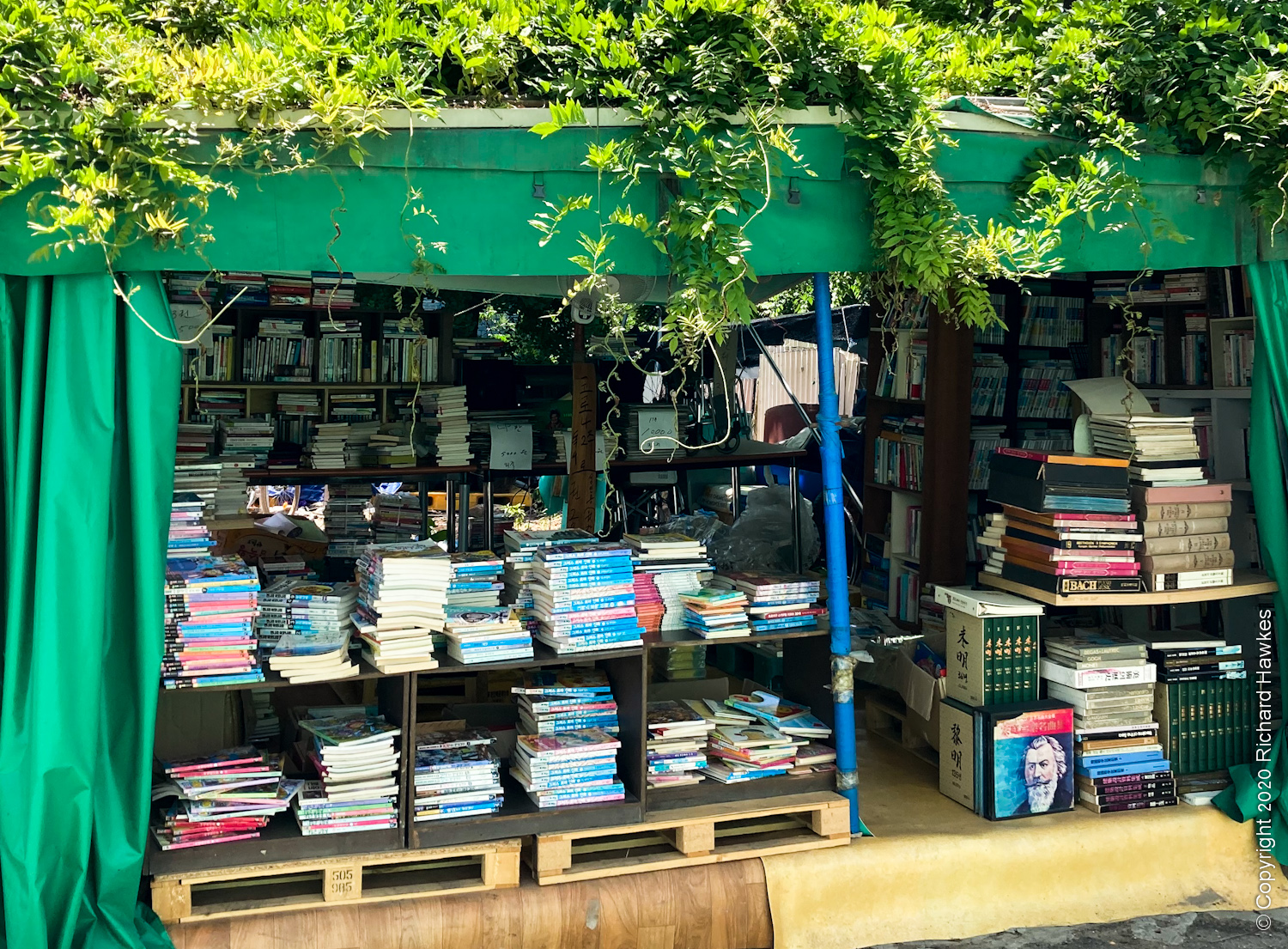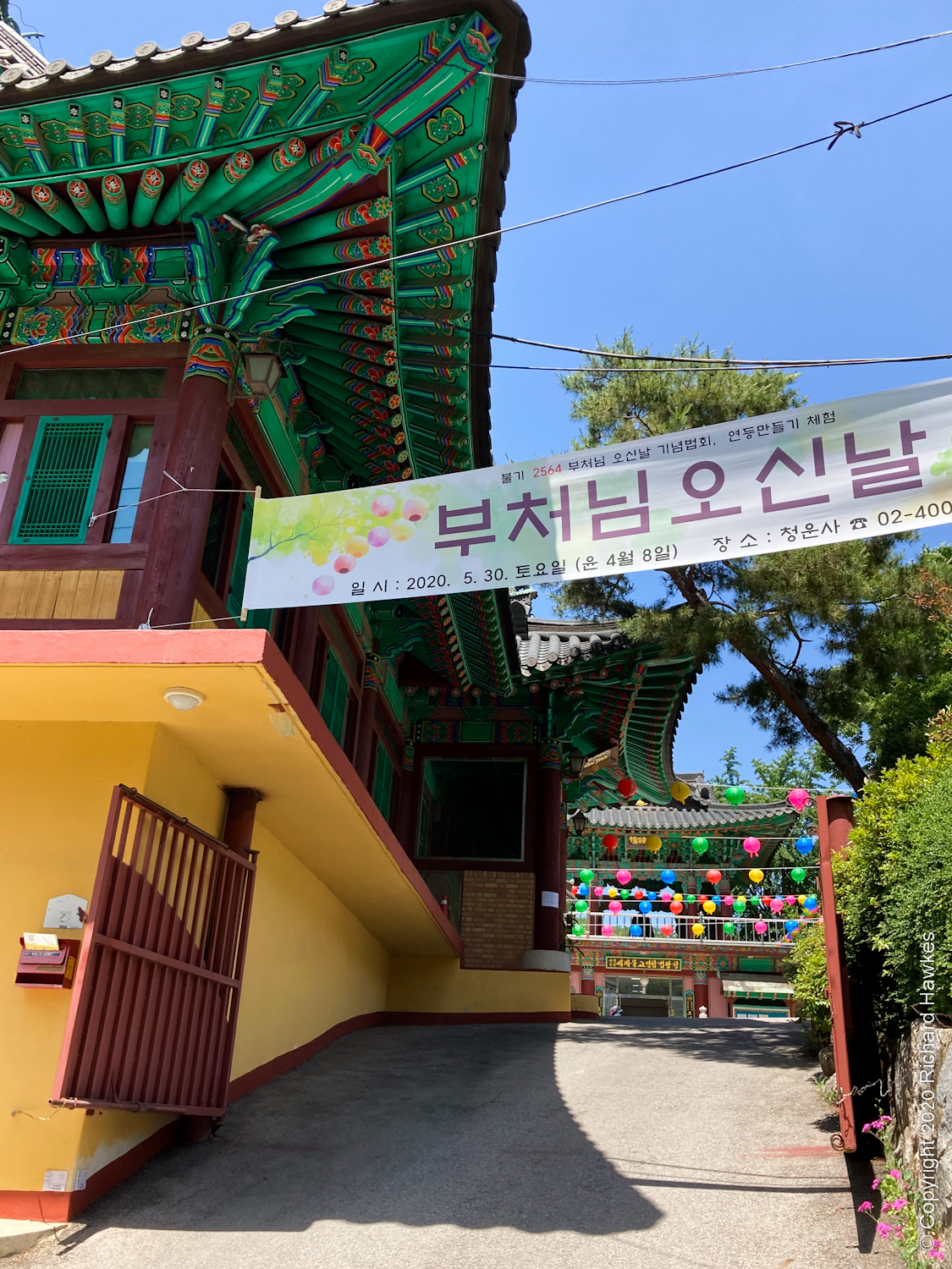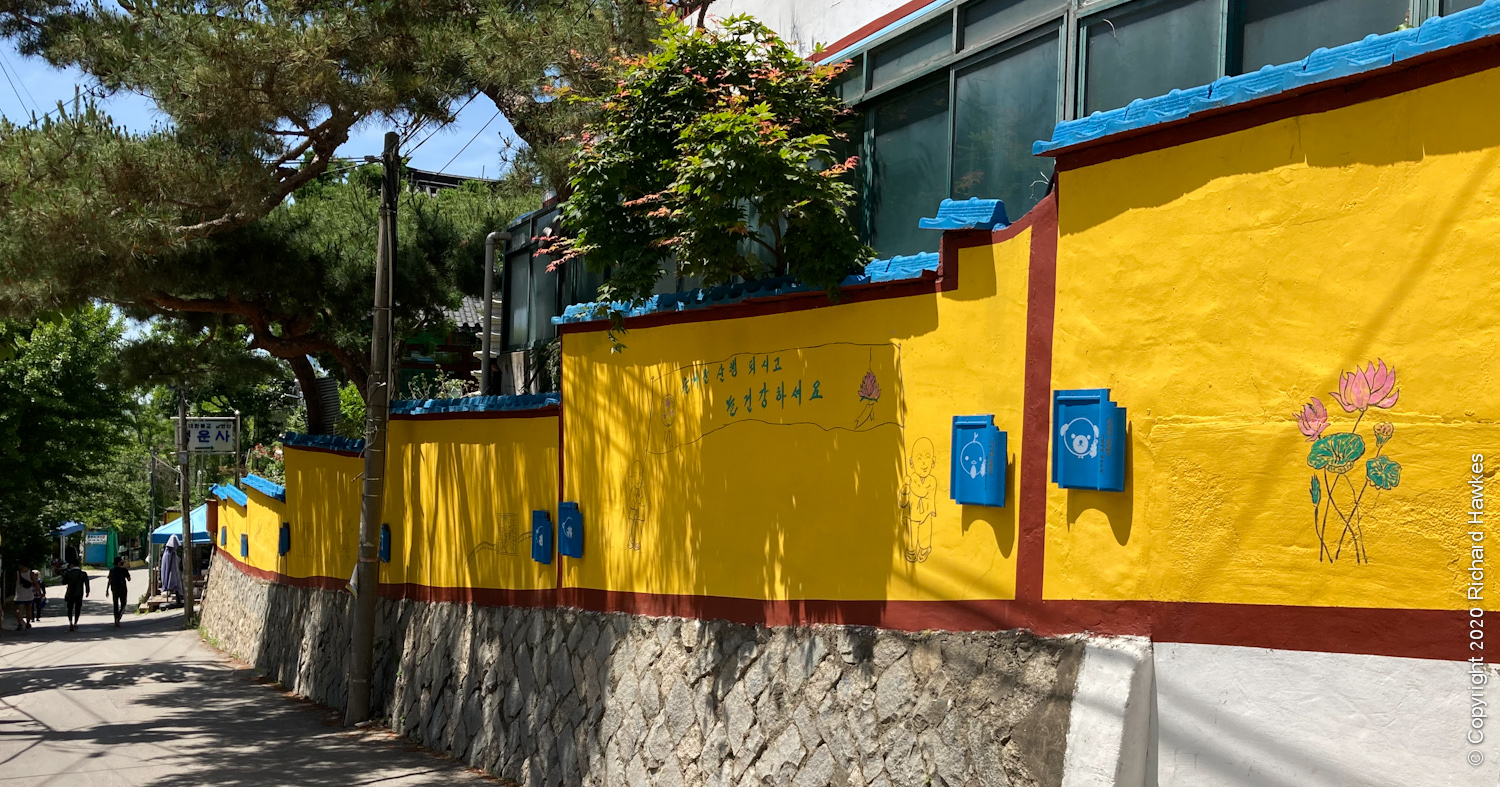 The road got smaller and there were a few hiking related shops and places to eat. There was a random, makeshift looking bookstore and Cheonguensa temple with bright yellow walls with cute Buddha pictures on it.