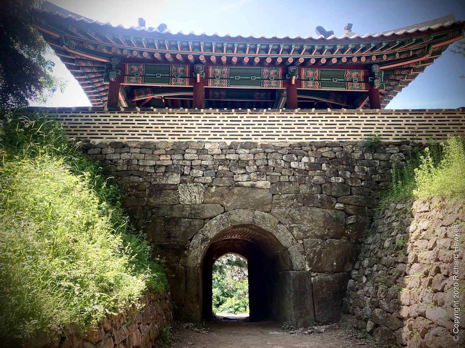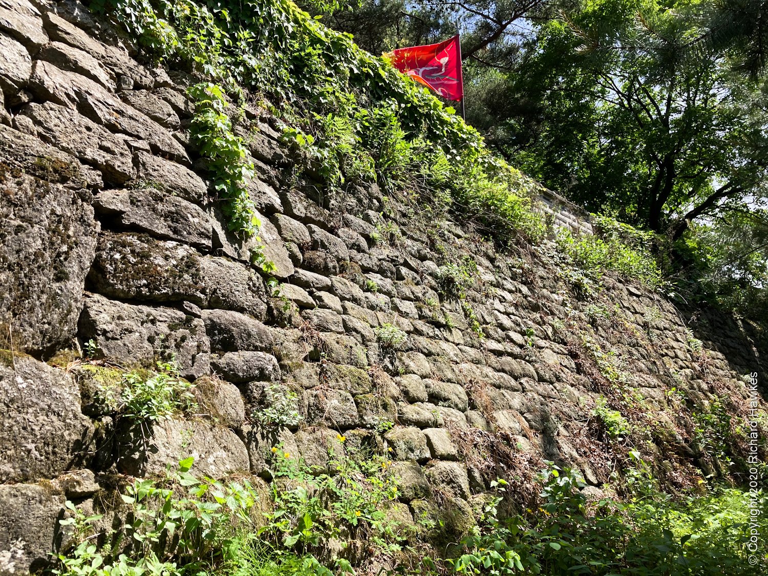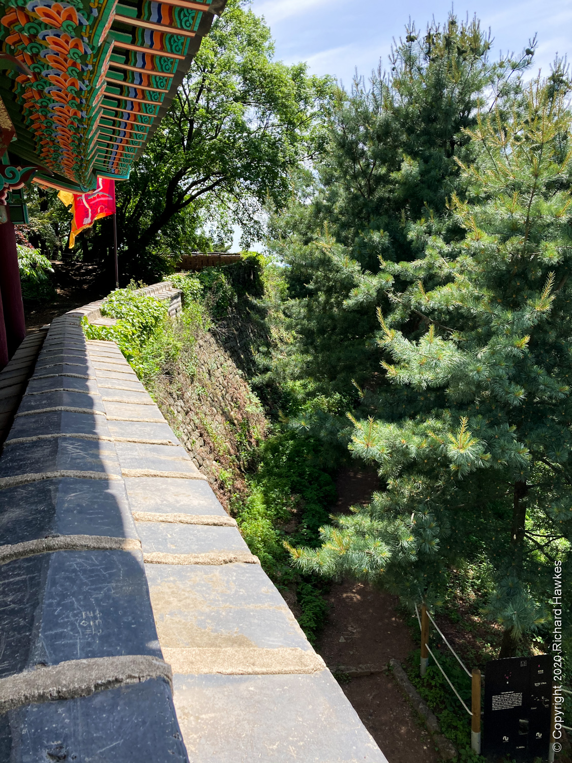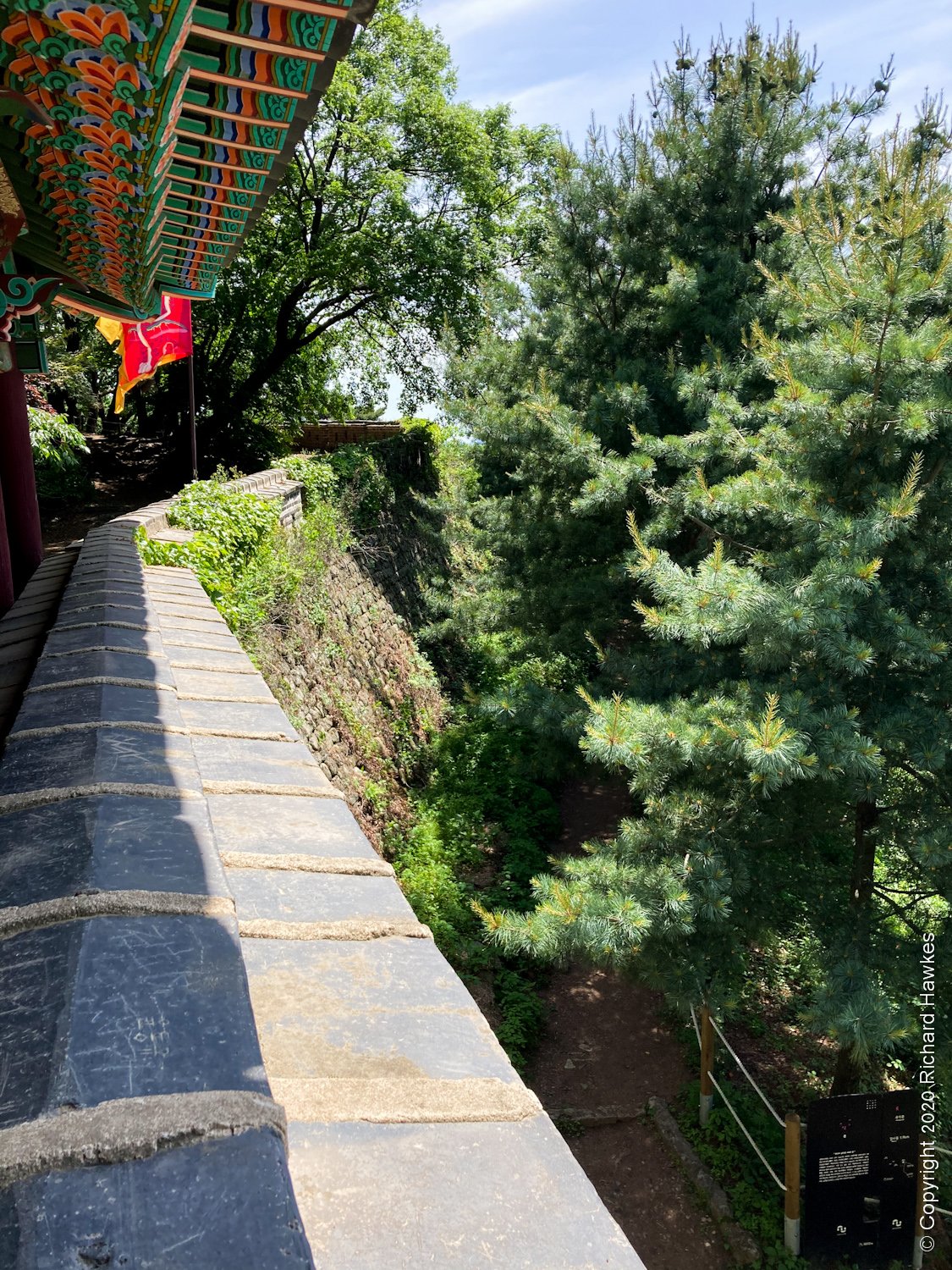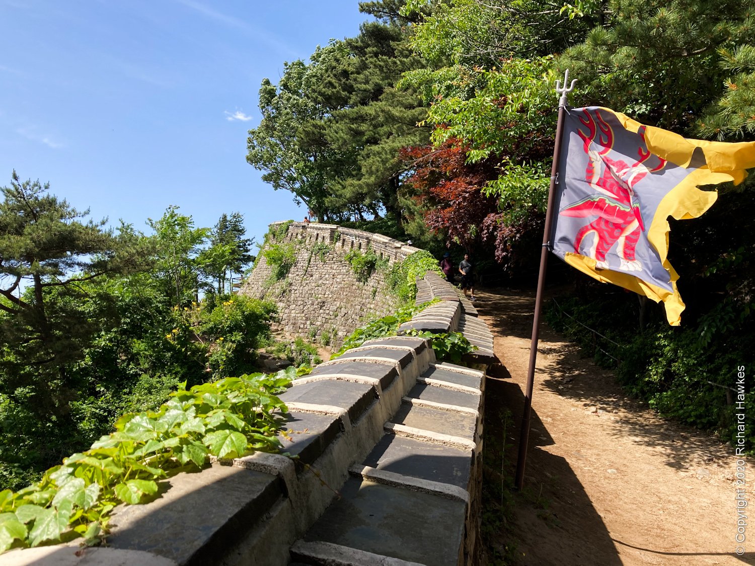 After a while, I got to the west gate of the wall and was impressed by the fact that it looked original, not rebuilt like a lot of historical places around Korea. The stones were old and weathered, and the gate itself had authentic looking mechanisms. Above the gate was the roofed area and a flag blowing in the breeze.