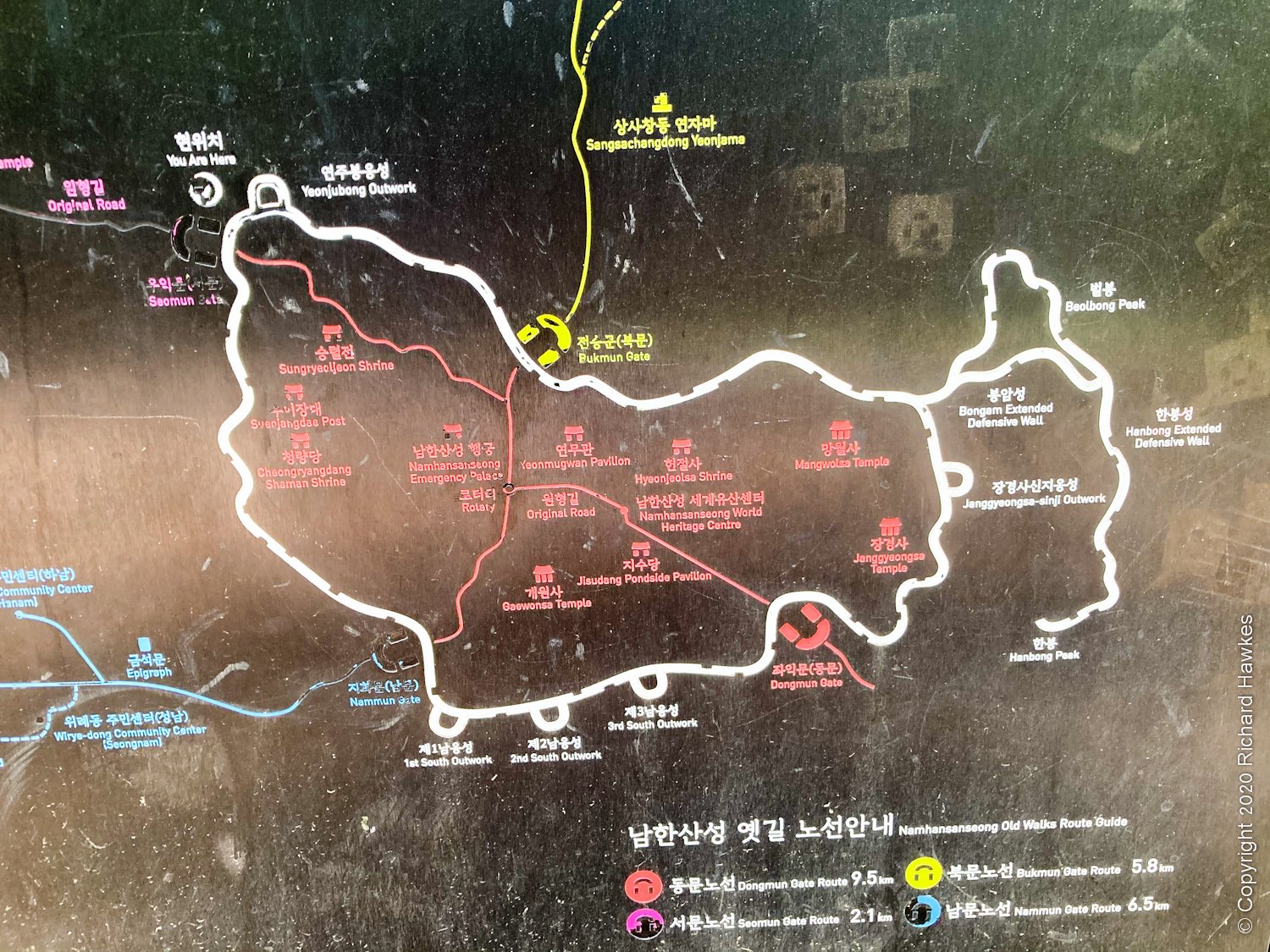 Namhansanseong (남한산성) is a mountain fortress and fortified wall in the south east of Seoul, Korea. I’ve been a few times over the years, always by taking a small green bus up the windy mountain road. I’ve been with friends and family and had a few nice meals up there in the village area, one time even finishing the evening sat by blazing fire pit at one restaurant. The fortress wall surrounds and ‘protects’ the village in the valley which is home to cafes, restaurants, historical places, and the like. This time, I decided to hike up then around te northern part of the wall, before checking out parts of the village I hadn’t seen before and relaxing at a nice coffee shop with a terrace..