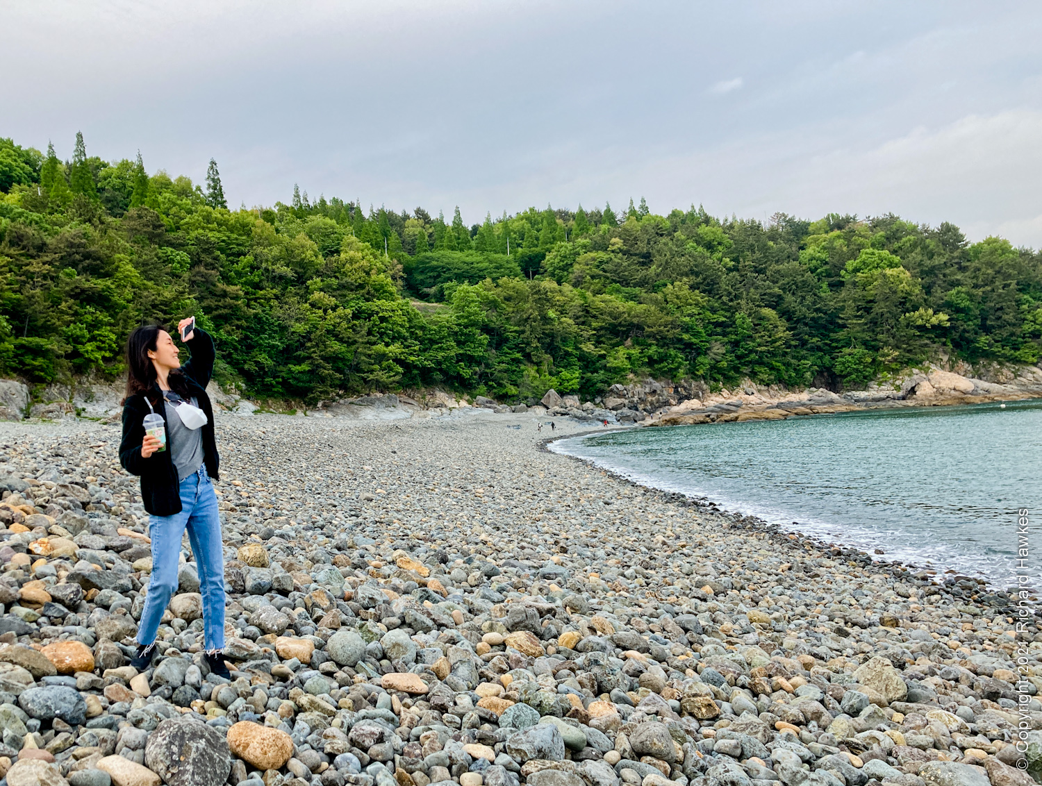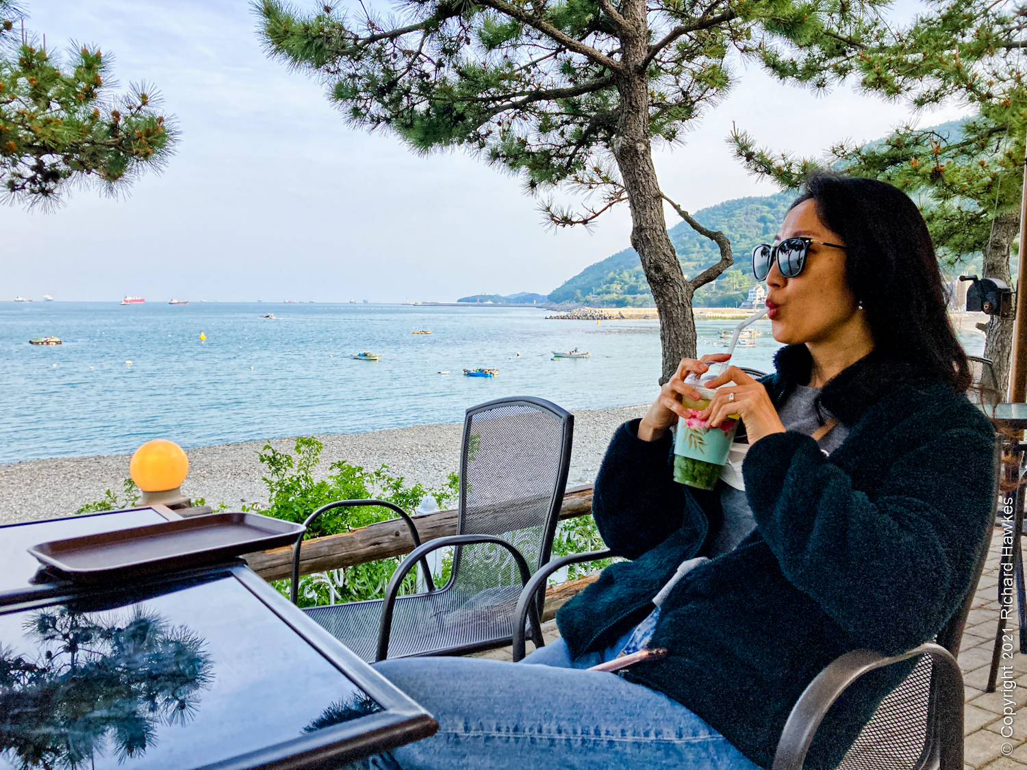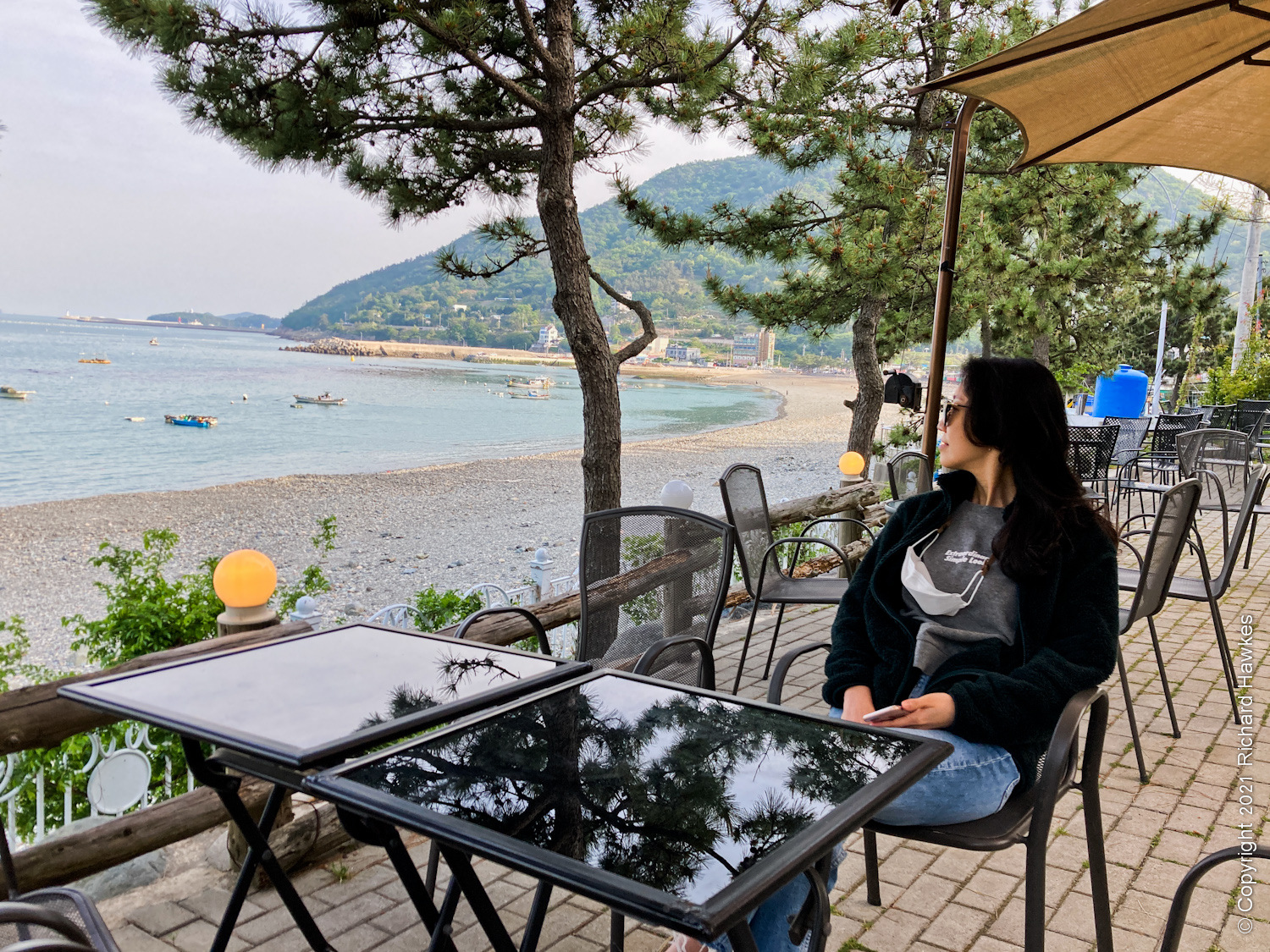 After that high-speed (not) adventure, I needed my coffee. A short drive down from the rail bike was a nice coast road with restaurants. Just as the road turns from the beach is Meriel Cafe (메리엘카페) Romana had a Mojito and I got my coffee. It’s a beautifully placed coffee shop and small hotel (pension). It has massive windows looking out over the sea, but best of all is the shady garden right next to pebbly beach. It was very relaxing, especially since no one was around and the sun was thinking about setting. We wandered onto the beach for a bit and down to the sea. We noticed some large bushes wild growing mint (they used it in the Mojito!) and rosemary; we decided to steal a few sprigs of the rosemary to take home for our next lamb dinner.