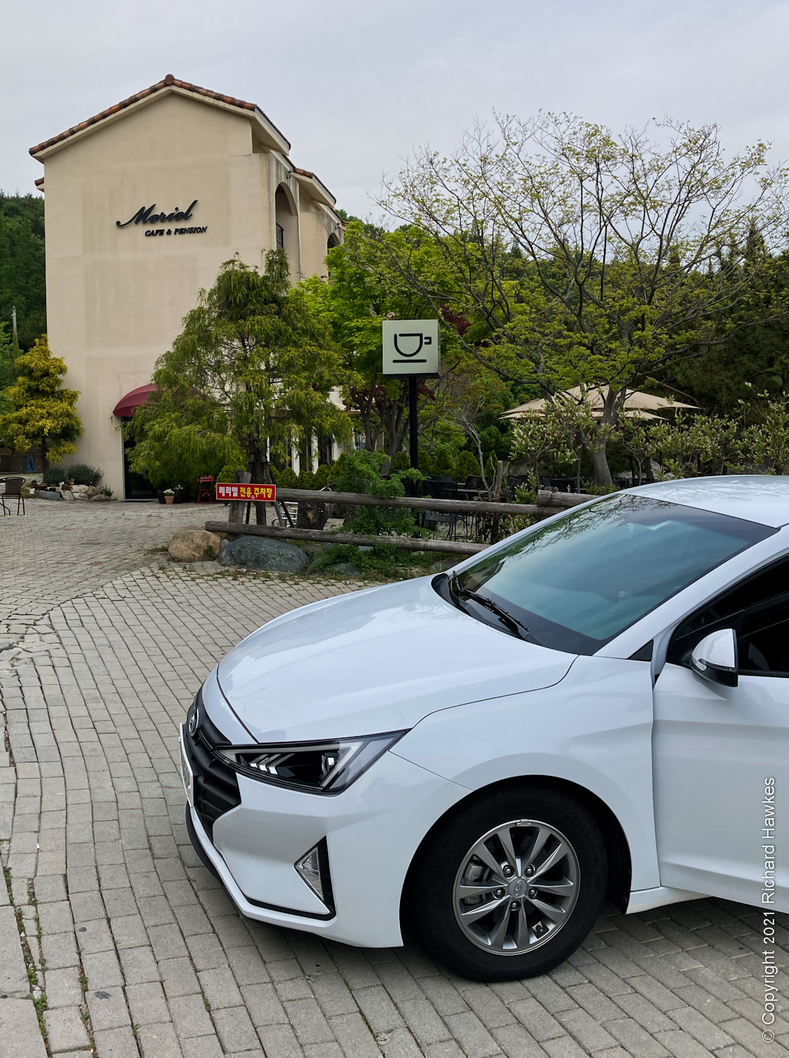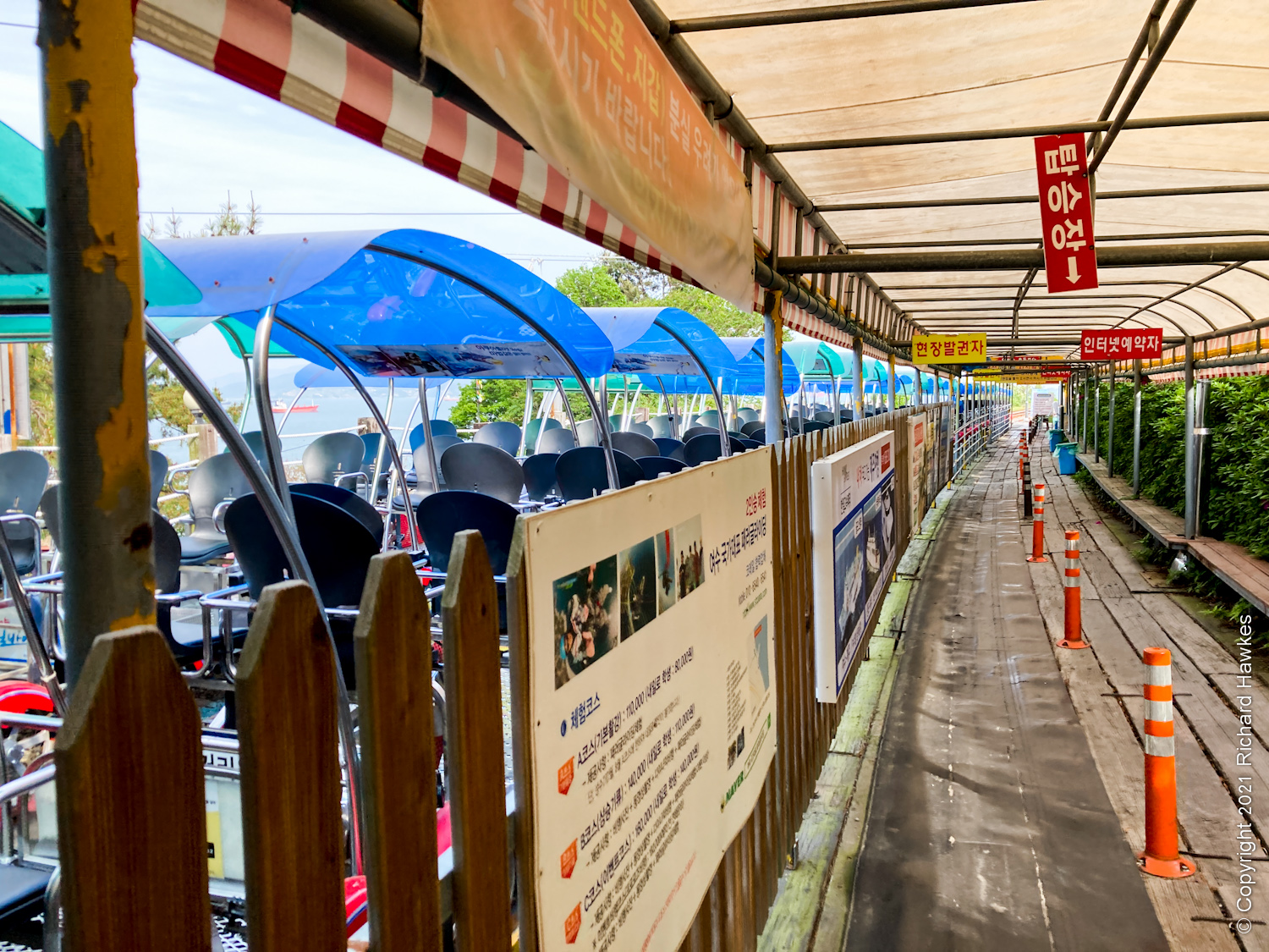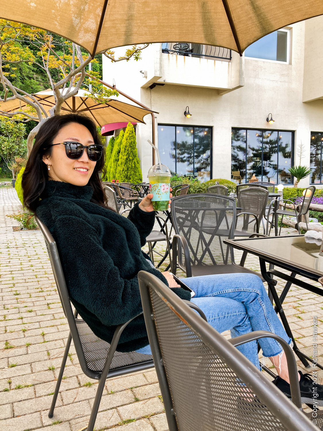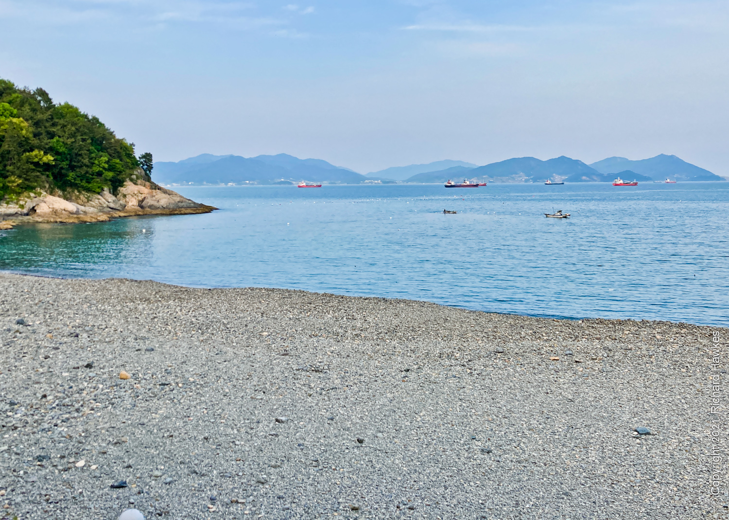After that high-speed (not) adventure, I needed my coffee. A short drive down from the rail bike was a nice coast road with restaurants. Just as the road turns from the beach is Meriel Cafe (메리엘카페) Romana had a Mojito and I got my coffee. It’s a beautifully placed coffee shop and small hotel (pension). It has massive windows looking out over the sea, but best of all is the shady garden right next to pebbly beach. It was very relaxing, especially since no one was around and the sun was thinking about setting. We wandered onto the beach for a bit and down to the sea. We noticed some large bushes wild growing mint (they used it in the Mojito!) and rosemary; we decided to steal a few sprigs of the rosemary to take home for our next lamb dinner.