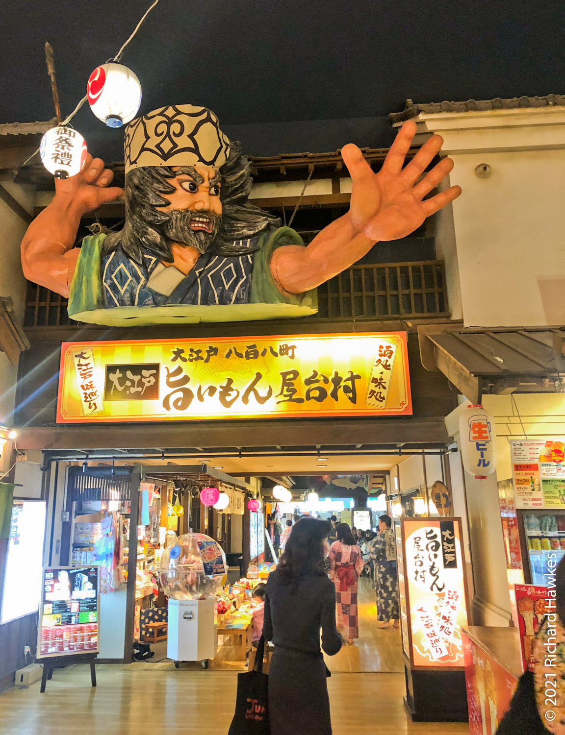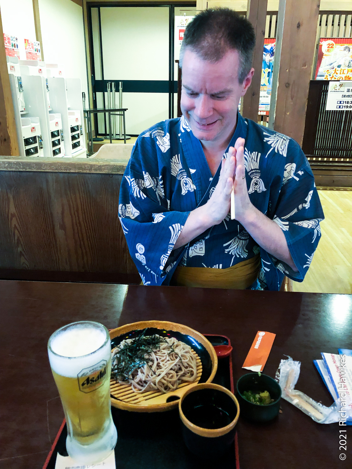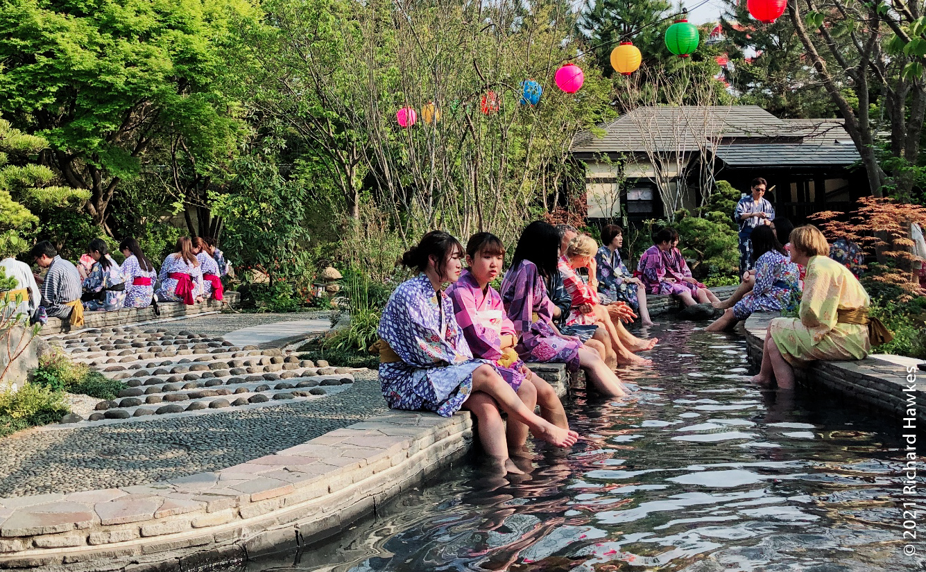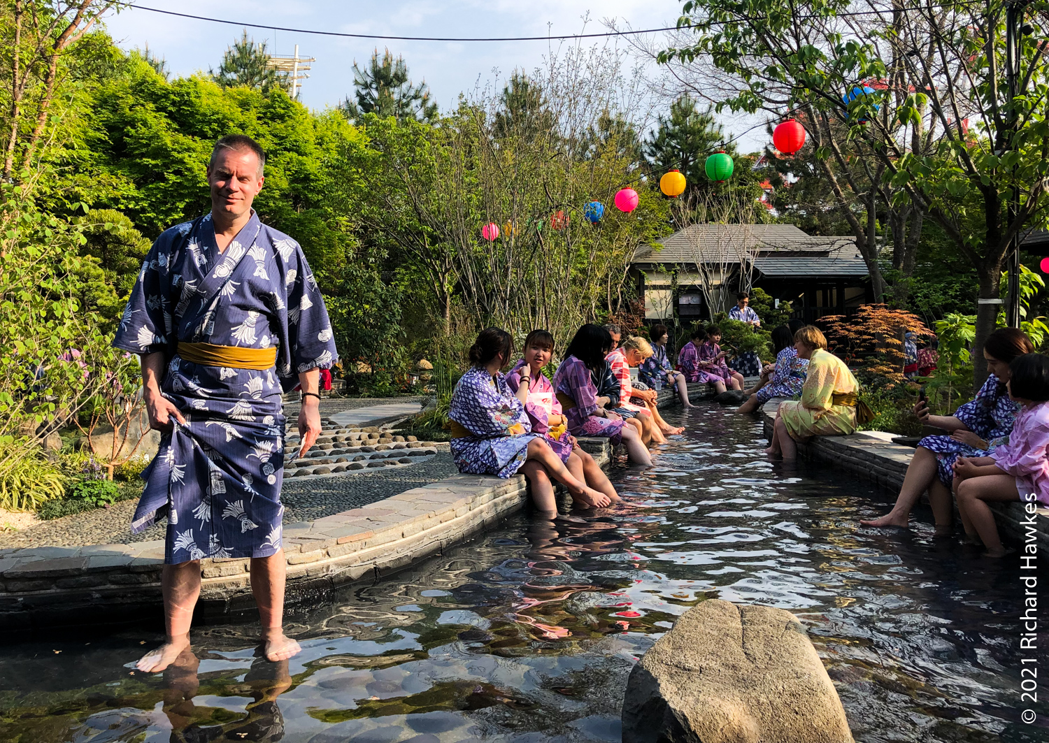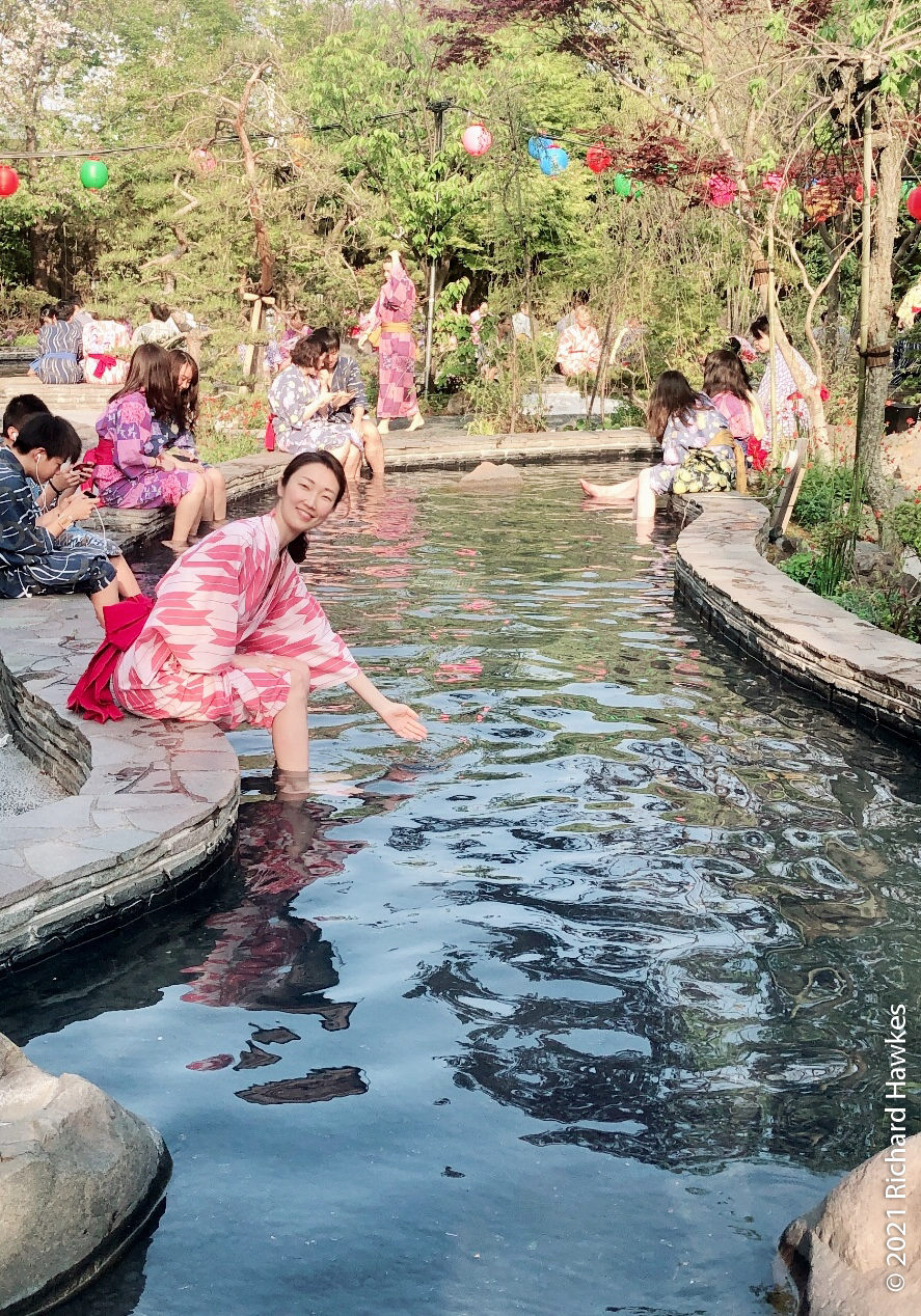 This inside area is made to look like a Japanese village. There are lots of stalls and places to sit that serve food and beer. We did the right thing and got beers. I went to the sauna for a bit (the naked area, men or women only) which was refreshing. There was one other white person in there and, of course, we locked eyes for a second; always good to bond when you’re naked in a sauna…