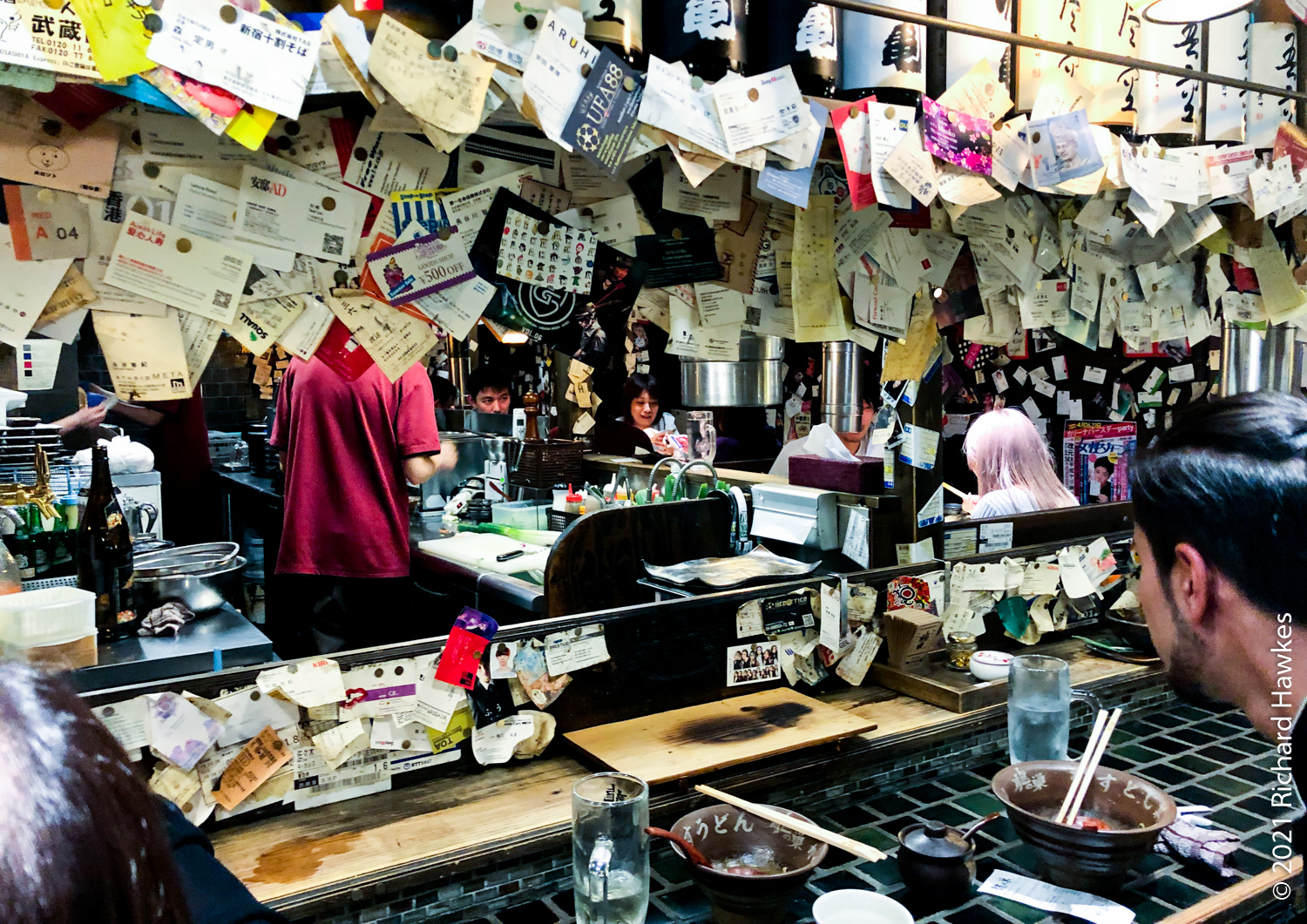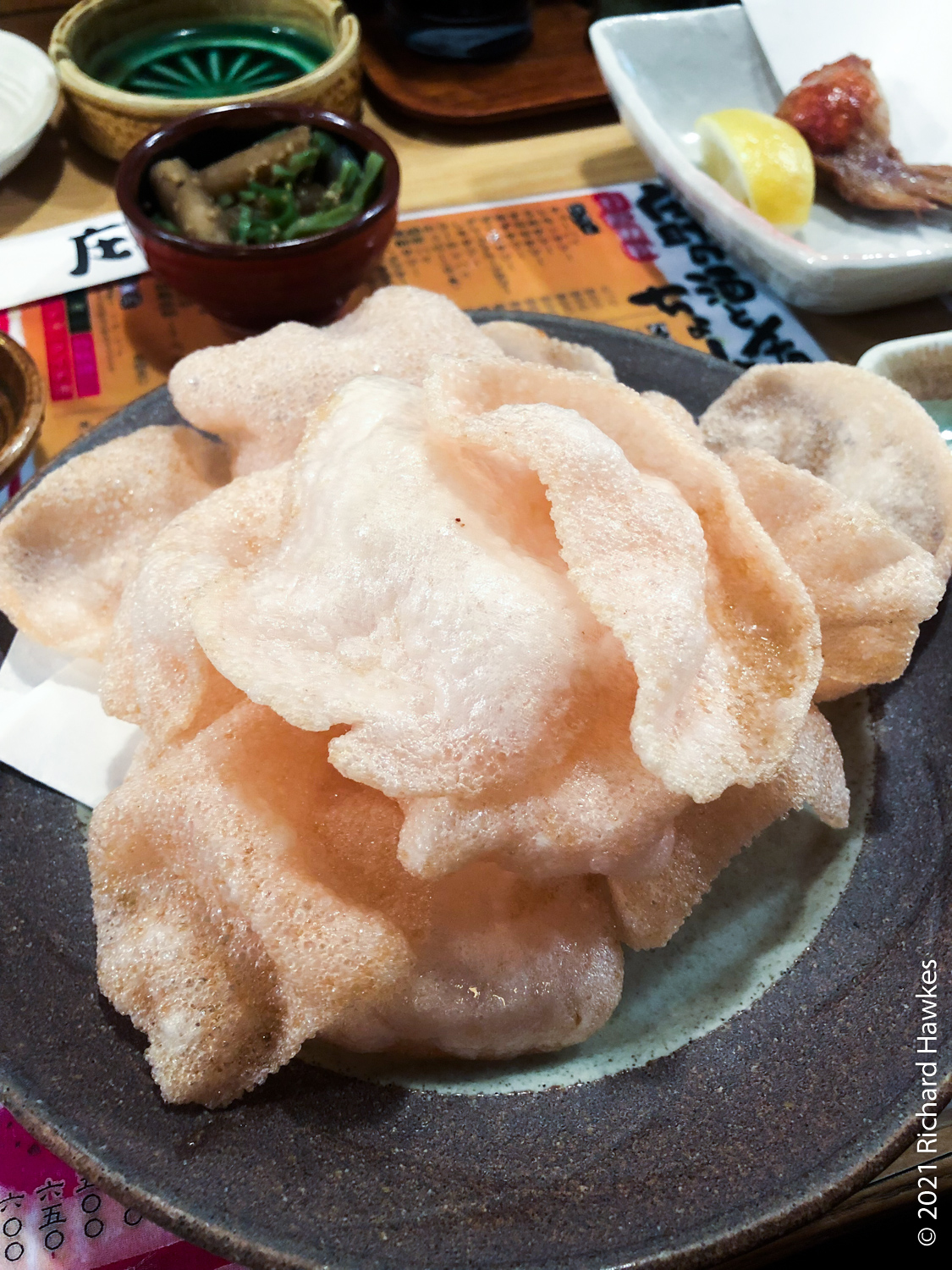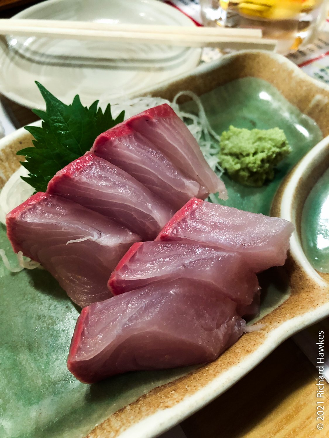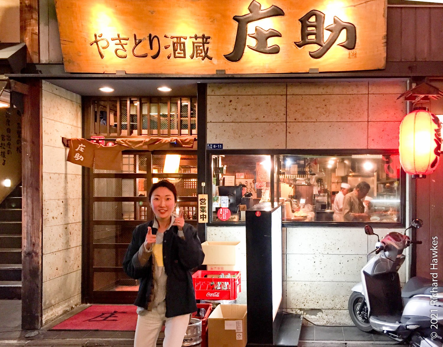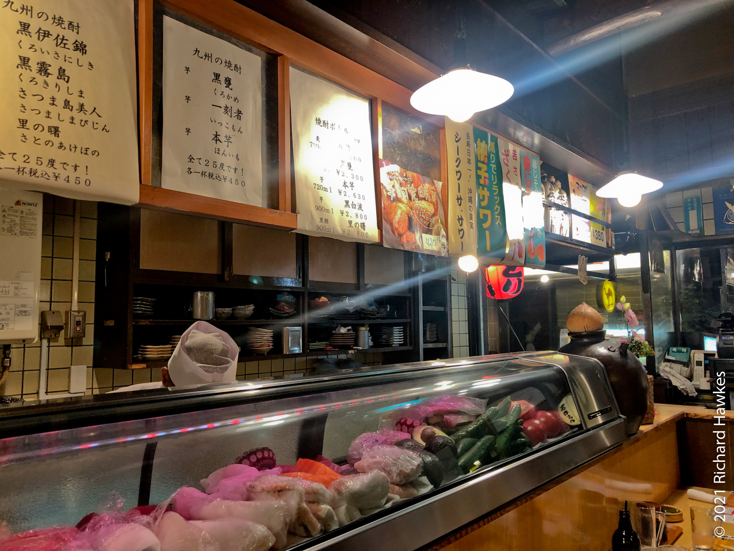 Still hungry, we wandered up one of the street to a lively izakaya that seemed to serve sashimi. It was going to close soon so we were lucky to get in. It was bust and full of well lubricated punters. Also, finally, a counter seat! One of the dishes was stuffed chicken wings which looked a bit like testicles. Anyway, loved this place and hope it survived the pandemic.