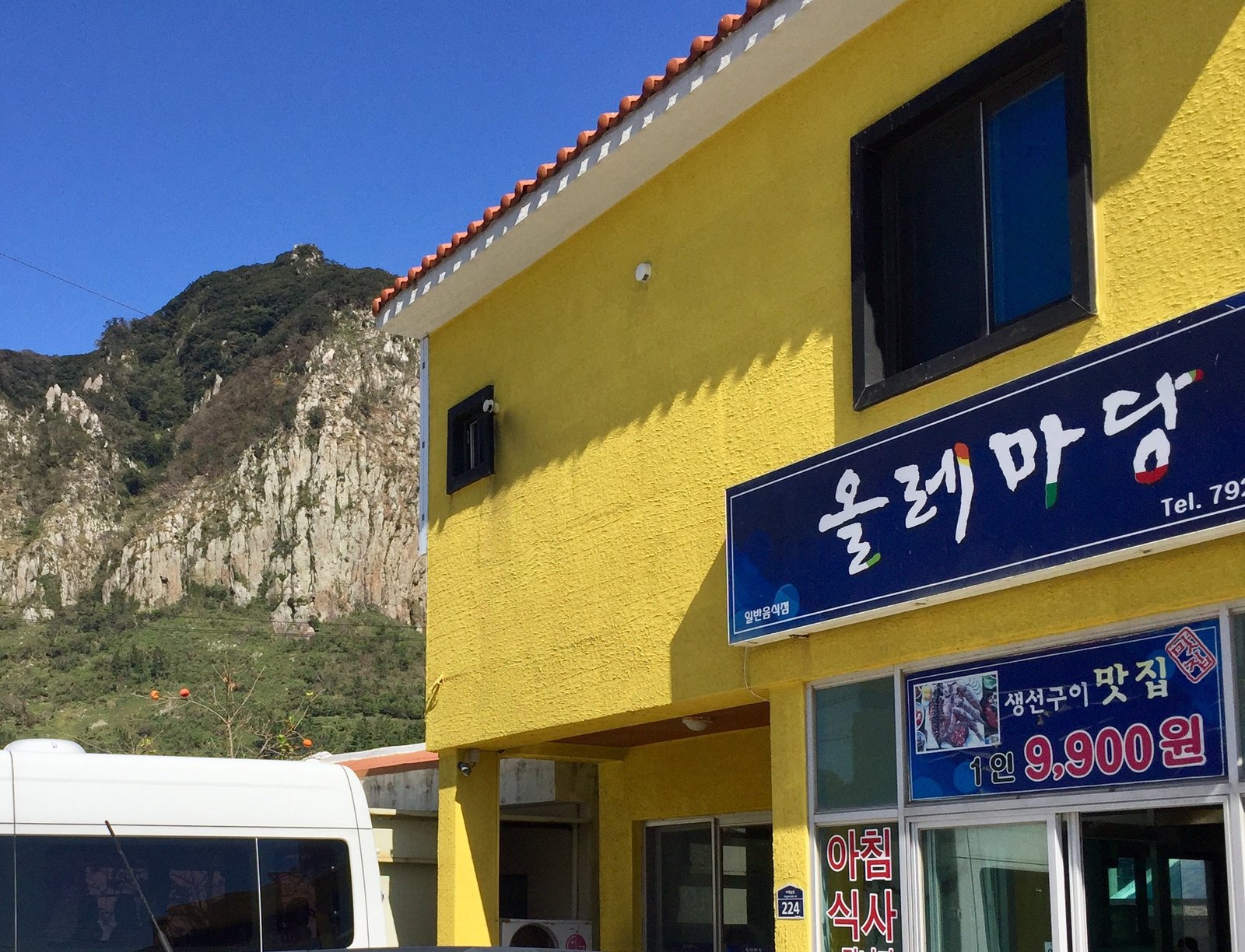 Again, I got to a restaurant just after the lunchtime rush. The surrounding area is a village, and one of the side streets I went down after lunch had your typical Jeju mandarin farm, with picturesque black stone walls.