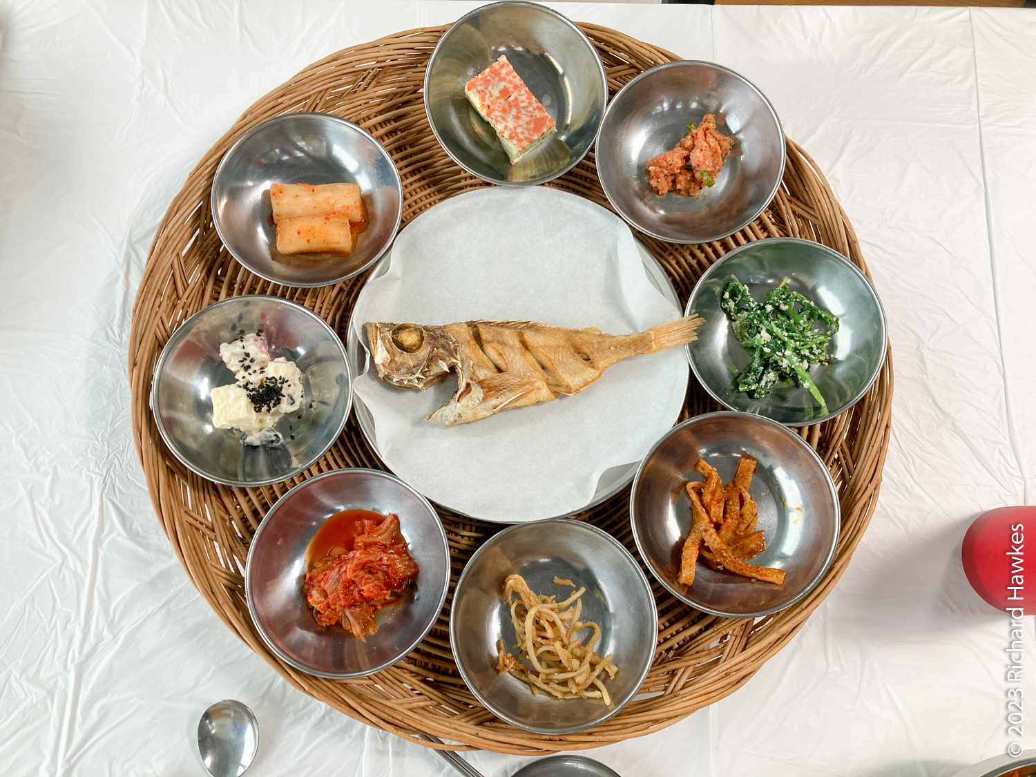 I drove south along the west coast to Janghang Beach (장항해수풀장) and stopped at Jeongwon Raw fish Restaurant (정원회식당). I had raw fish on rice, with lots of side dishes, including a small grilled fish. Very nice! It was a bit to nasty outside to visit the beach so I set off to my next planned destination.