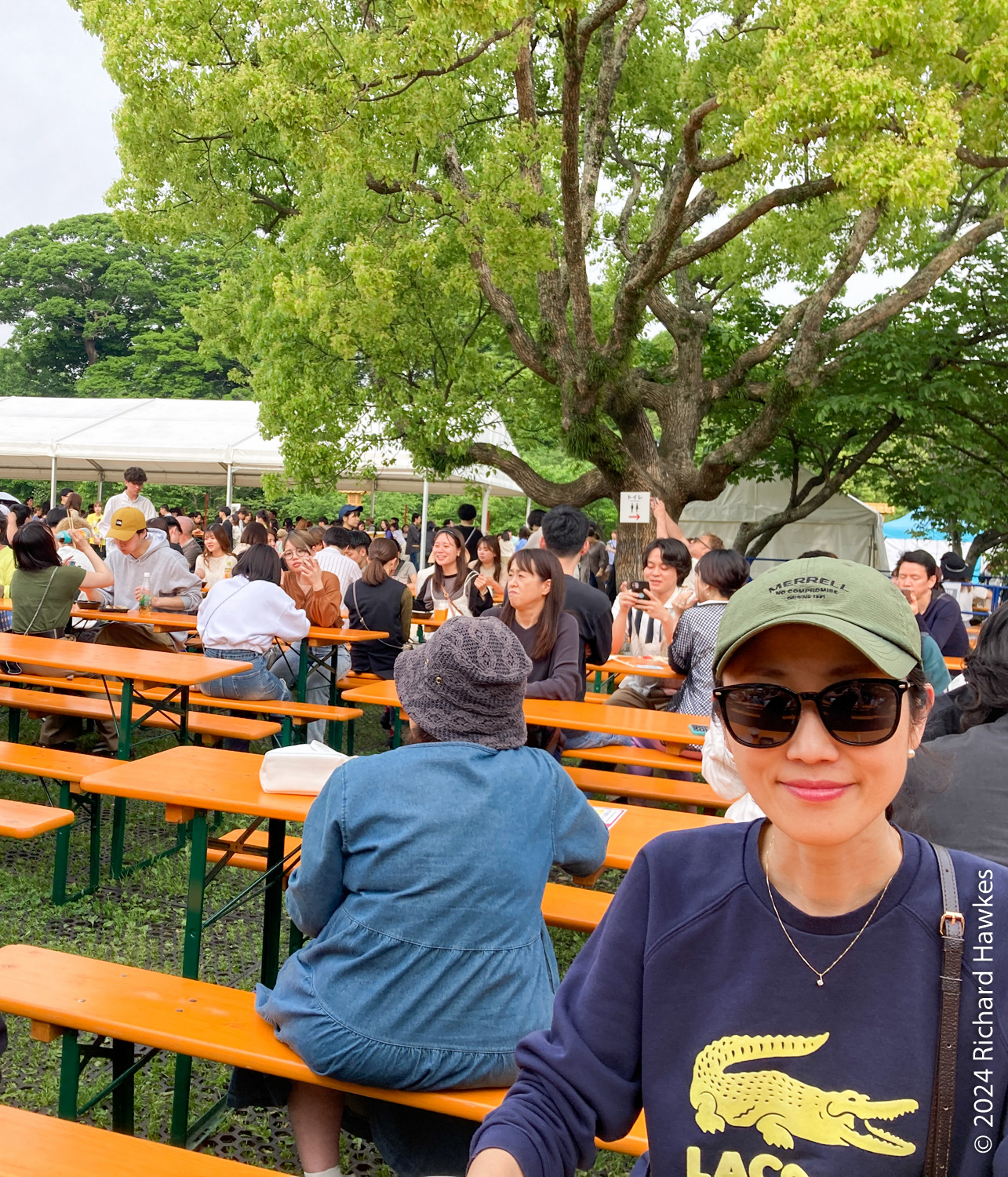 After that, we walked towards some action we’d seen while in the gardens; tents, tables, and booths in the distance. At the subway station, we’d noticed a poster for a craft gyoza festival and that must have been what we were seeing. That means we were now at Sannomaru Plaza! It wasn’t super busy, but there was a nice crowd of people sitting at temporary tables eating and drinking. At one end of the grassy plaza was a row of about ten food stalls, and on the opposite side was a ticket booth; you pay 700 yen per ticket, then use the tickets to buy your food and drink! We used Google Eye to translate the leaflet with the food information on; I wanted beef tongue dumplings, Romana wanted lemon scented pork dumplings (gyoza!). Then we grabbed a few beers and found a table and bench amongst all the other hungry gyoza eaters. It was nice sitting outside eating. I liked my tongue gyoza, though we were a bit unsure about the lemon ones!