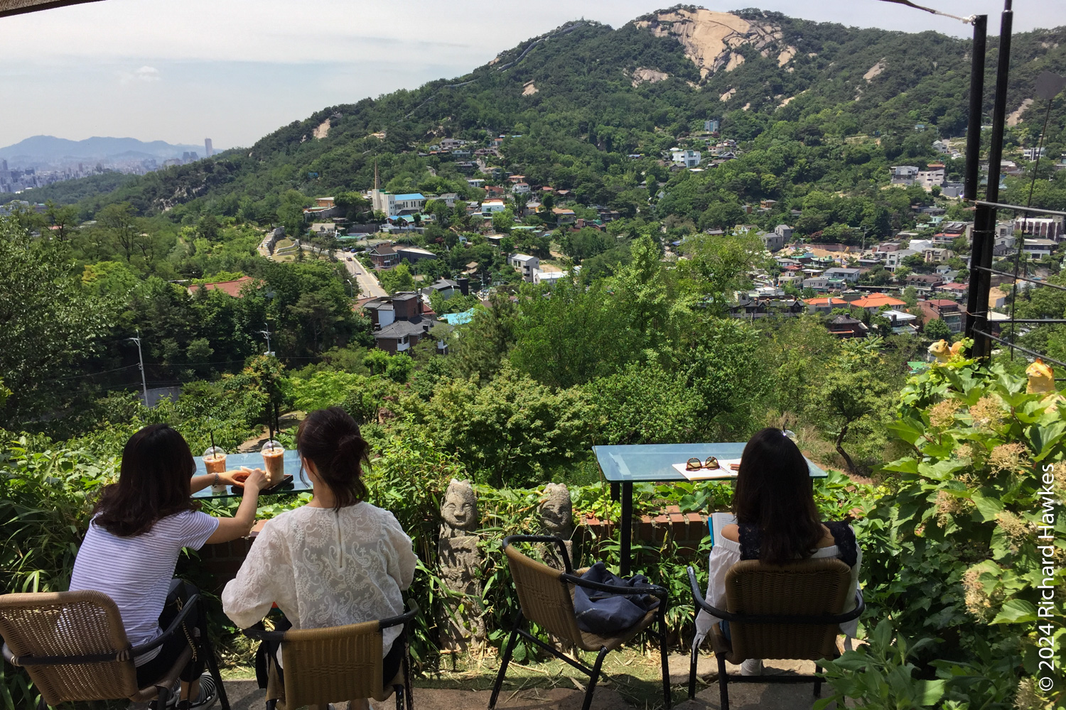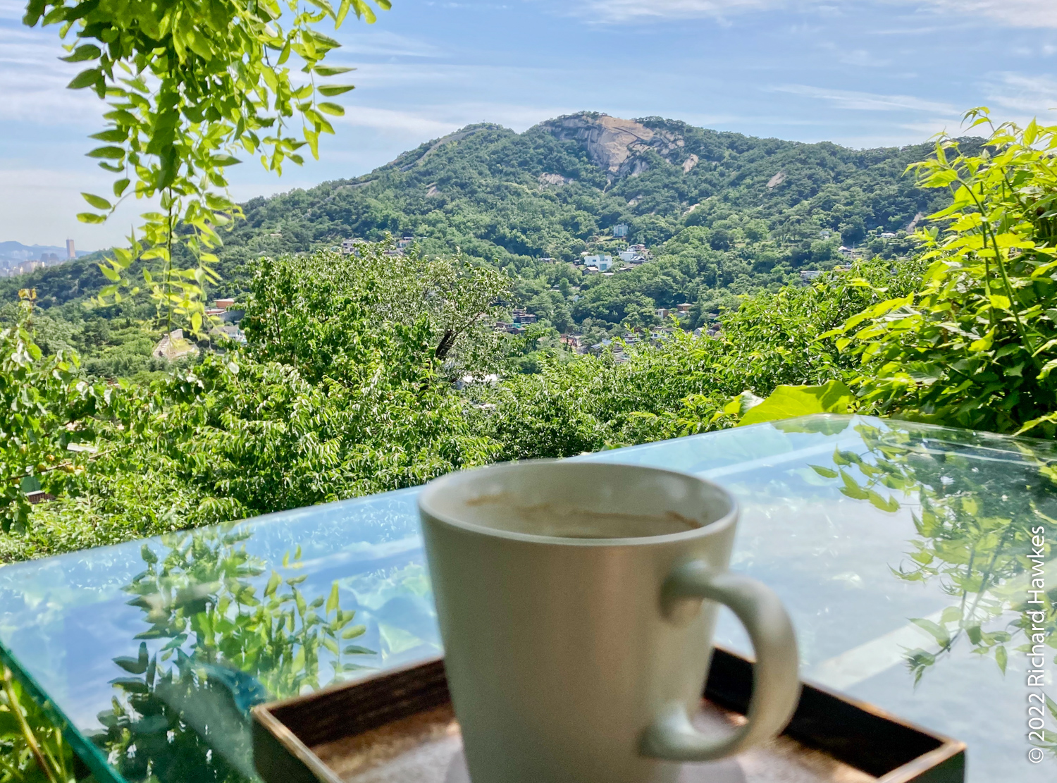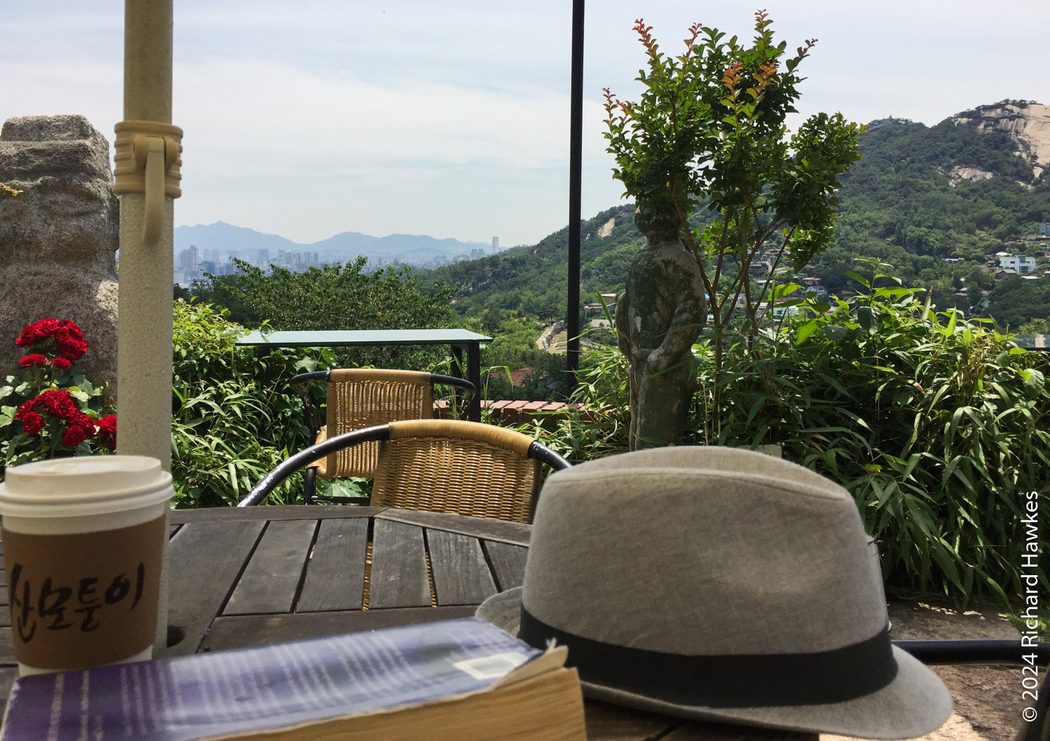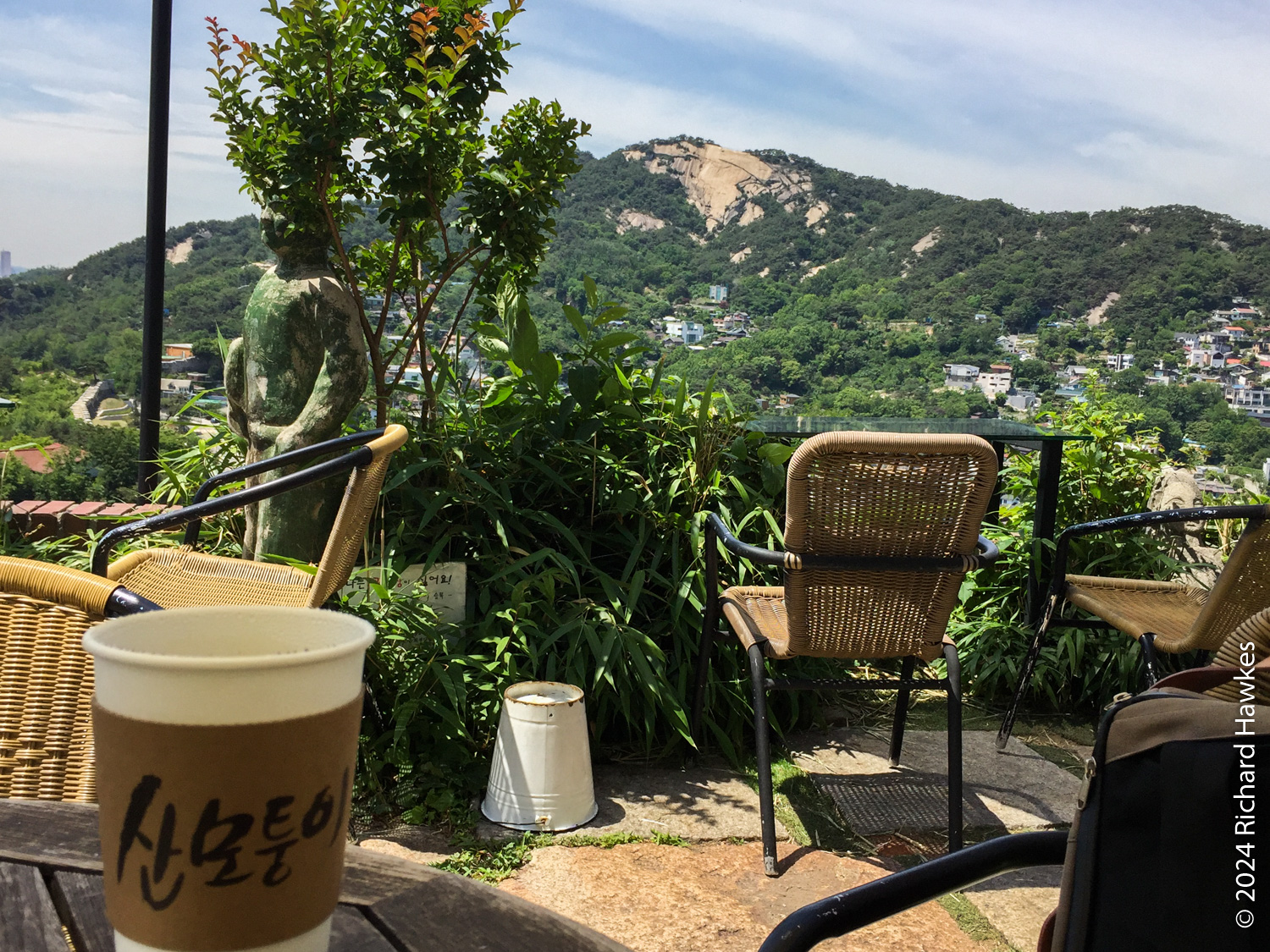 The entrance to Sangmotoongi has a yellow VW Beetle parked out front. For some reason I can’t find photos of it… It’s has an interesting interior with a few floors with nooks for sitting in and lots of windows. There’s a small terrace on the top floor. The main terrace is the garden area down some steps from the coffee counter. From there you can sit and can see the slopes of Bugaksan (북악산) and the city wall, as well as the village below. Walking along the wall up Bugaksan is a nice workout if you fancy it! I sat reading in the shade of a tree.