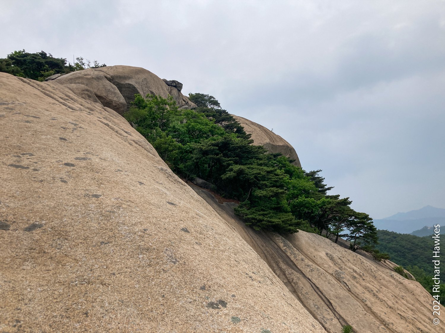 The peak itself is one you go up to then retrace your steps to come back (same as you do on Baegundae). There a a few ways up, some with handrails, others with rope. They’re not difficult at all. The amazing this about this peak is that it’s quite flat and seems to go on forever. You can walk all the way to the opposite end and start walking quite a way down a moderate slope before your nerves tell you to stop! I took quite a long break and ate my packed lunch. I stayed for almost an hour, not because I needed the rest, but because of the location! The views across the valley are great, too. On this day, however, it was quite hazy. The last two photos here were taken in 2023.