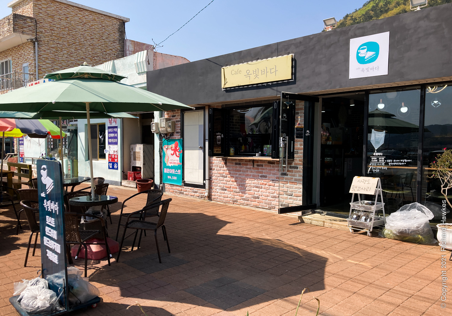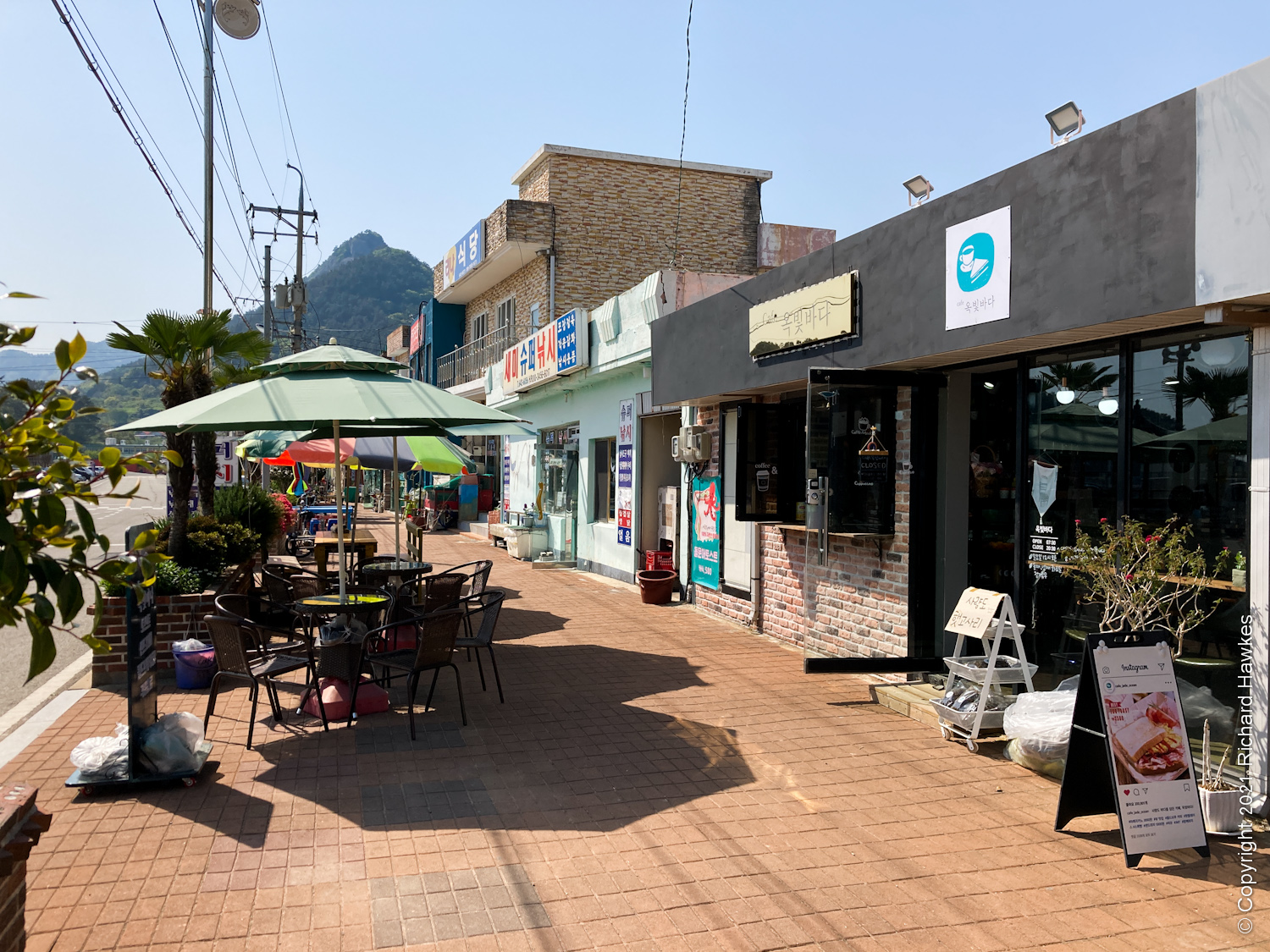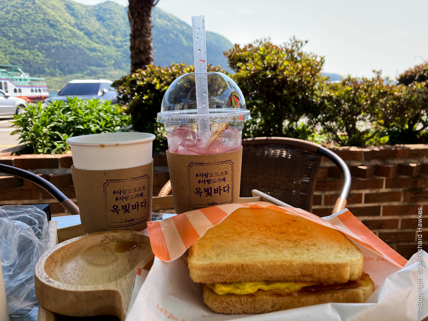 Next I went to the ferry ticket office to get the next ferry out and just caught the ticket seller before she left for lunch. I had a few hours to kill so grabbed a coffee, grapefruit juice, and cheese and ham toasted sandwich at a harbour coffee shop and sat at a street table looking over to the next island across the harbour. The ferry ride back was uneventful and back on Tongyeong, I drove to a coffee shop called Cafe de Antwerp (another post) before heading back near the hostel. I finished the evening with a (better) samgyetang then went to the hostel for a shower and beer before bed. What a great day!