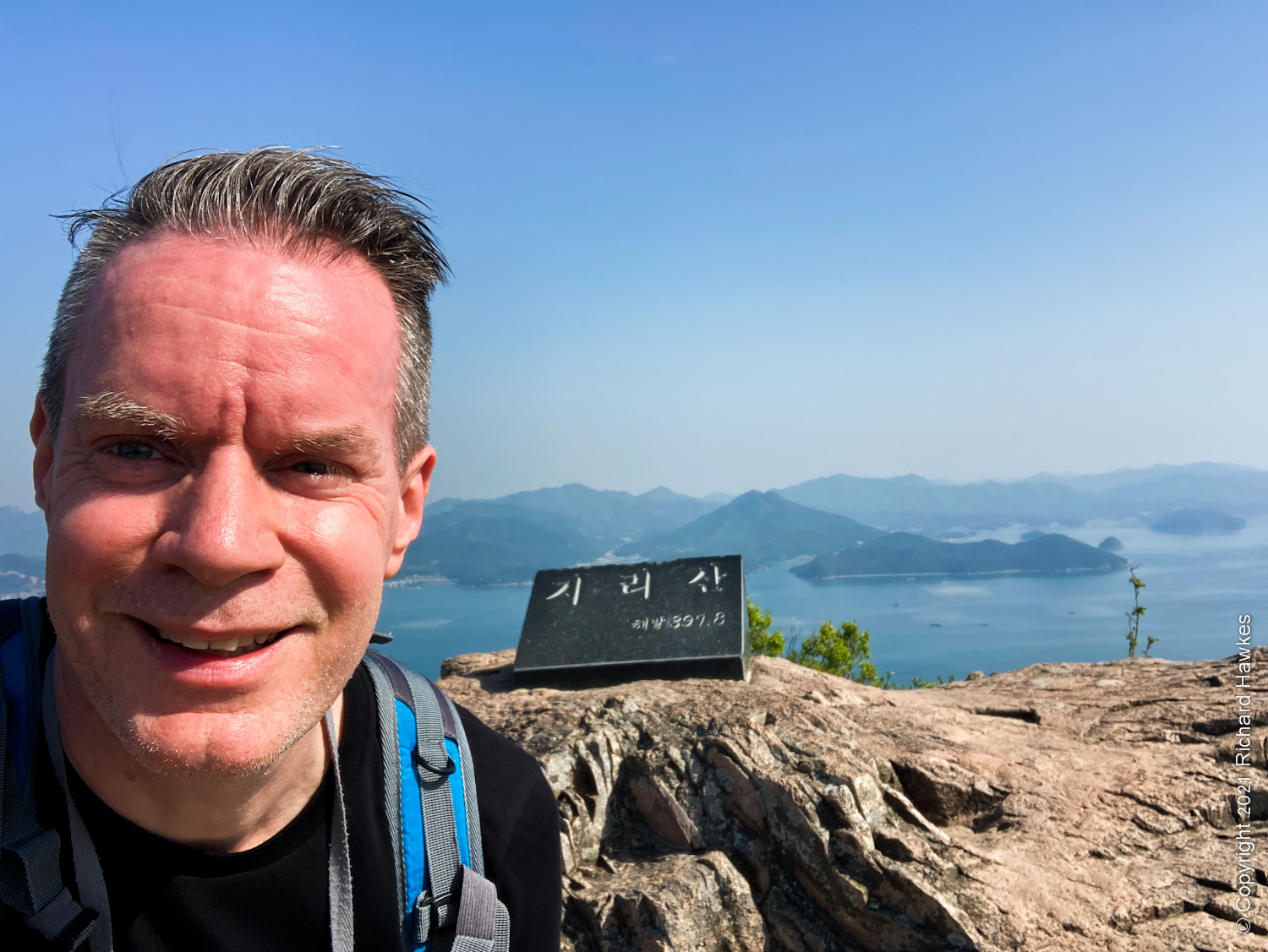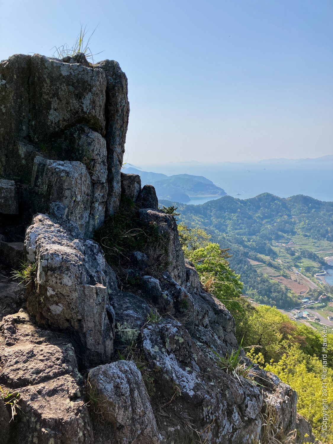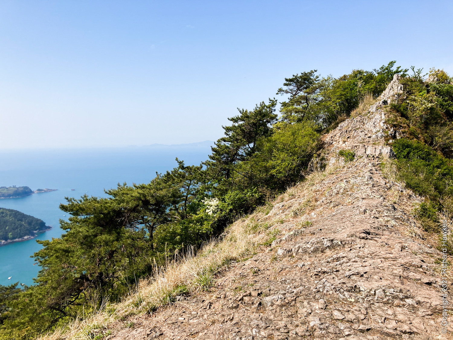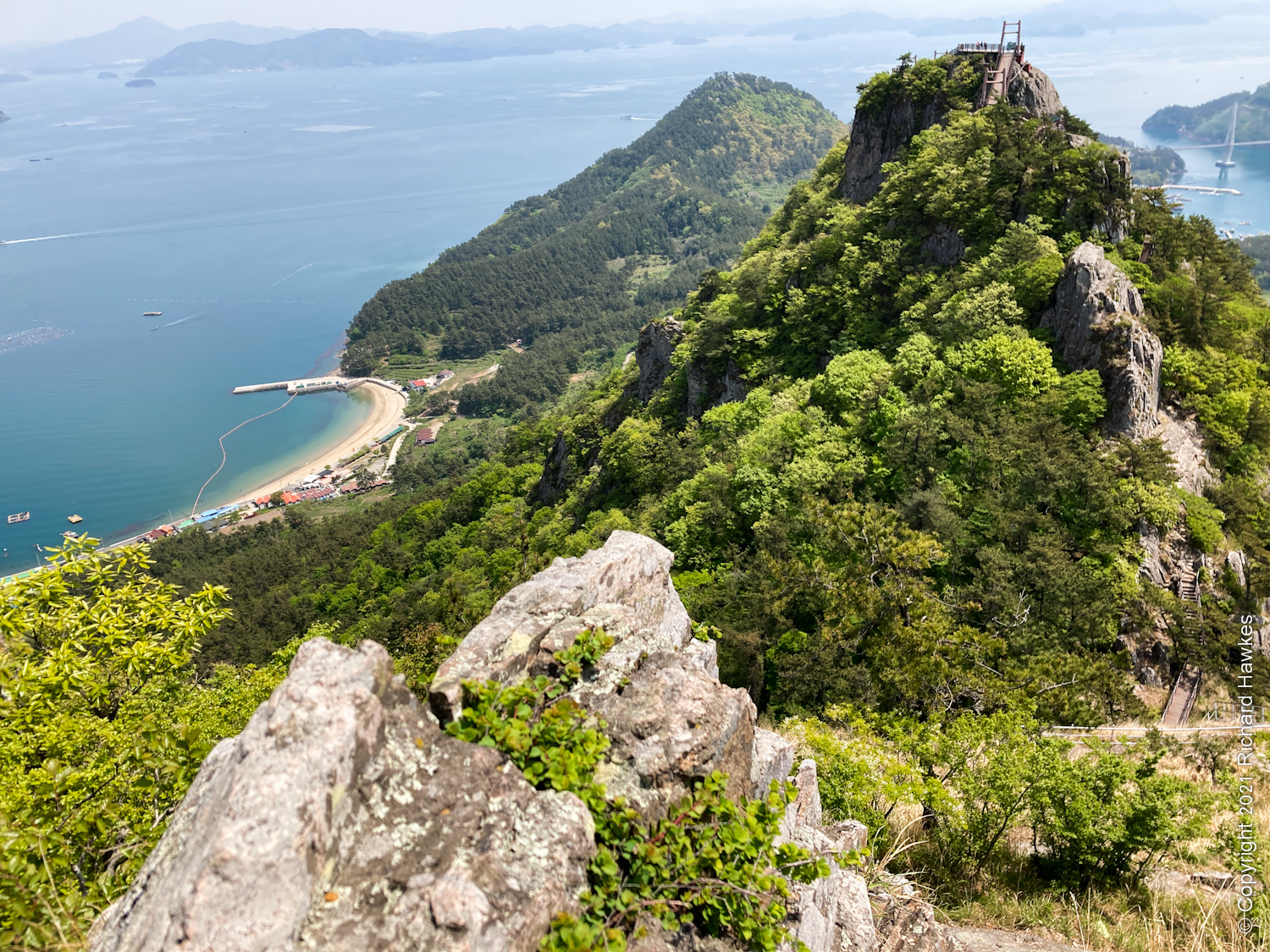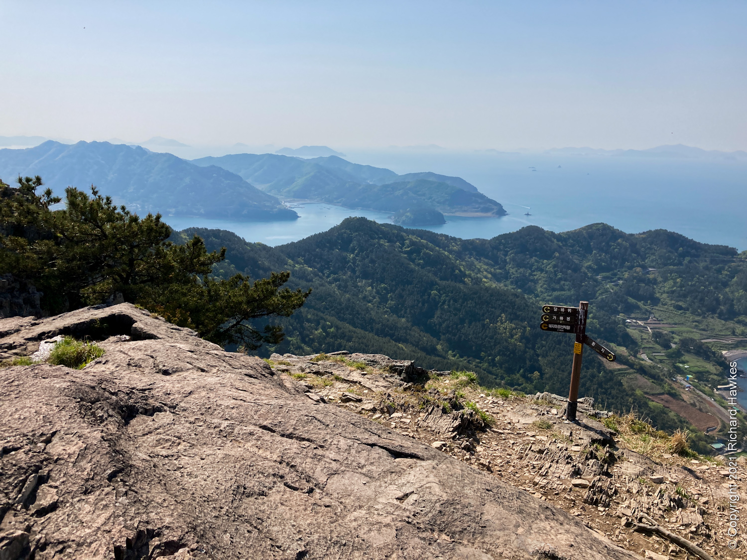 After a few scambles I was at ridge with an amazing view to the sea in the west and the harbour village of Donji below. The skies were a little hazier than I’d hoped (we’d had a few very clear days in Seoul recently so I was feeling spoiled!) but clear enough to enjoy. I some sections on the ridge the trail wasn’t too obvious to me and the going can be a bit tricky if you go left or right a bit to far. Mostly though, it was pretty straight forward here (literally). The trail was quite well maintained and some sections were clearly marked off limits. I got to the first marked peak of Saryangdo Jirisan. After that, unfortunately, I went a bit too far to my right at some point and the trial started looking a little less like a trail! I checked Naver maps and could see I was a little off the trial which was above me. I could no longer go forward but guessed if I scrambled up the steep rock face on my left, I’d get back to it. This is always risky, not least because the map apps aren’t always the most reliable with the GPS placements, and also, there might not be an easy way off the rock if it went down the other side. Anyway I went for it with my heart beating and trying not to look back (there’s no way I’d be climbing down this!) and it turned out fine. I had cut my little finger though on the sharp rock but hadn’t noticed in my half panic till I’d calmed down a bit. But…the views :o)
