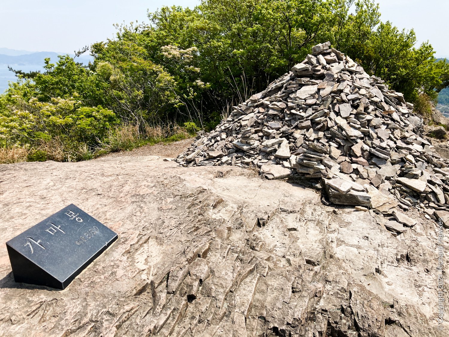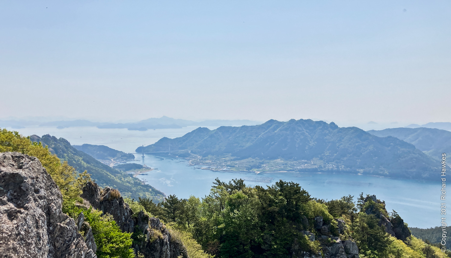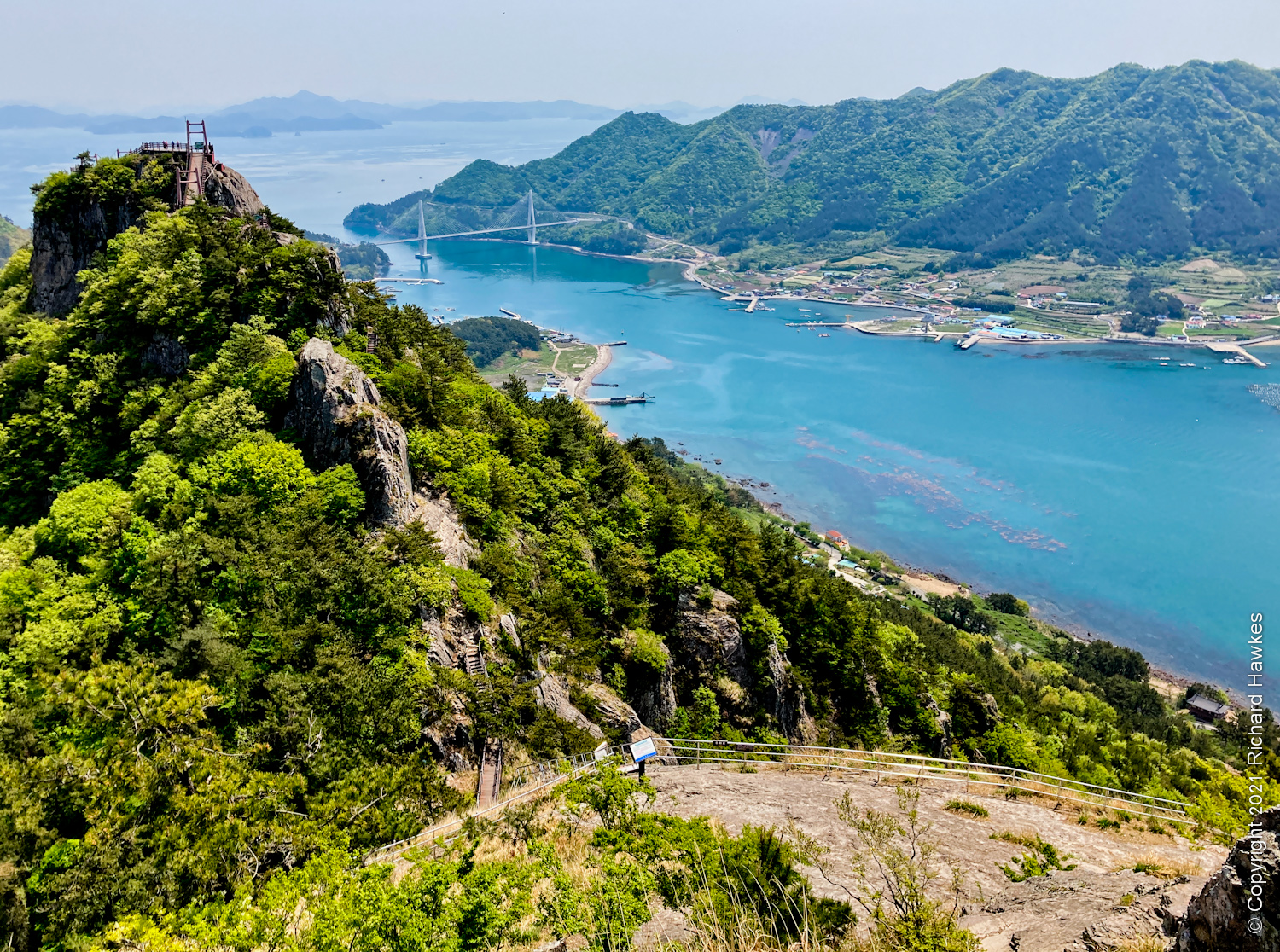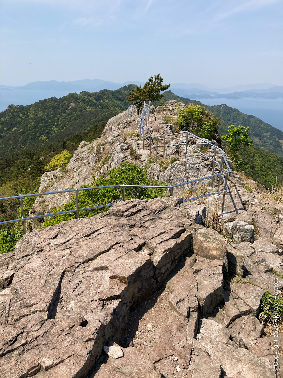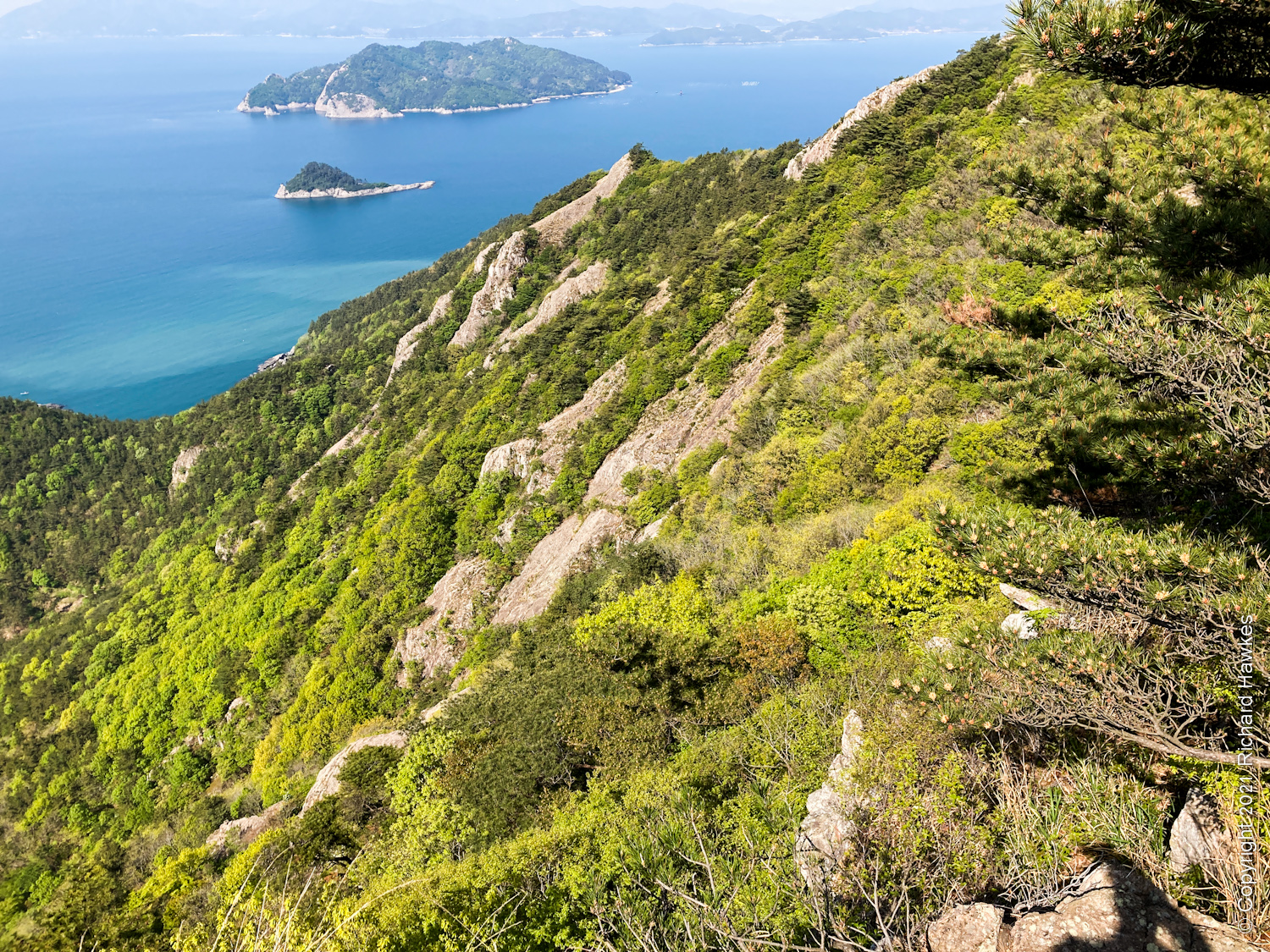 After a few scambles I was at ridge with an amazing view to the sea in the west and the harbour village of Donji below. The skies were a little hazier than I’d hoped (we’d had a few very clear days in Seoul recently so I was feeling spoiled!) but clear enough to enjoy. I some sections on the ridge the trail wasn’t too obvious to me and the going can be a bit tricky if you go left or right a bit to far. Mostly though, it was pretty straight forward here (literally). The trail was quite well maintained and some sections were clearly marked off limits. I got to the first marked peak of Saryangdo Jirisan. After that, unfortunately, I went a bit too far to my right at some point and the trial started looking a little less like a trail! I checked Naver maps and could see I was a little off the trial which was above me. I could no longer go forward but guessed if I scrambled up the steep rock face on my left, I’d get back to it. This is always risky, not least because the map apps aren’t always the most reliable with the GPS placements, and also, there might not be an easy way off the rock if it went down the other side. Anyway I went for it with my heart beating and trying not to look back (there’s no way I’d be climbing down this!) and it turned out fine. I had cut my little finger though on the sharp rock but hadn’t noticed in my half panic till I’d calmed down a bit. But…the views :o)