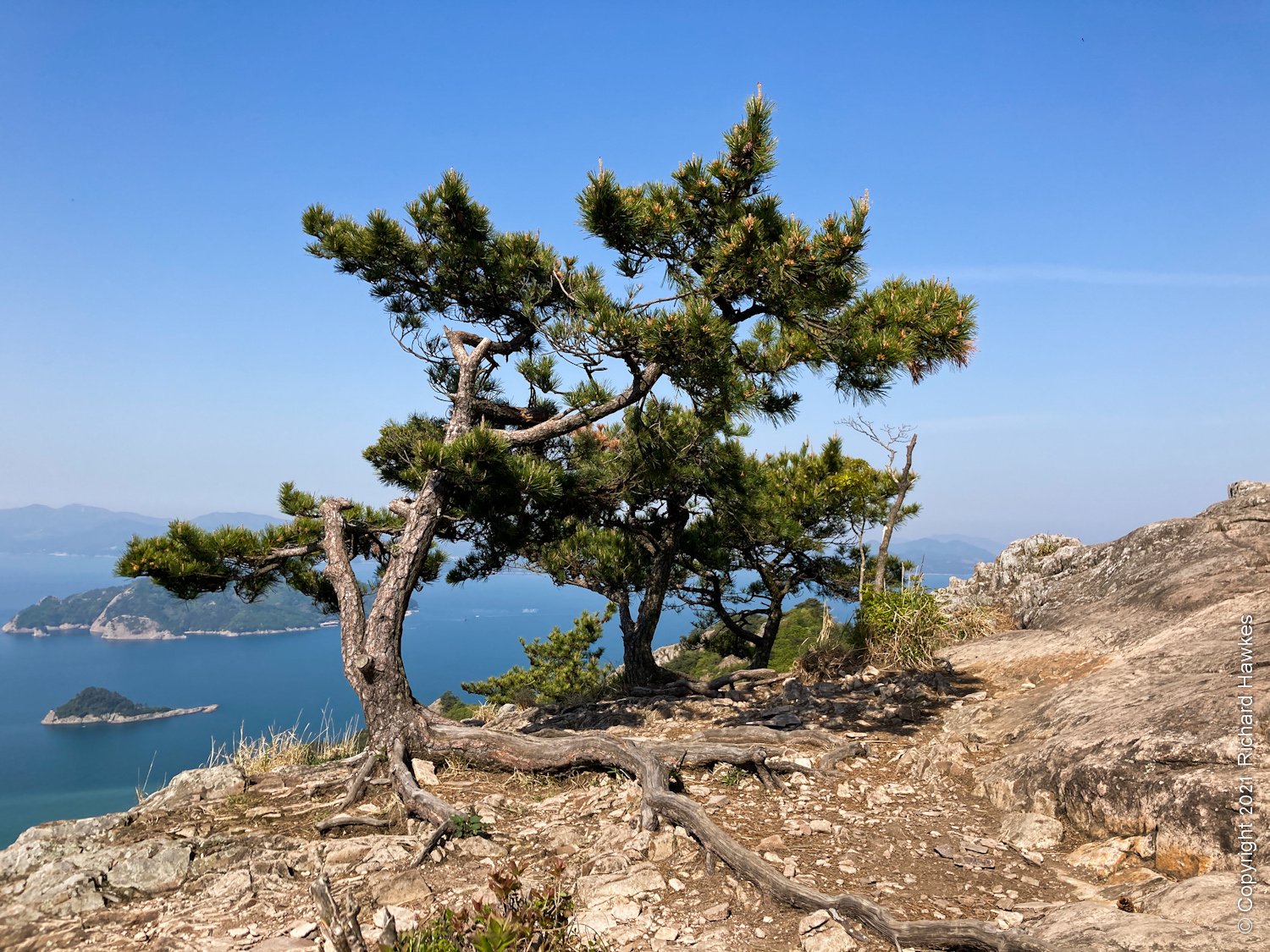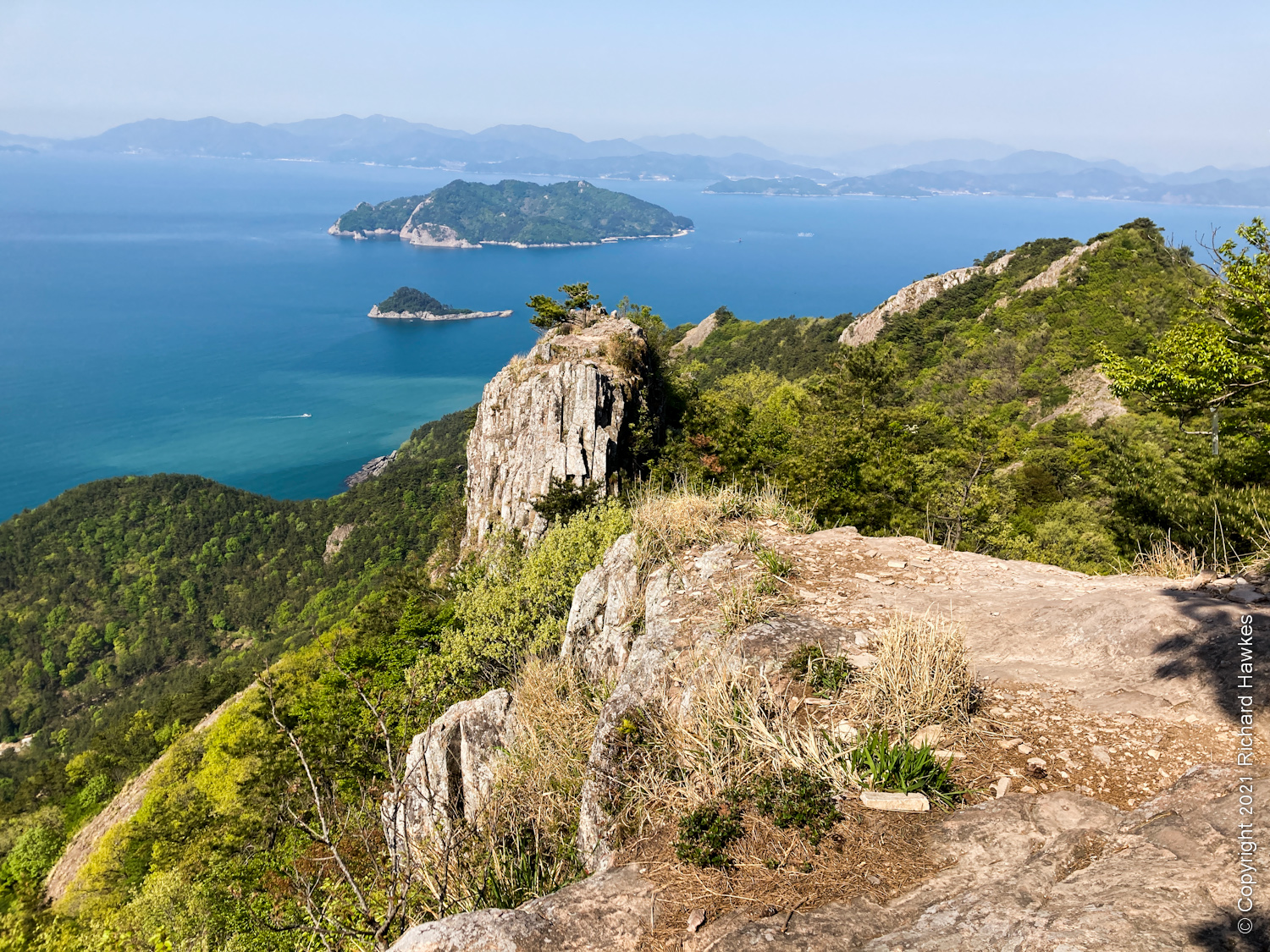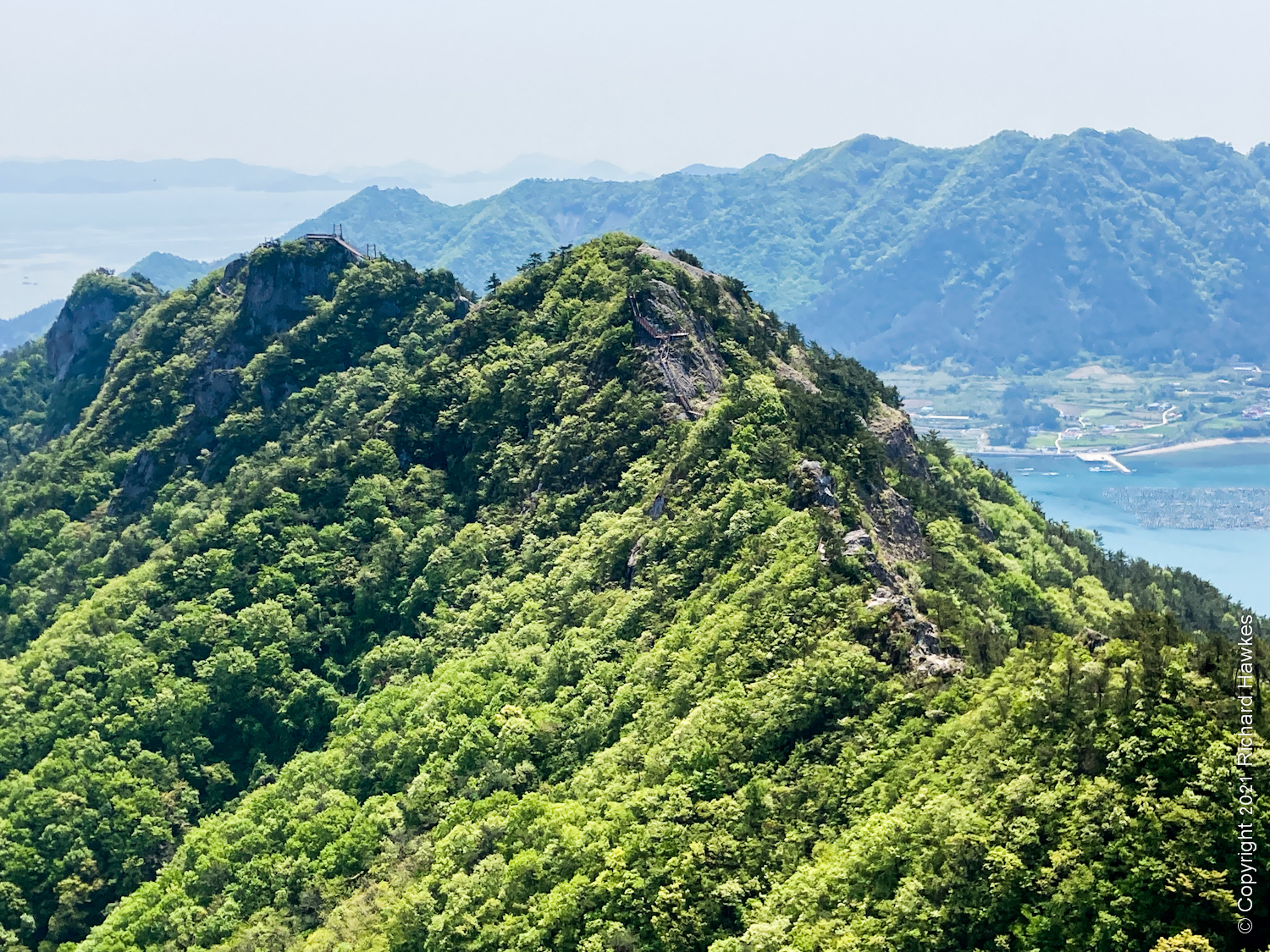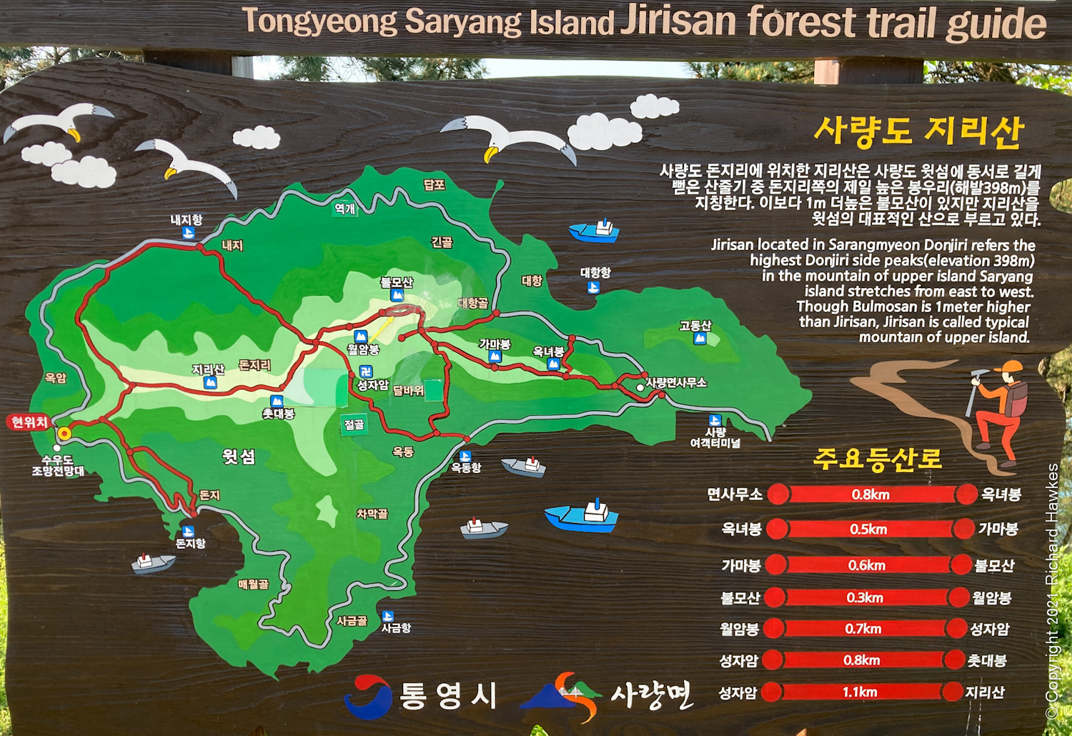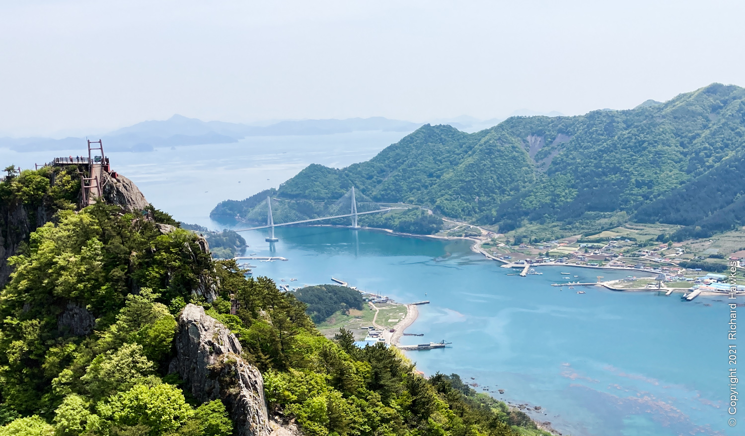 After a few scambles I was at ridge with an amazing view to the sea in the west and the harbour village of Donji below. The skies were a little hazier than I’d hoped (we’d had a few very clear days in Seoul recently so I was feeling spoiled!) but clear enough to enjoy. I some sections on the ridge the trail wasn’t too obvious to me and the going can be a bit tricky if you go left or right a bit to far. Mostly though, it was pretty straight forward here (literally). The trail was quite well maintained and some sections were clearly marked off limits. I got to the first marked peak of Saryangdo Jirisan. After that, unfortunately, I went a bit too far to my right at some point and the trial started looking a little less like a trail! I checked Naver maps and could see I was a little off the trial which was above me. I could no longer go forward but guessed if I scrambled up the steep rock face on my left, I’d get back to it. This is always risky, not least because the map apps aren’t always the most reliable with the GPS placements, and also, there might not be an easy way off the rock if it went down the other side. Anyway I went for it with my heart beating and trying not to look back (there’s no way I’d be climbing down this!) and it turned out fine. I had cut my little finger though on the sharp rock but hadn’t noticed in my half panic till I’d calmed down a bit. But…the views :o)