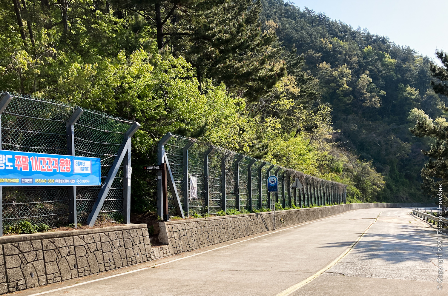 The blogs I’d read all advised a west to east trek which means getting a bus from the harbour area. After getting off, I made a note of where the ferry office was but decided not to get my return ticket since the ferry hadn’t been busy. As I got to the main road, a bus honked and pulled up so I just got on. I was able to use the transit card I use in Seoul: NICE! The bus had a few obvious hikers on board (how did they get on before me…?) and the ride to the west side was pretty cool. I was expecting to get off at a small harbour village called Donji (돈지) but the driver stopped the other hikers and said something in Korean which in hindsight was “Get off at the next stop if you’re hiking!” so I stayed. We went a few more minutes up quite a steep road and got off at a view point and what seemed to be a proper entrance to the trail. I stopped for a few photos from the view point, then crossed the road to begin the real adventure.