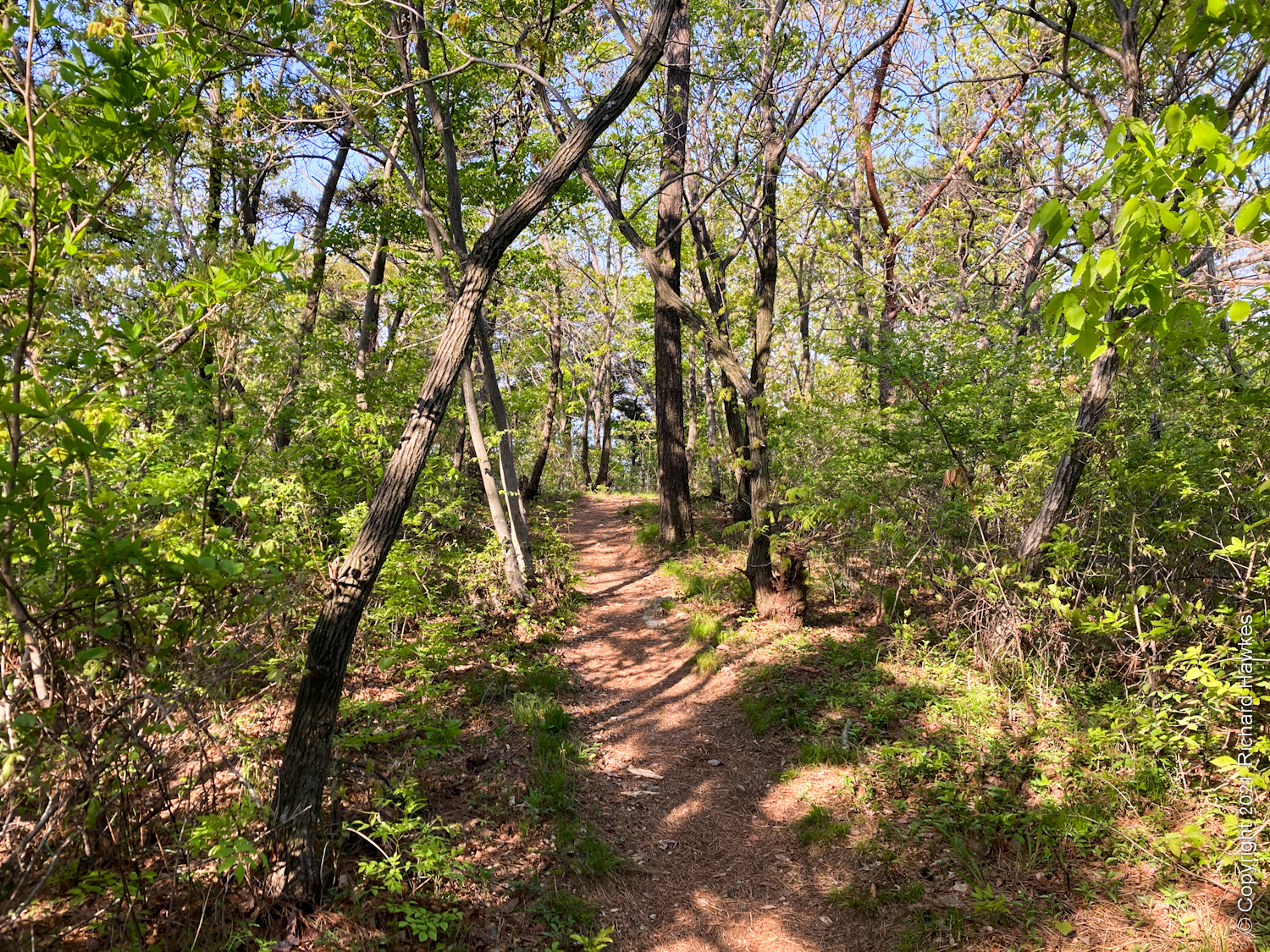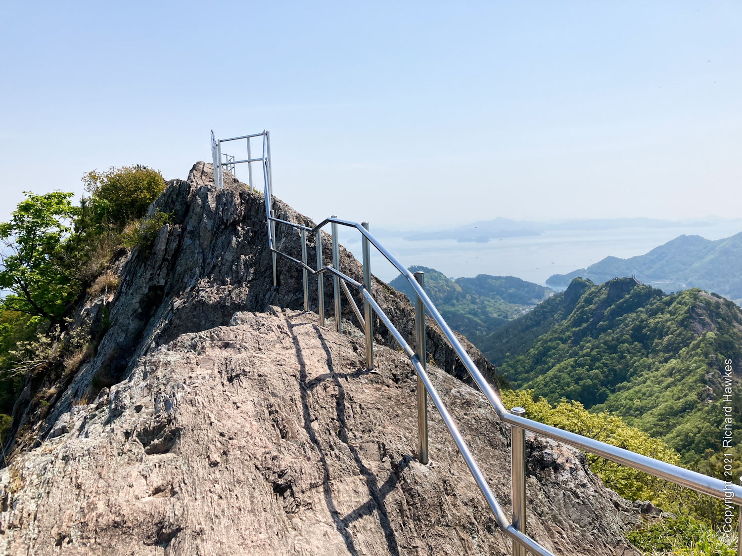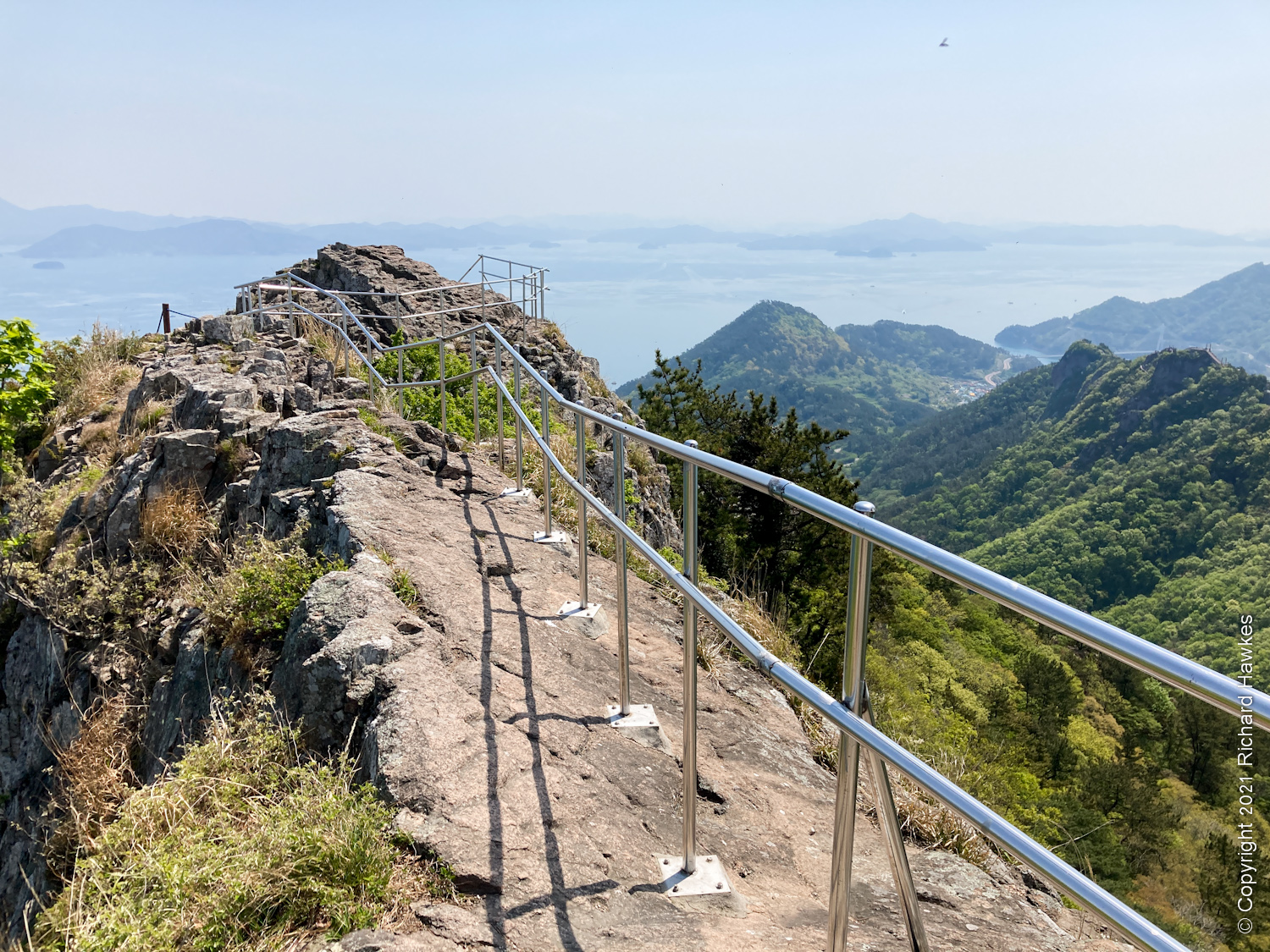 I was going to be approaching the main ridge which I think is call Dalbawi (달바위) on Bulmosan (불모산). I could see some wooden steps leading that way. Up by the steps was a sign advising it was a bit dangerous and to take the detour around… well with wooden stairs, how dangerous could it be? Up the stairs and to more rock then suddenly the narrow ridge with (fortunately for me) a sturdy steel handrail running the length. I followed it along, carefully and wasn’t actually nervous; the rail was solid and the rock wasn’t too narrow beneath apart from in a few places. However, if there’s been no rail, I’d probably have been going along on all fours! I stopped for a bit in the middle to take some crappy video and admire the excellent 360 degree views; it was fantastic. A bit further on was a tree and shade so I decided to picnic. No cats up here, but there was an inquisitive bird or two.